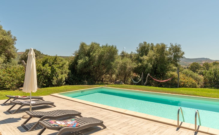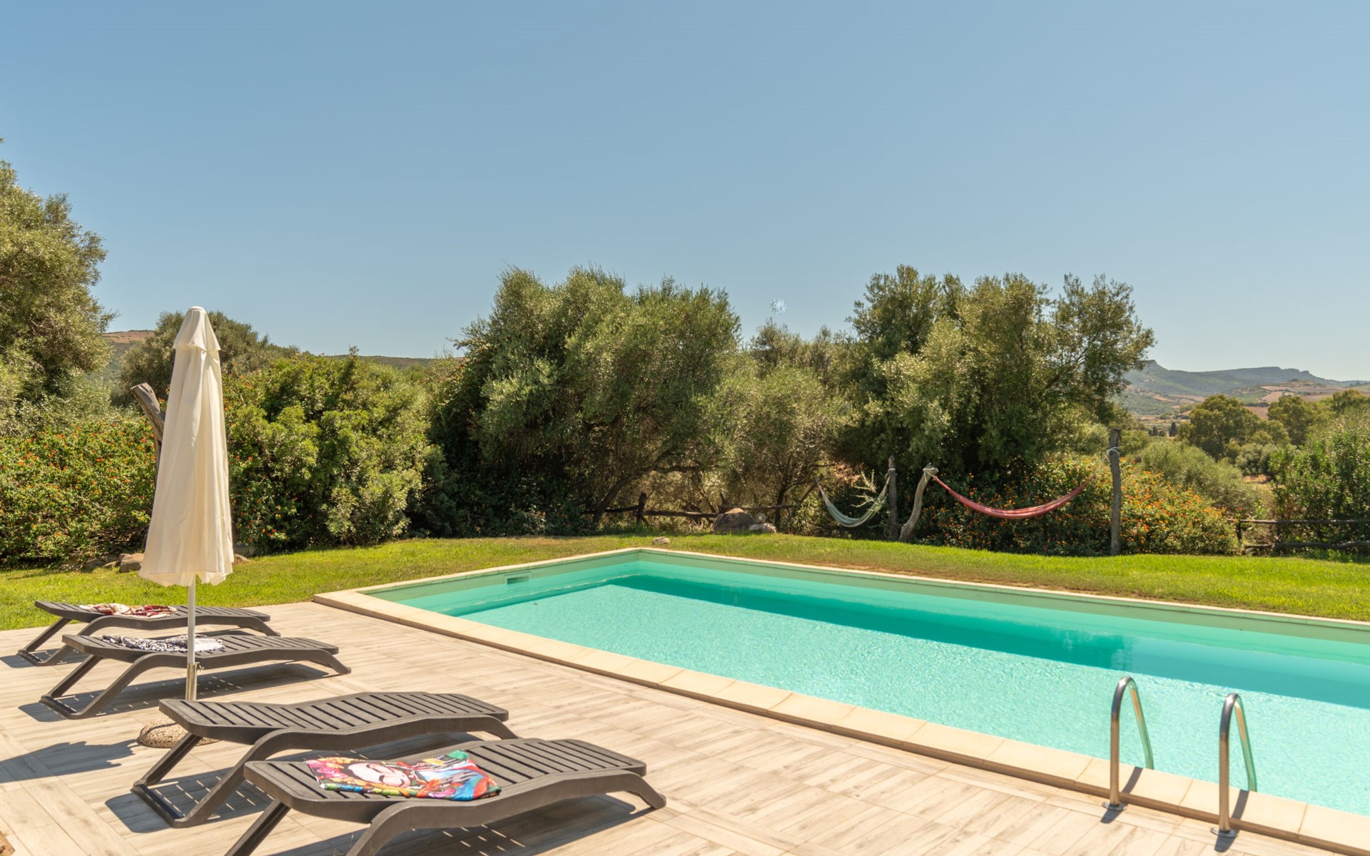 Grosses, schönes Landhaus "Oliviola", umgeben von Wiesen und Feldern. Mietobjekt bestehend aus Haupt- und Nebengebäude, 7 km vom Zentrum von Valledoria, 22 km vom Zentrum von Castelsardo, 52 km vom Zentrum von Sassari, alleinstehende, sonnige Lage, 7 km vom Meer, 150 m vom Fluss, am Fusse Coghinas, im Grünen. Zur Alleinbenutzung: grosser Garten mit Pflanzen und Bäumen, Wiese, Hof, Schwimmbad (10 x 5 m, 150 cm tief, saisonale Verfügbarkeit: 15.Apr. - 15.Okt.). Terrasse, Gartenmöbel. 300 m lange holprige Zufahrt bis zum Haus (Naturweg). Parkplatz (für 4 Autos) auf dem Grundstück. Einkaufsgeschäft 2 km, Supermarkt 2 km, Restaurant 2 km, Bar 2 km, Bushaltestelle 7 km, Fähre "Porto Torres" 51 km, Sandstrand "Baia delle Mimose" 7 km. Bitte beachten: Fahrzeug empfohlen. Tiere in der Umgebung.