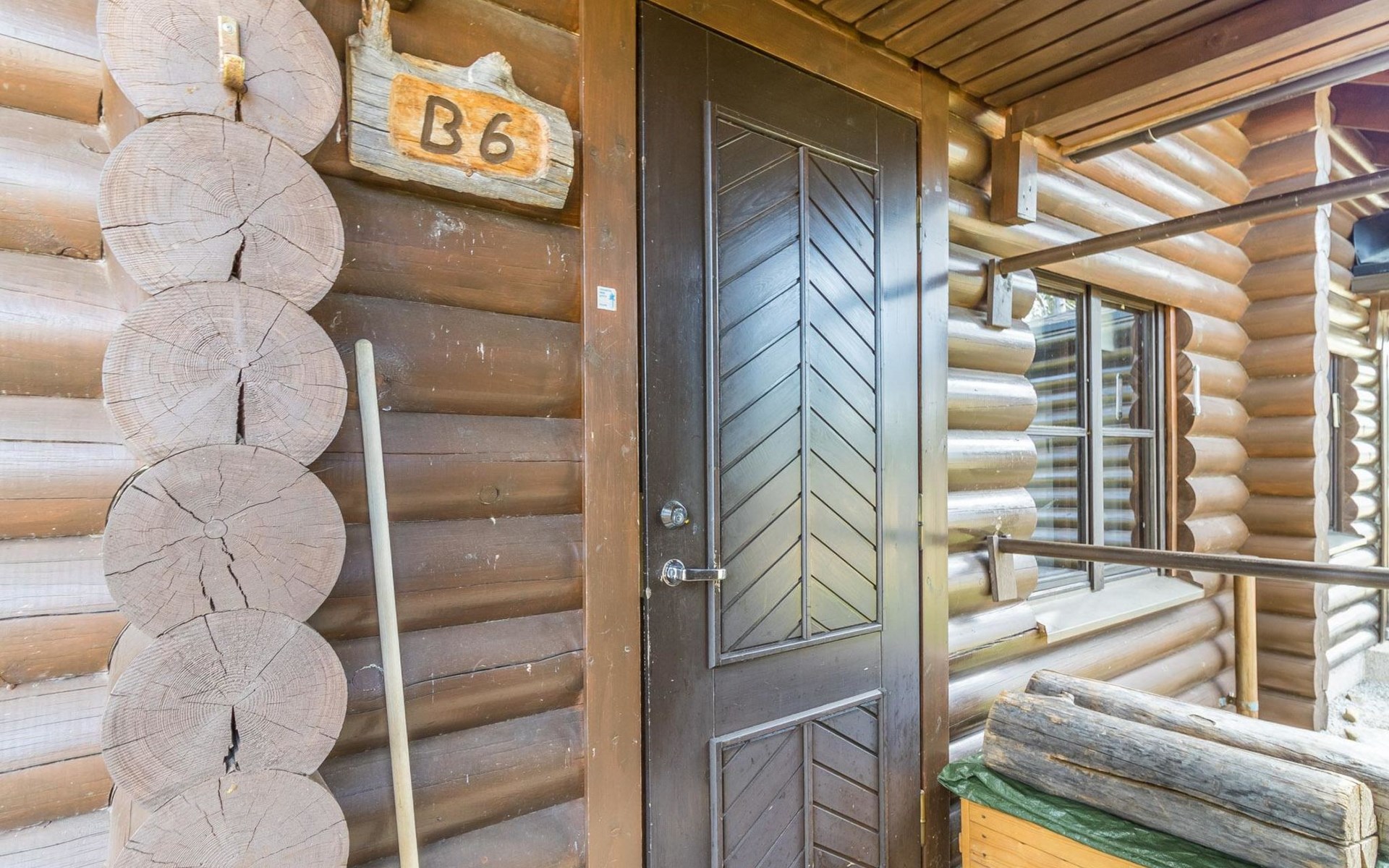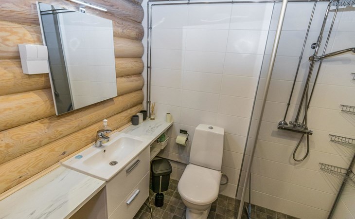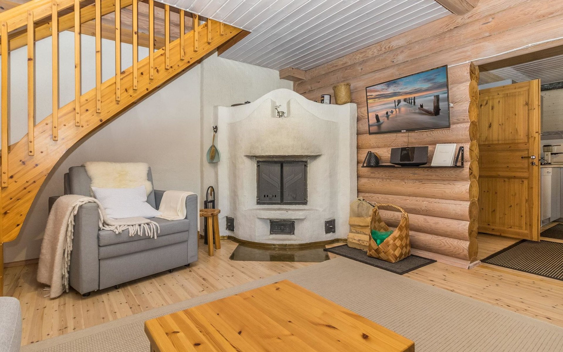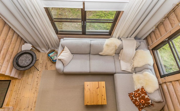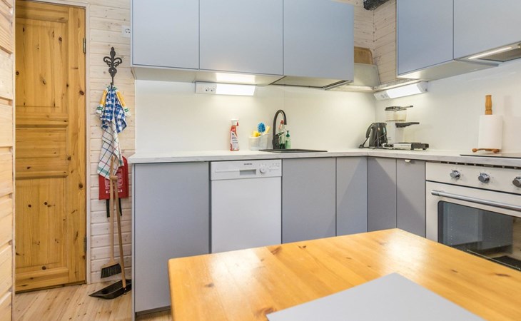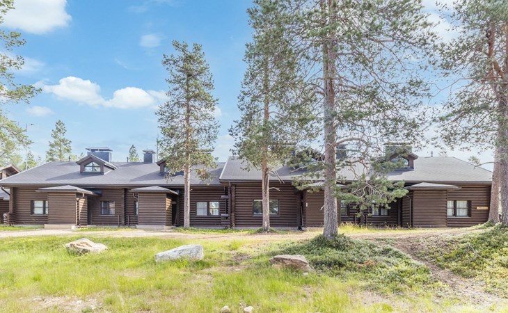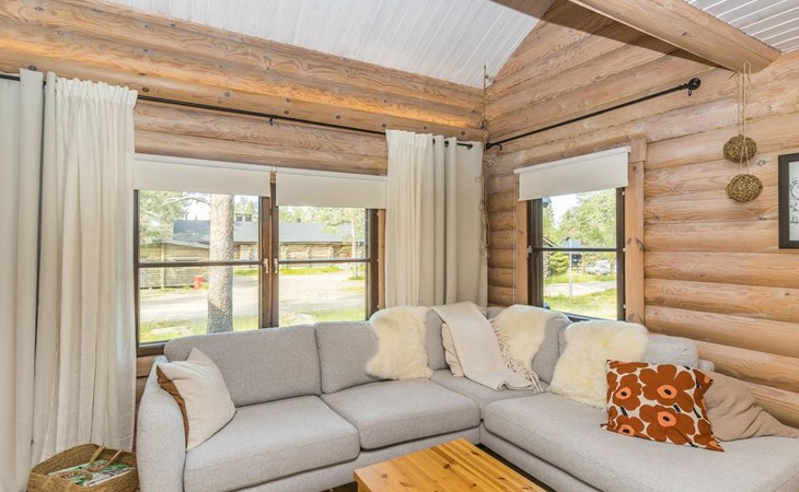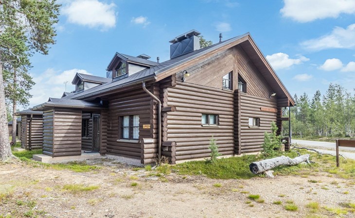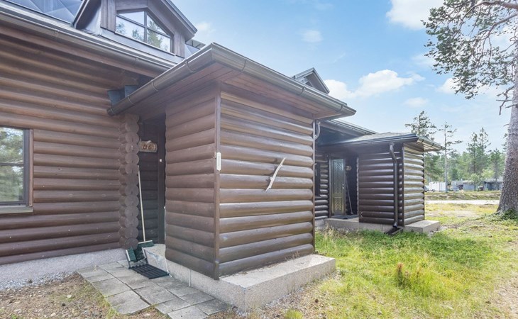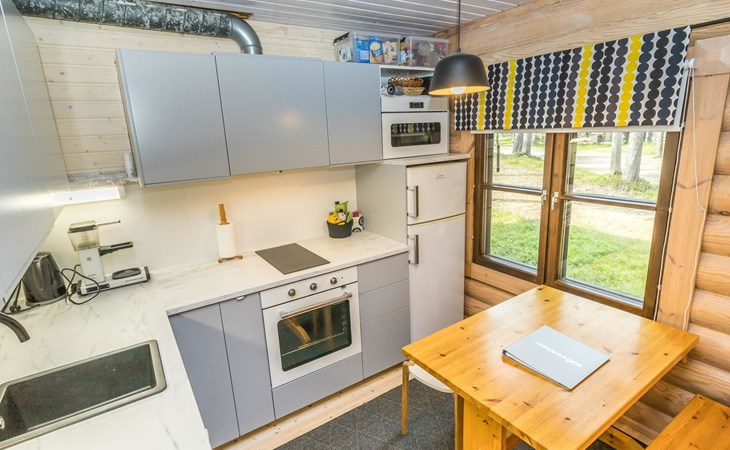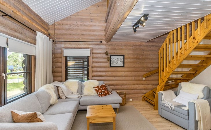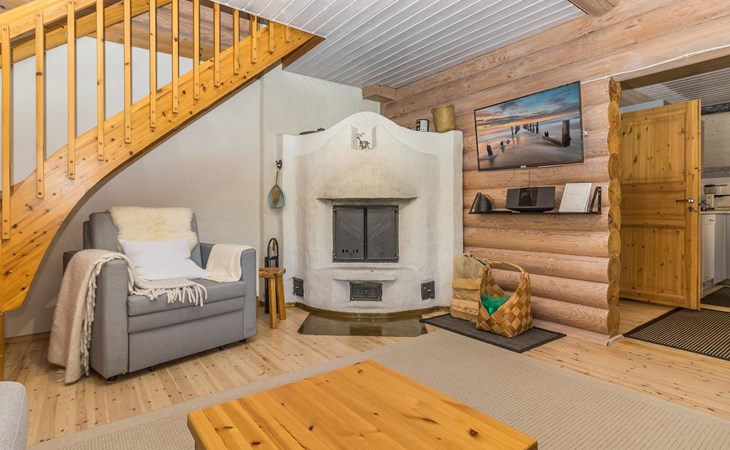 Log built row house apartment 1986, kitchen, living room, upstairs (steep stairs) bedroom with a double bed, sleeping loft extra mattress for one. Washroom and sauna (elec. stove).