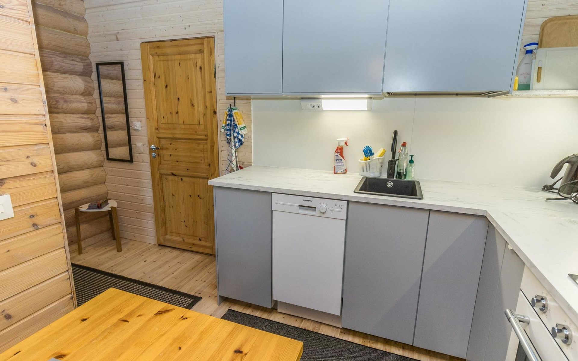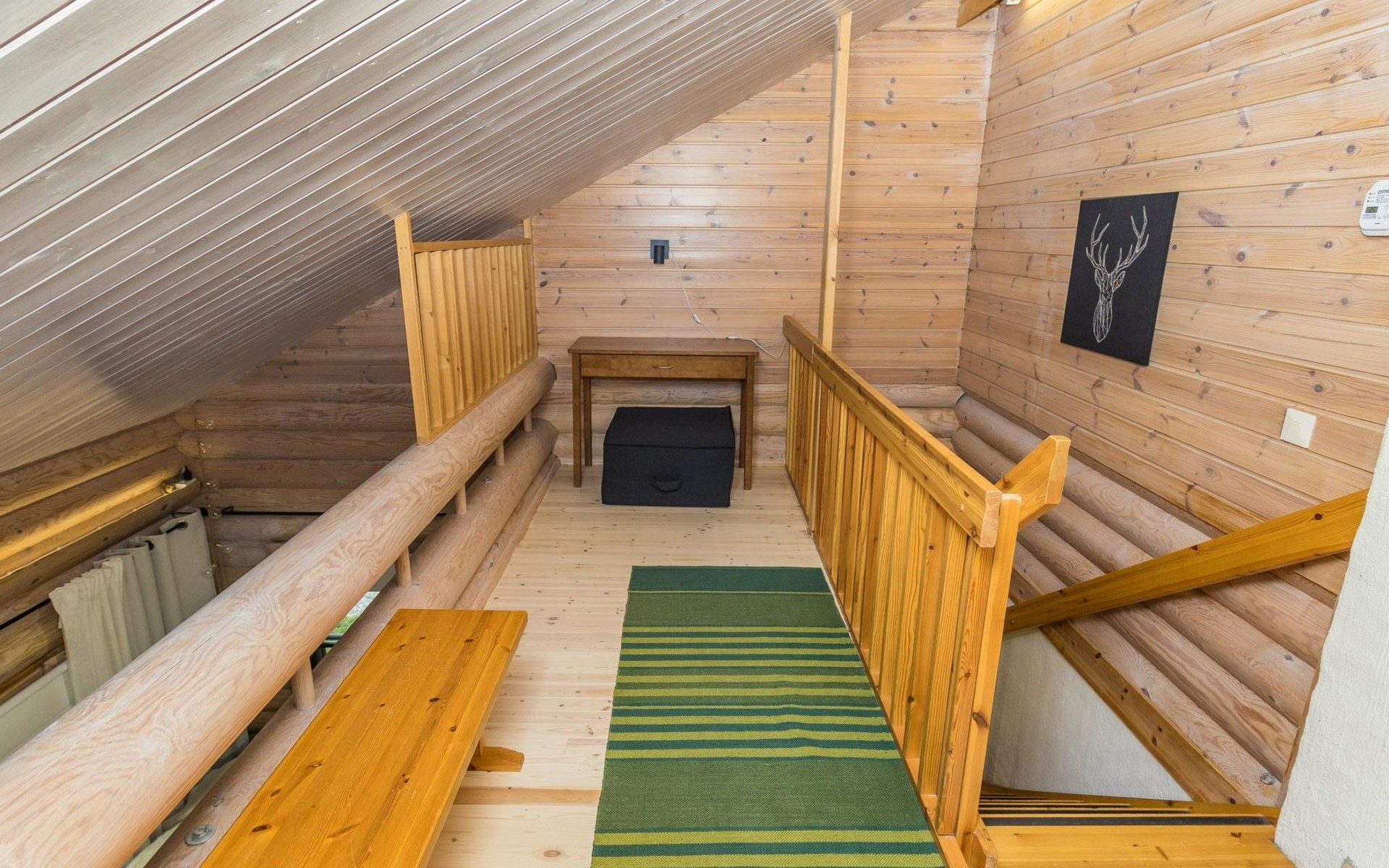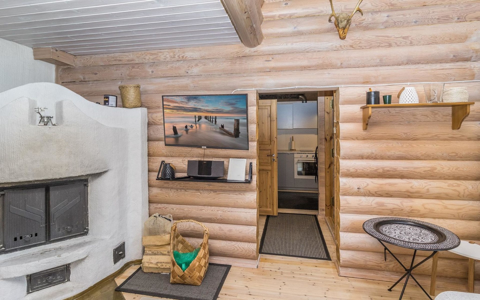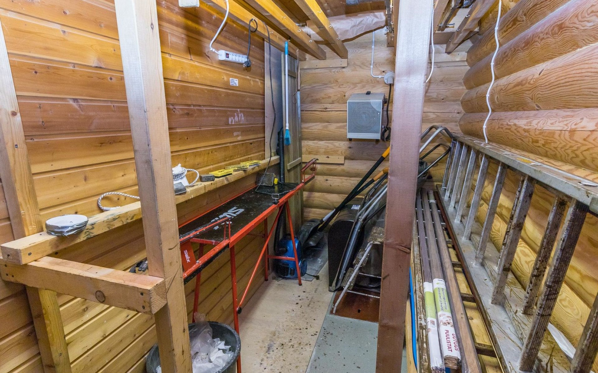 Log built row house apartment 1986, kitchen, living room, upstairs (steep stairs) bedroom with a double bed, sleeping loft extra mattress for one. Washroom and sauna (elec. stove).