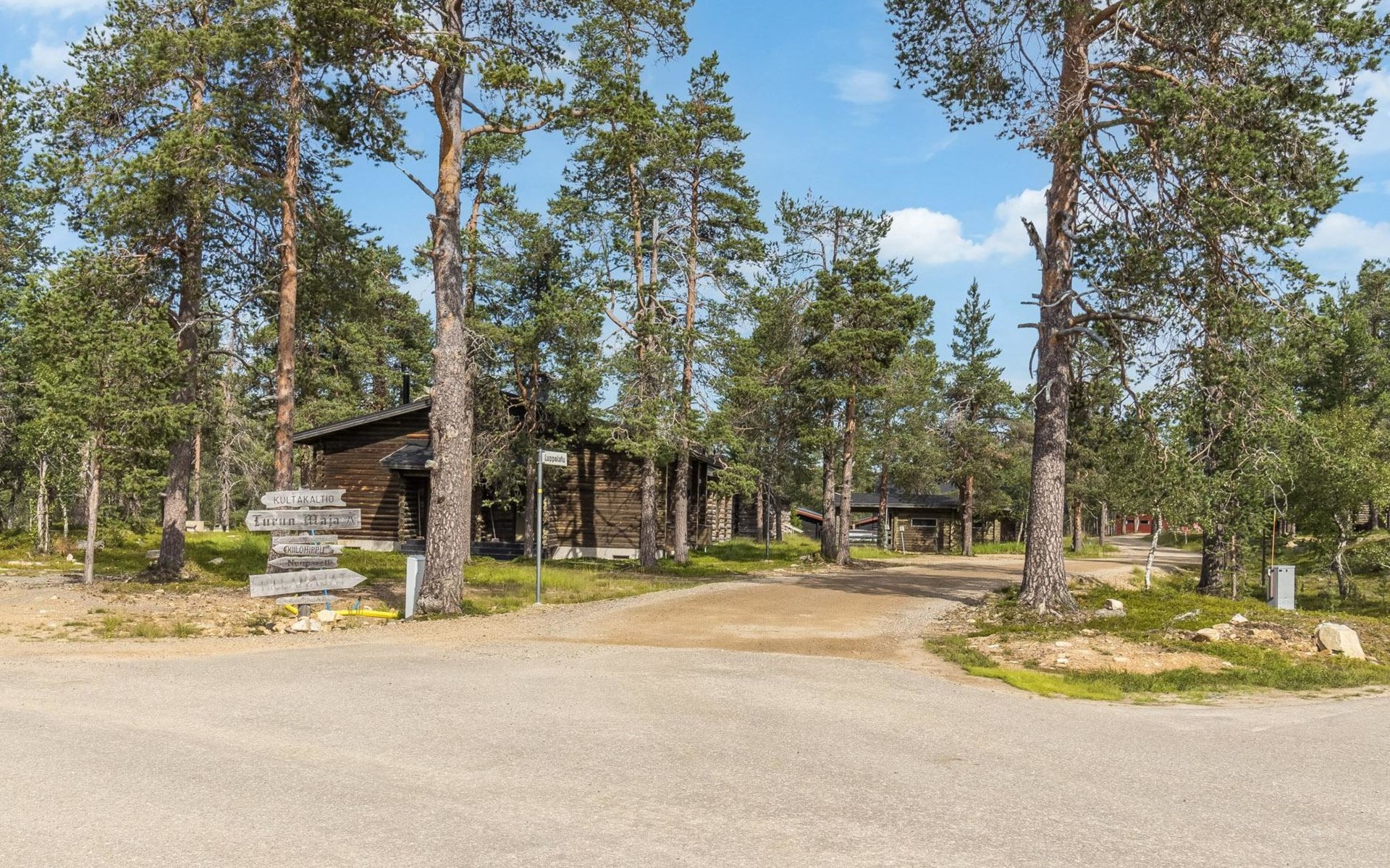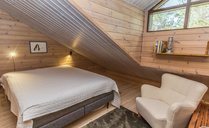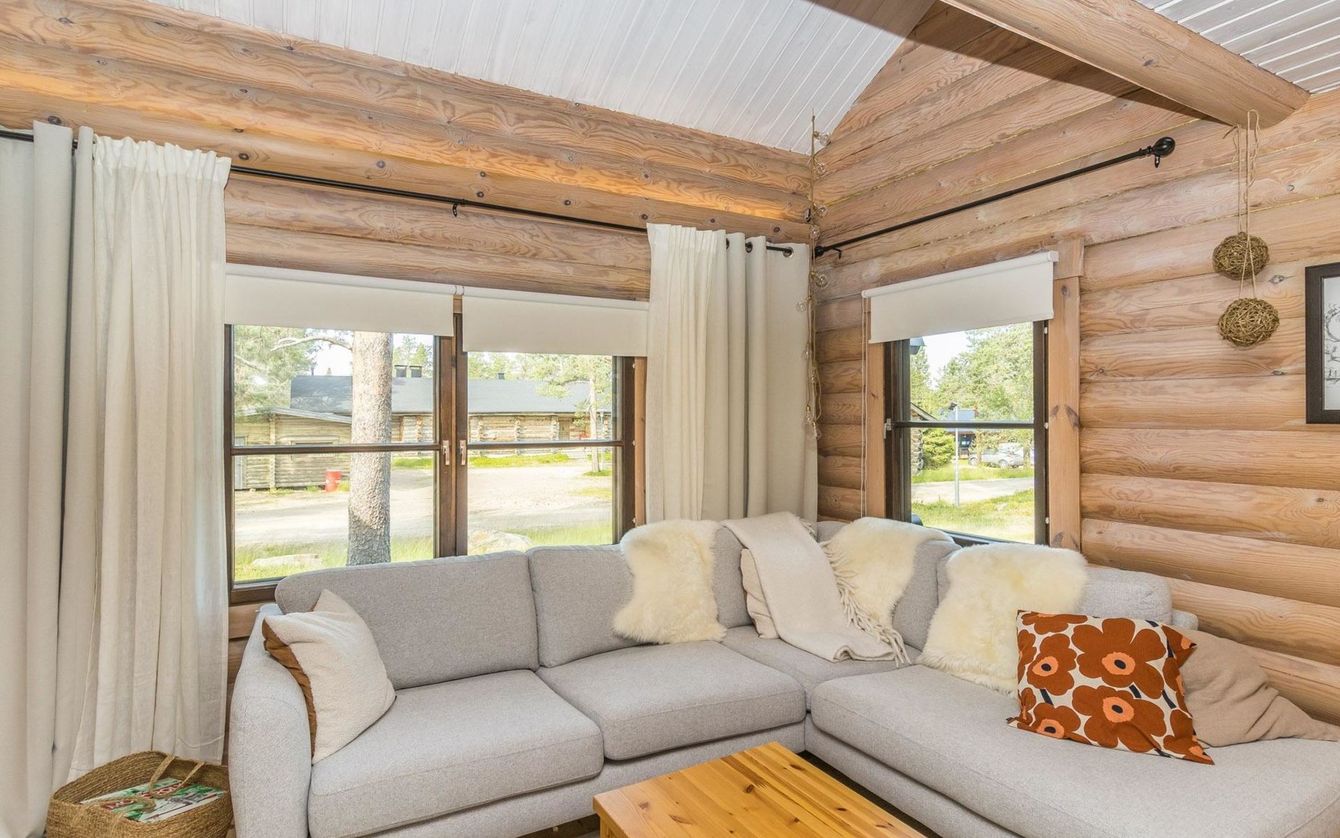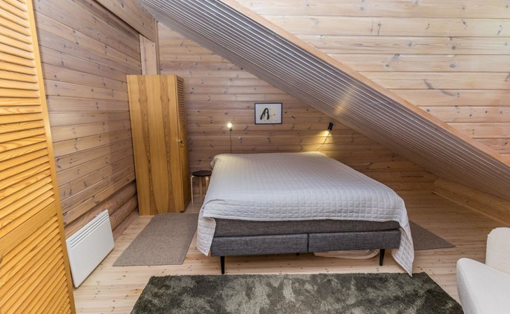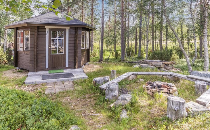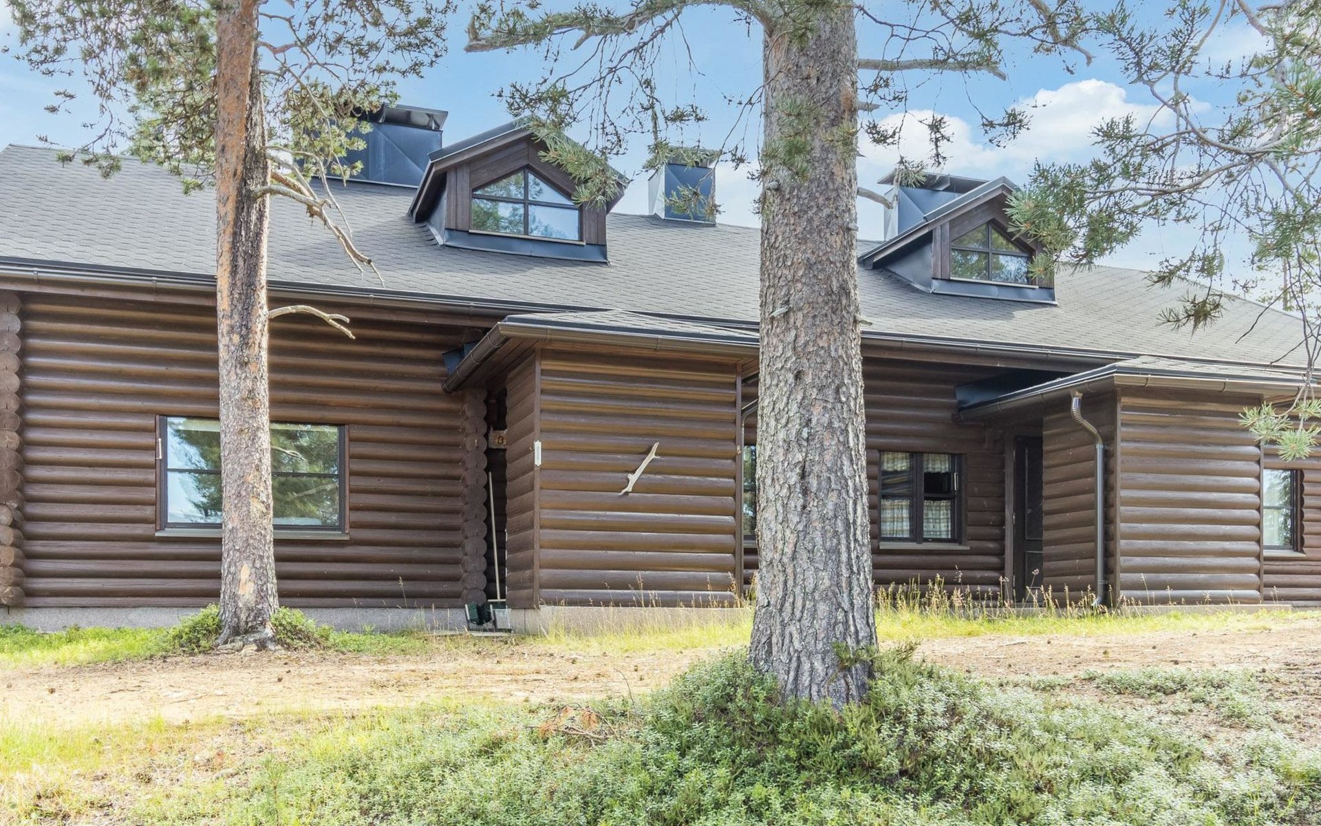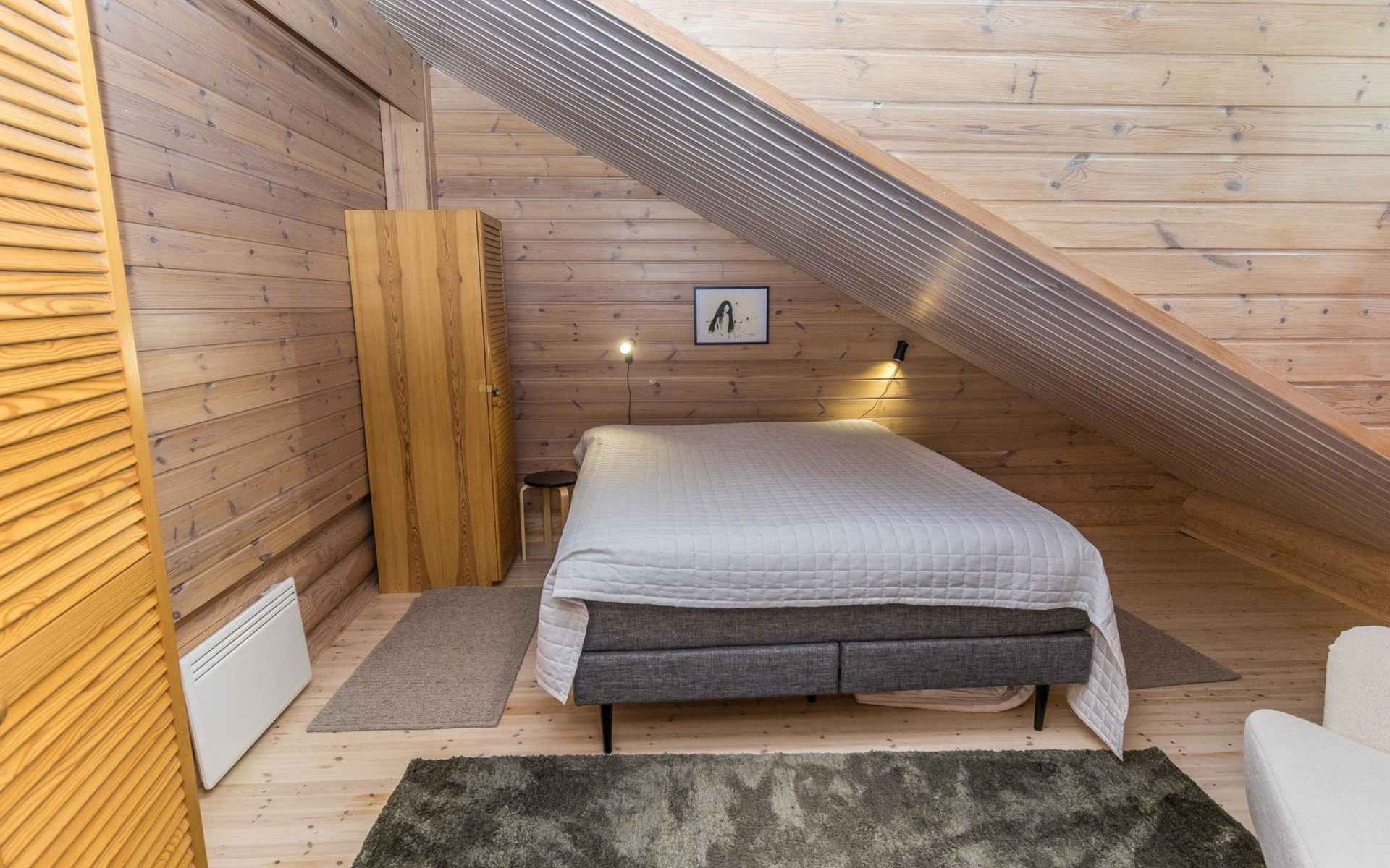 Log built row house apartment 1986, kitchen, living room, upstairs (steep stairs) bedroom with a double bed, sleeping loft extra mattress for one. Washroom and sauna (elec. stove).