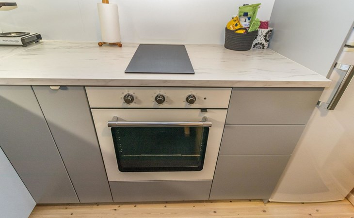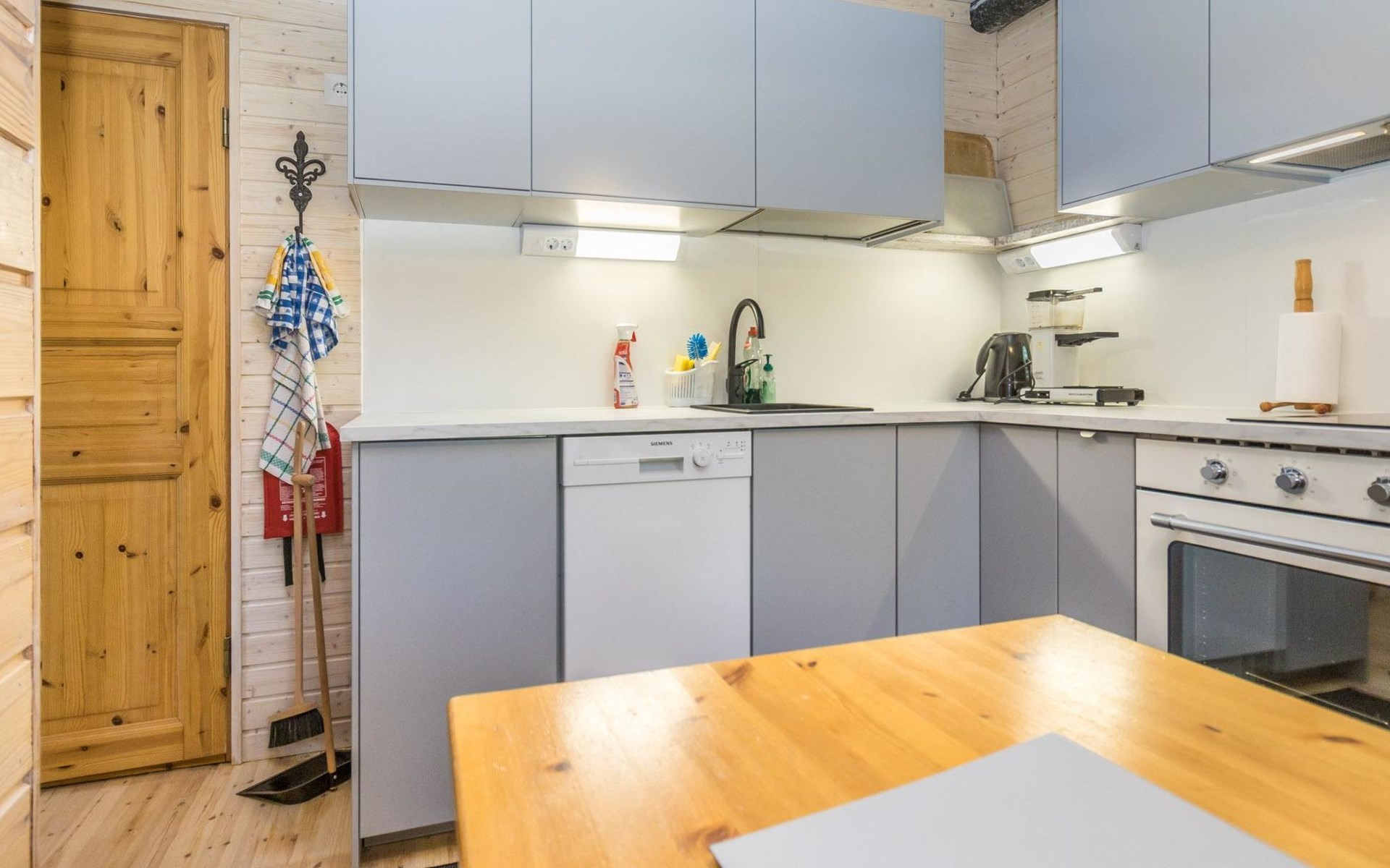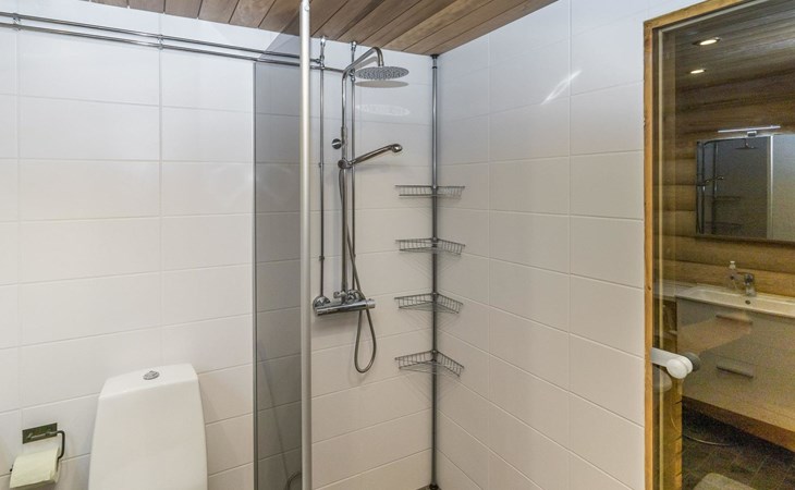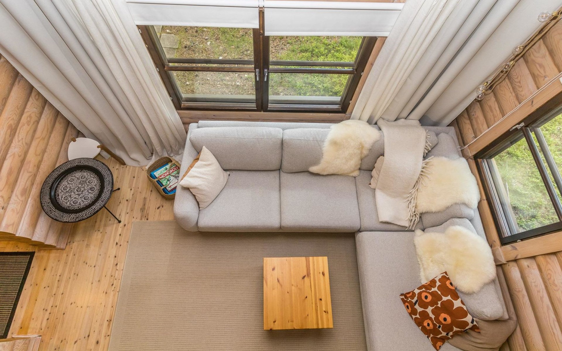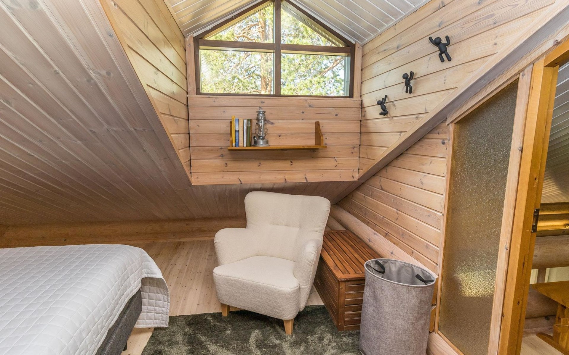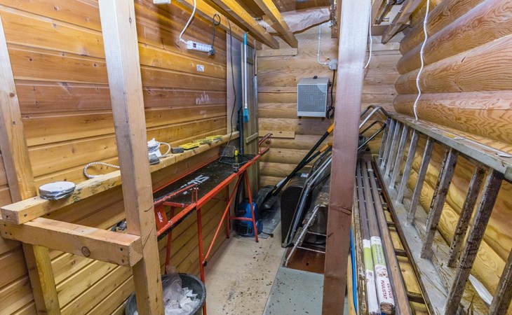 Log built row house apartment 1986, kitchen, living room, upstairs (steep stairs) bedroom with a double bed, sleeping loft extra mattress for one. Washroom and sauna (elec. stove).