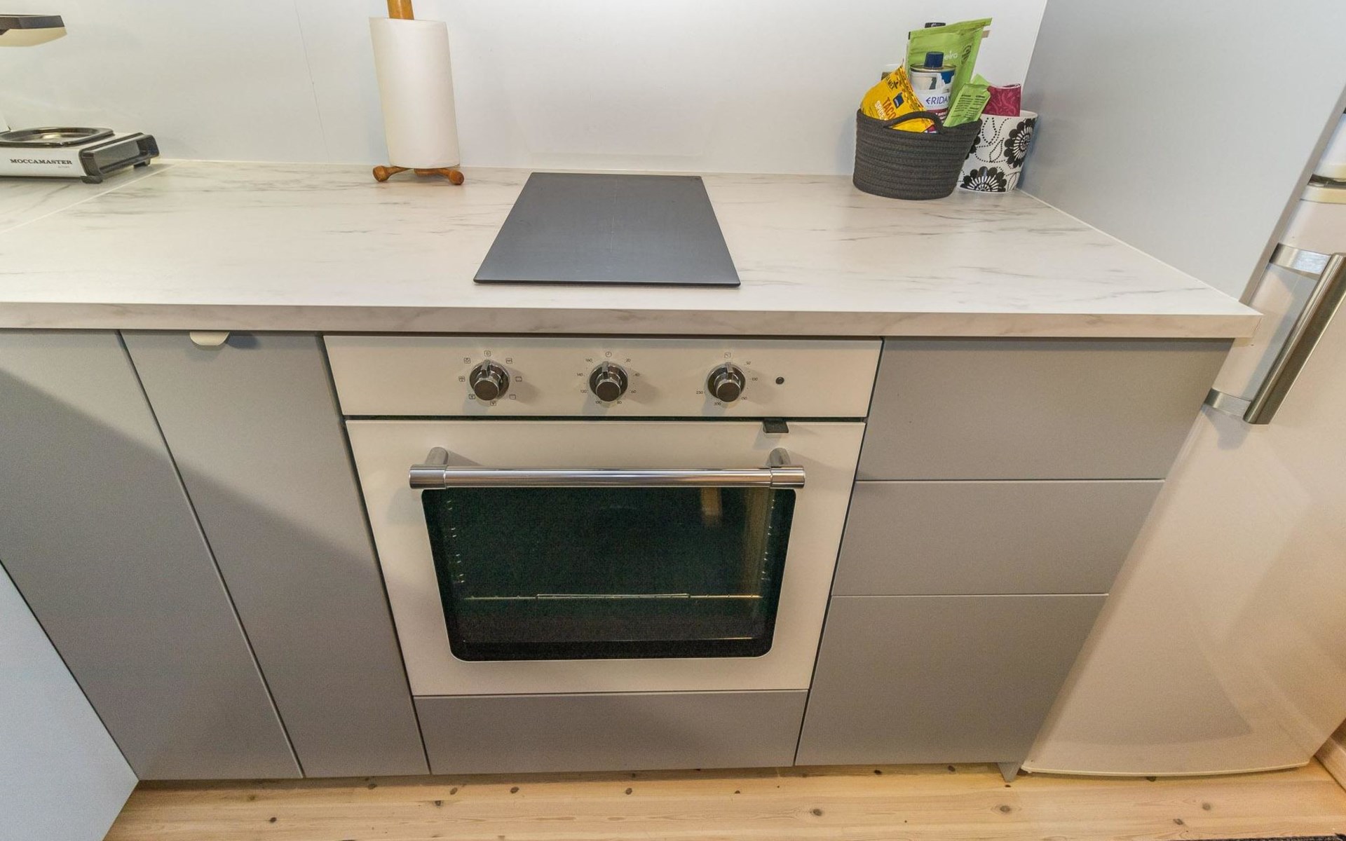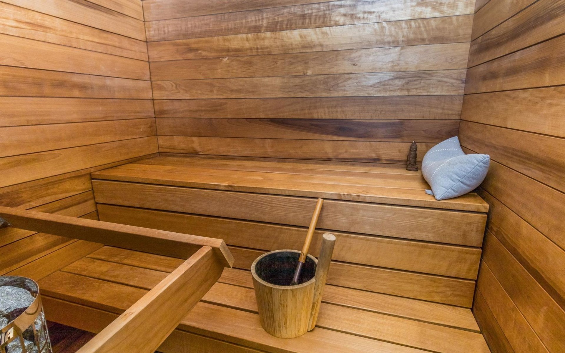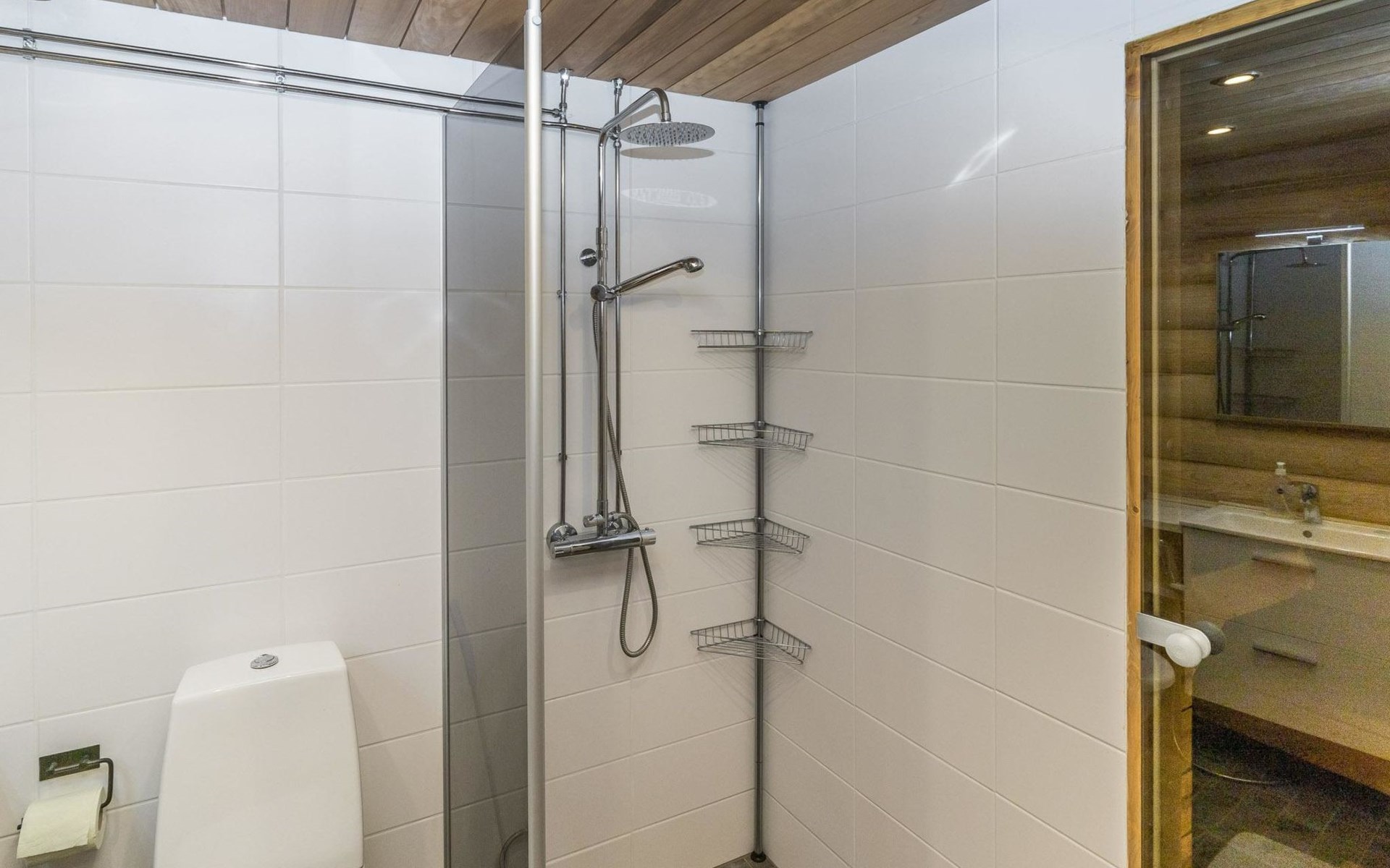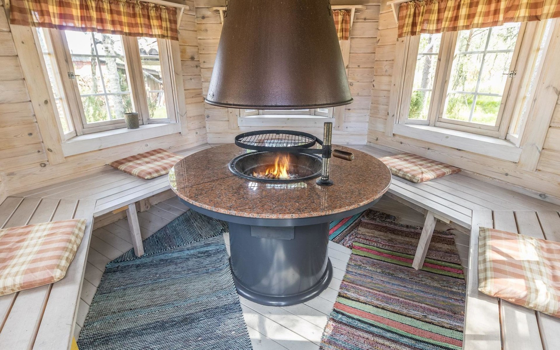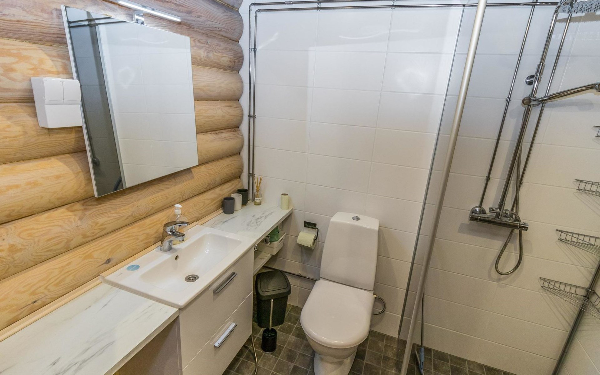Log built row house apartment 1986, kitchen, living room, upstairs (steep stairs) bedroom with a double bed, sleeping loft extra mattress for one. Washroom and sauna (elec. stove).