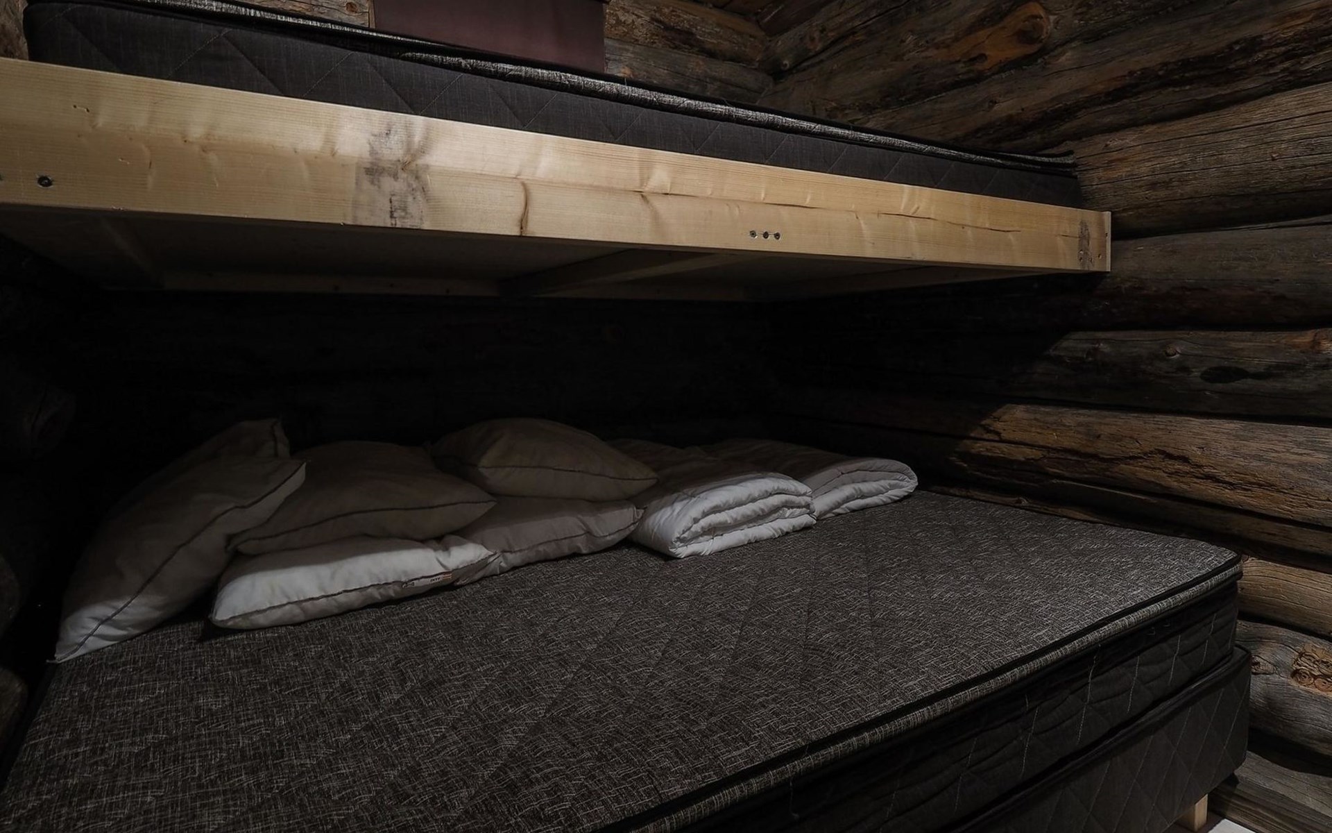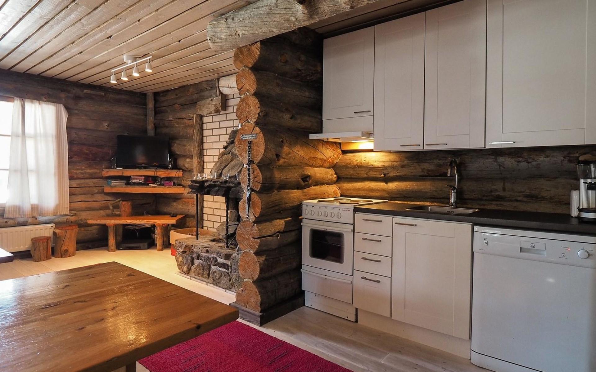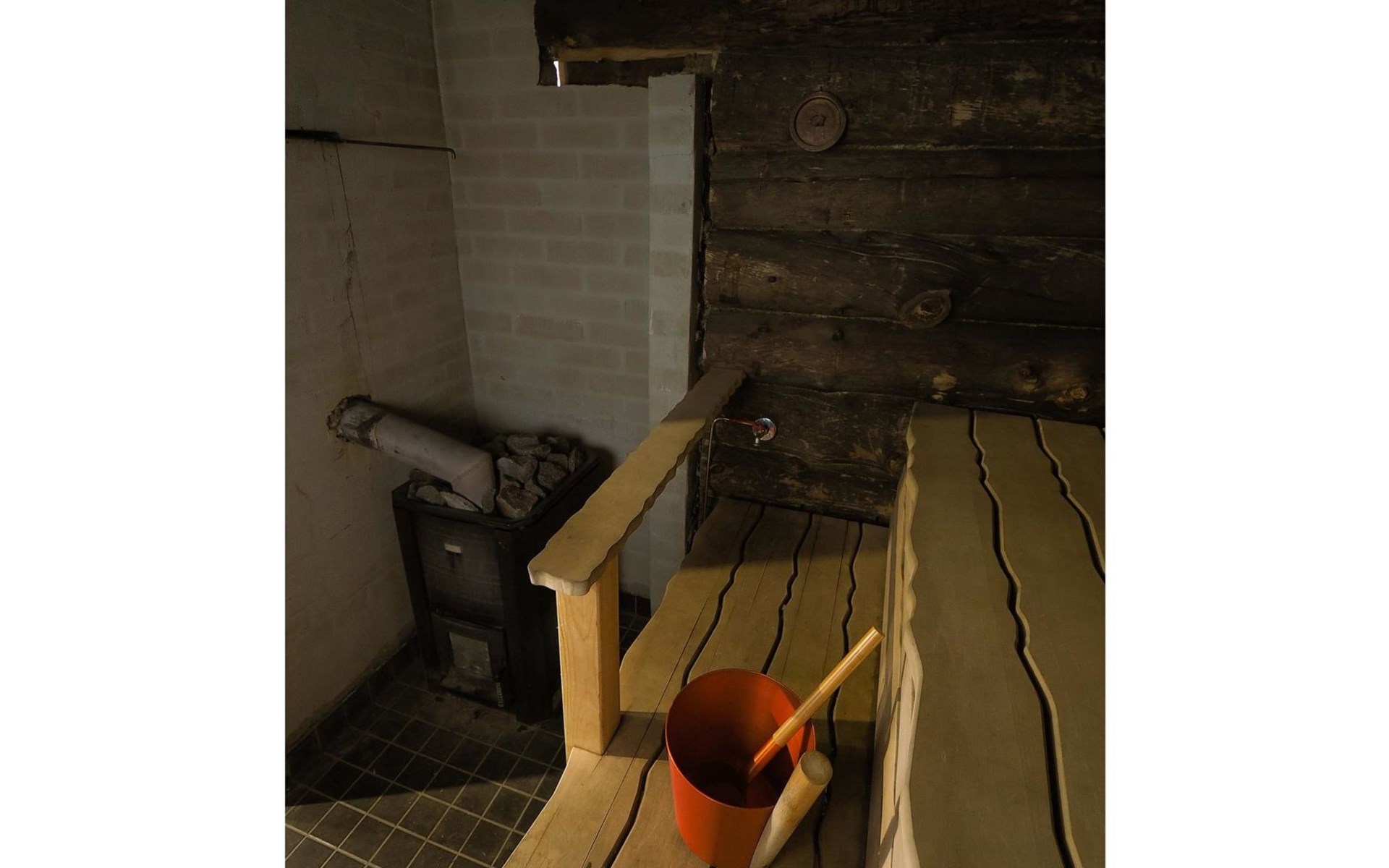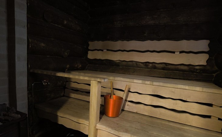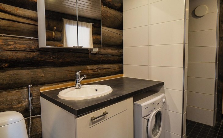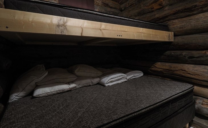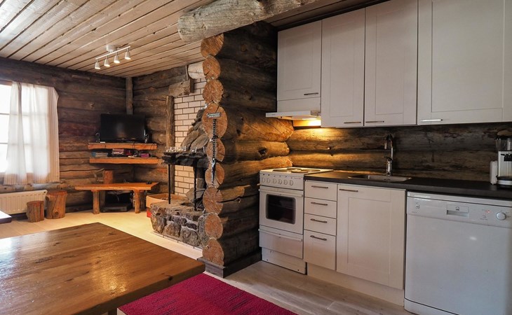 Kelo log cabin, built in 1990. The cabin has three bedrooms, two of them with a bunk bed (lower bed 160 cm, upper bed 140 cm wide), the third with a double bed (140 cm). Living room kitchen, sauna (wood sauna stove), washroom/WC and covered terrace.