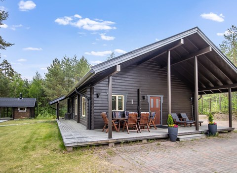 Kelo log cabin, built in 1990. The cabin has three bedrooms, two of them with a bunk bed (lower bed 160 cm, upper bed 140 cm wide), the third with a double bed (140 cm). Living room kitchen, sauna (wood sauna stove), washroom/WC and covered terrace.