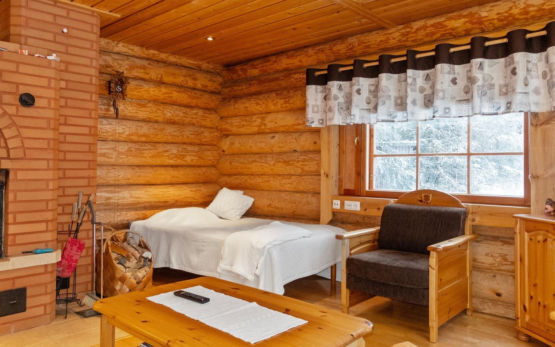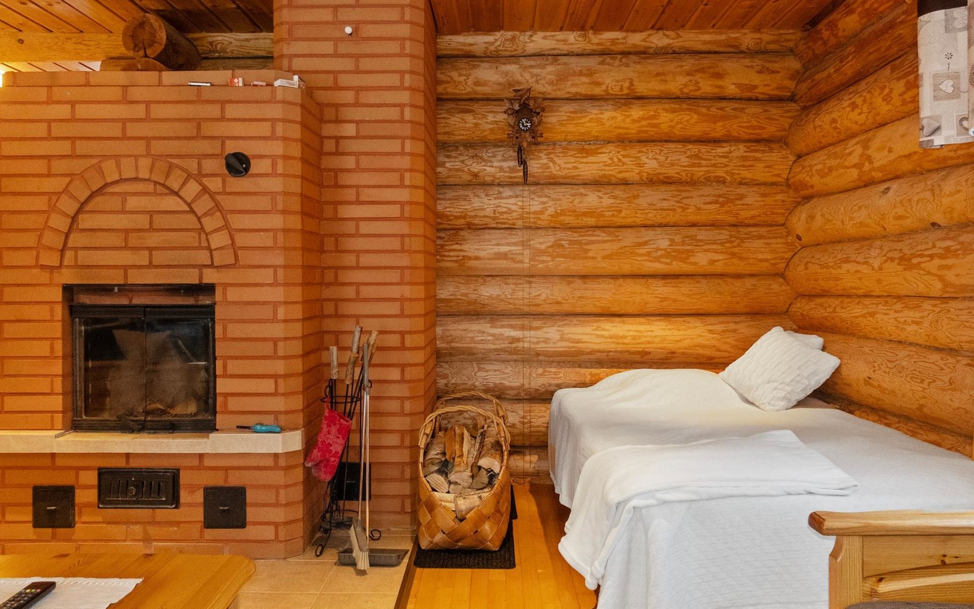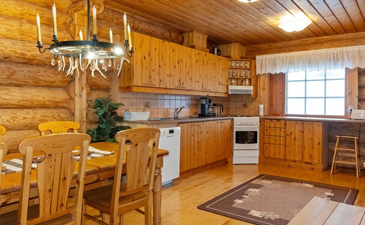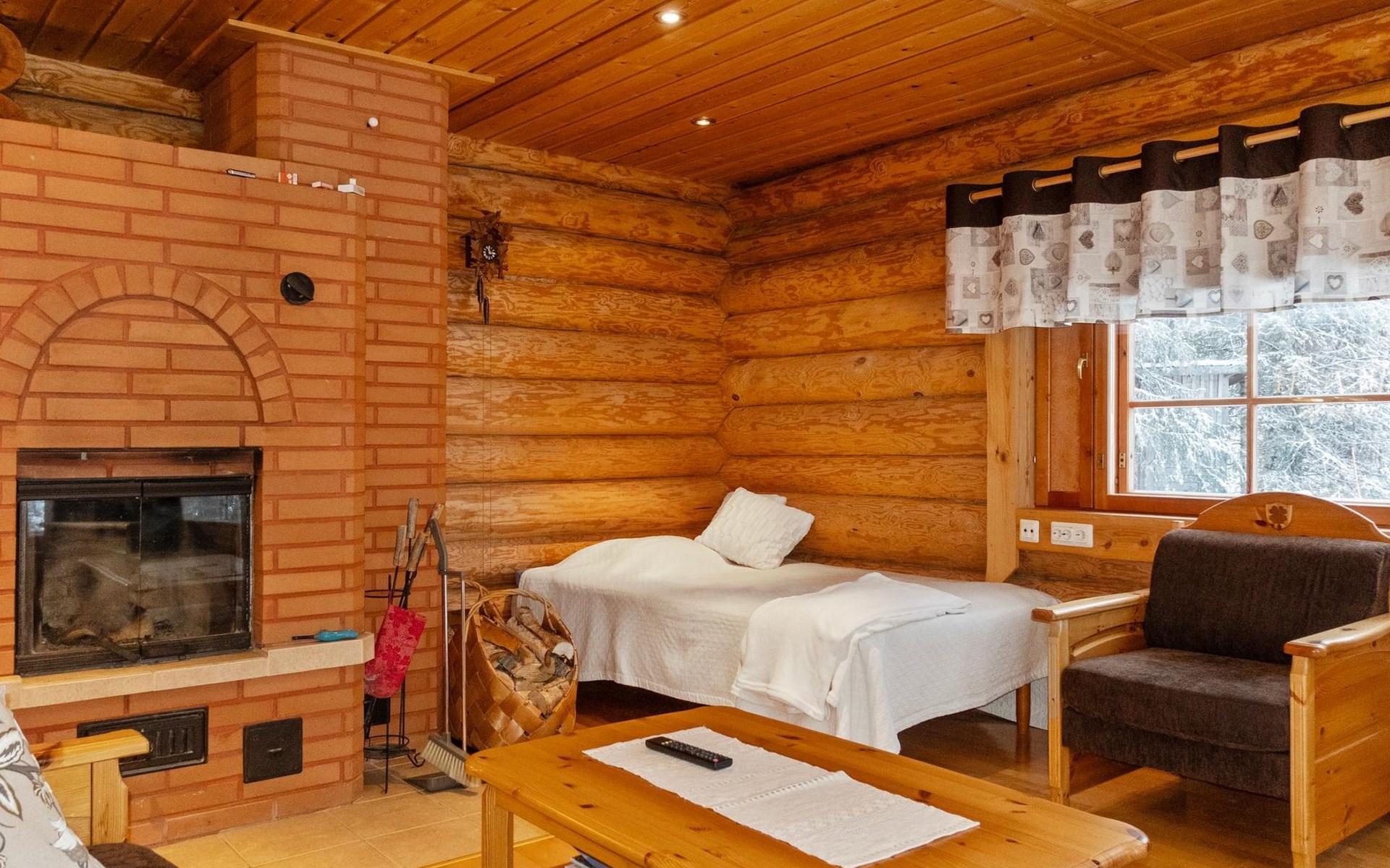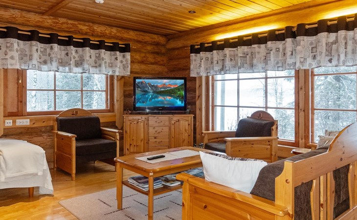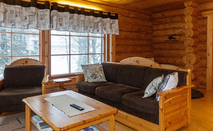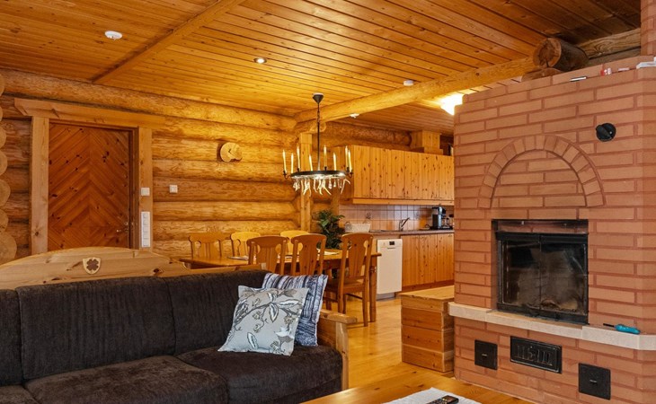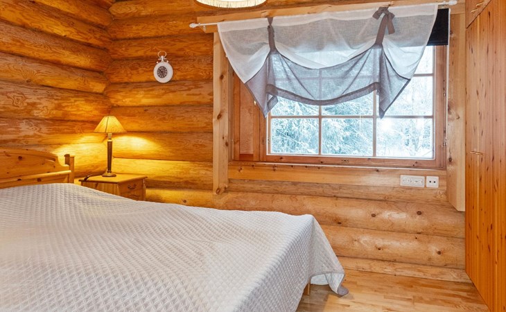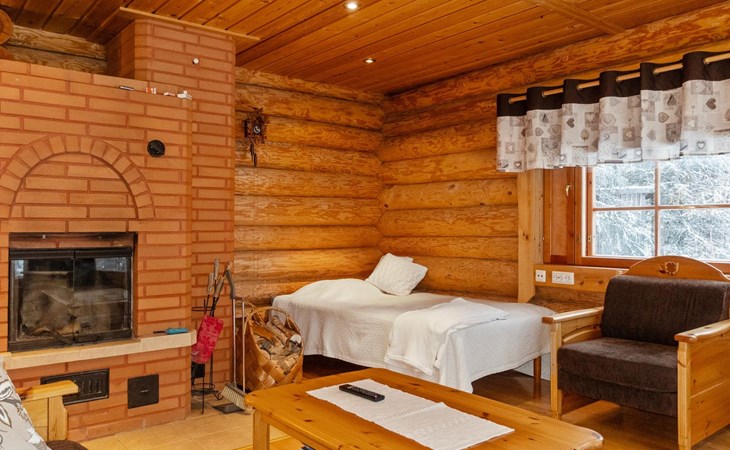 Handcrafted from logs, the cabin was completed in 2002. The cabin has one bedroom with a double bed. The spacious living area includes two 120 cm wide beds and a sofa bed. There is also an additional bed under the sofa, and the sofa itself serves as a bed. Additionally, the living area features a large fireplace.