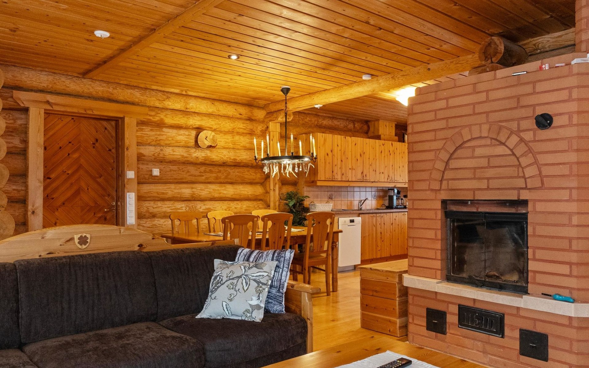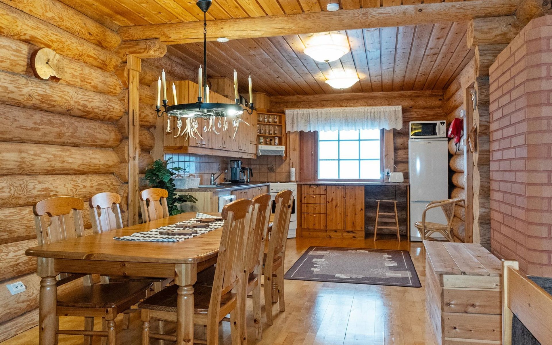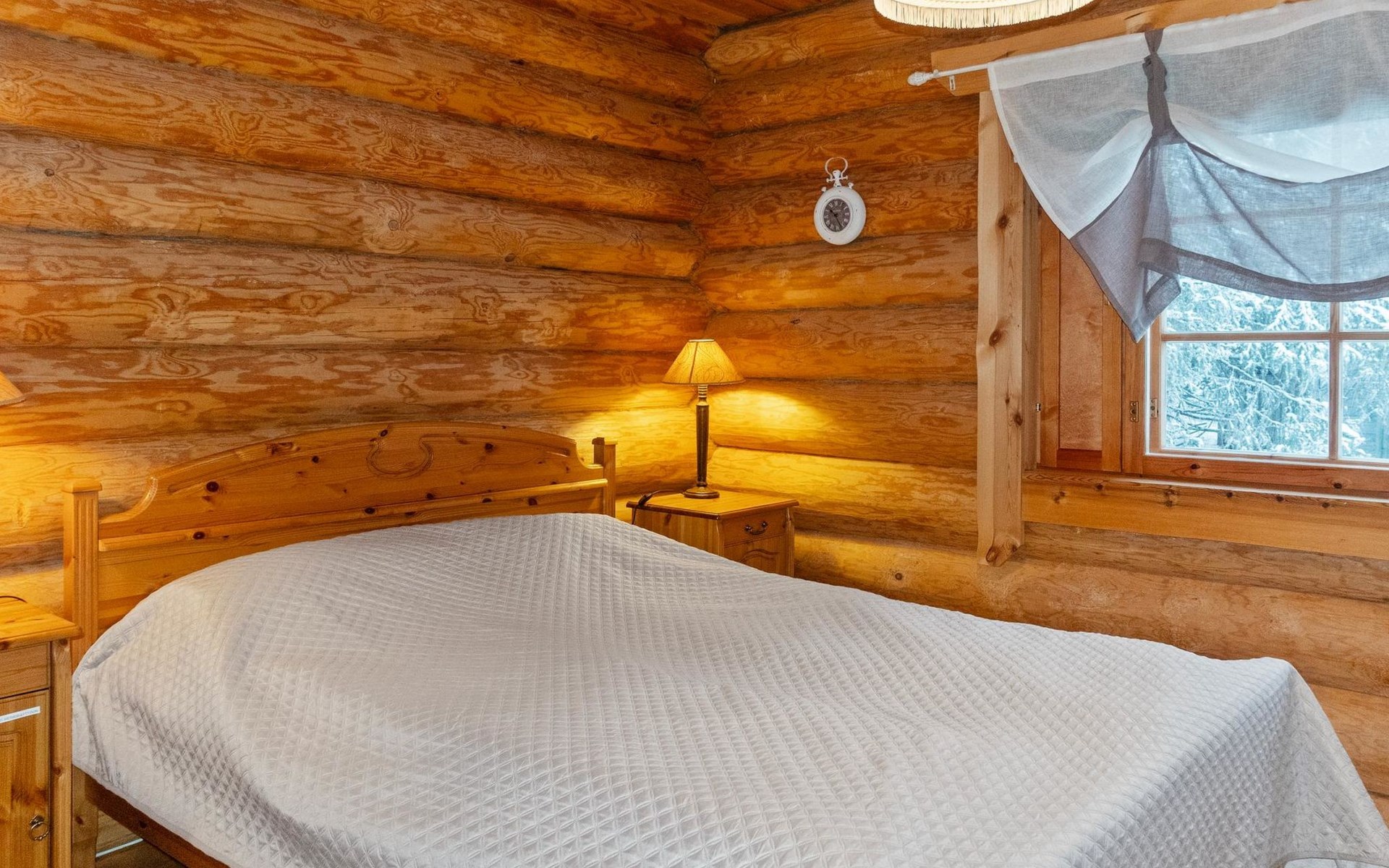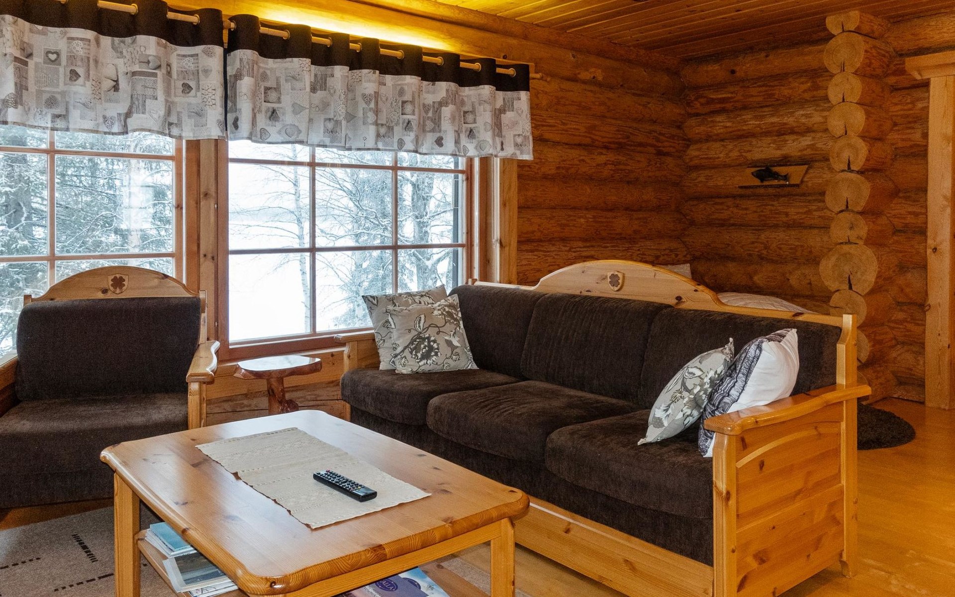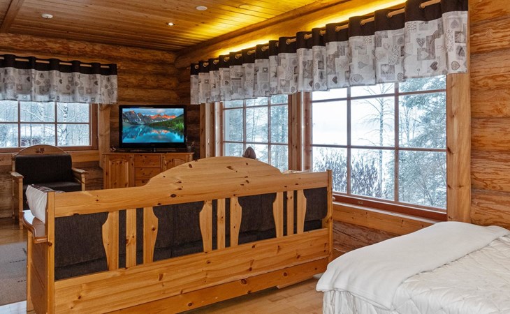 Handcrafted from logs, the cabin was completed in 2002. The cabin has one bedroom with a double bed. The spacious living area includes two 120 cm wide beds and a sofa bed. There is also an additional bed under the sofa, and the sofa itself serves as a bed. Additionally, the living area features a large fireplace.