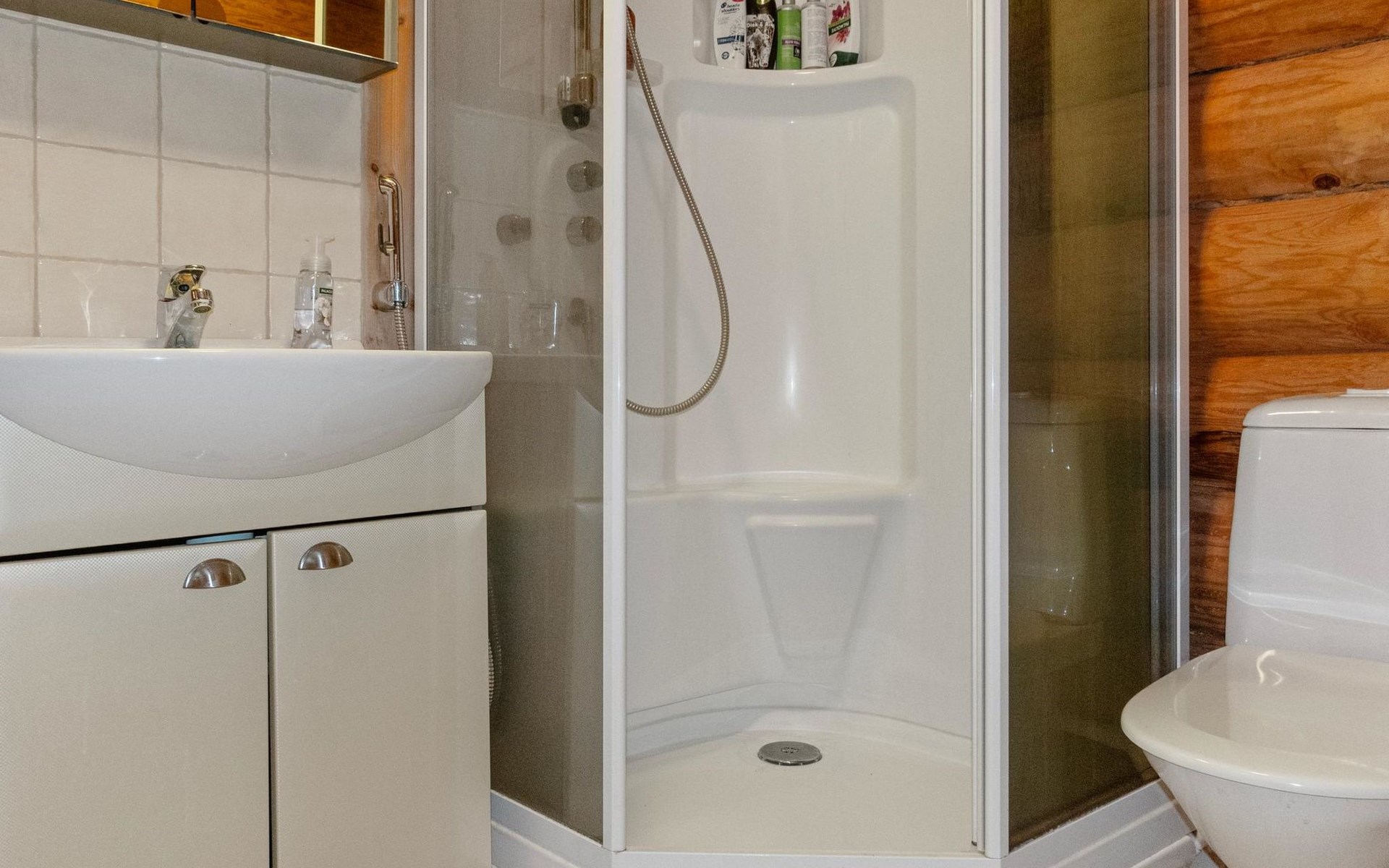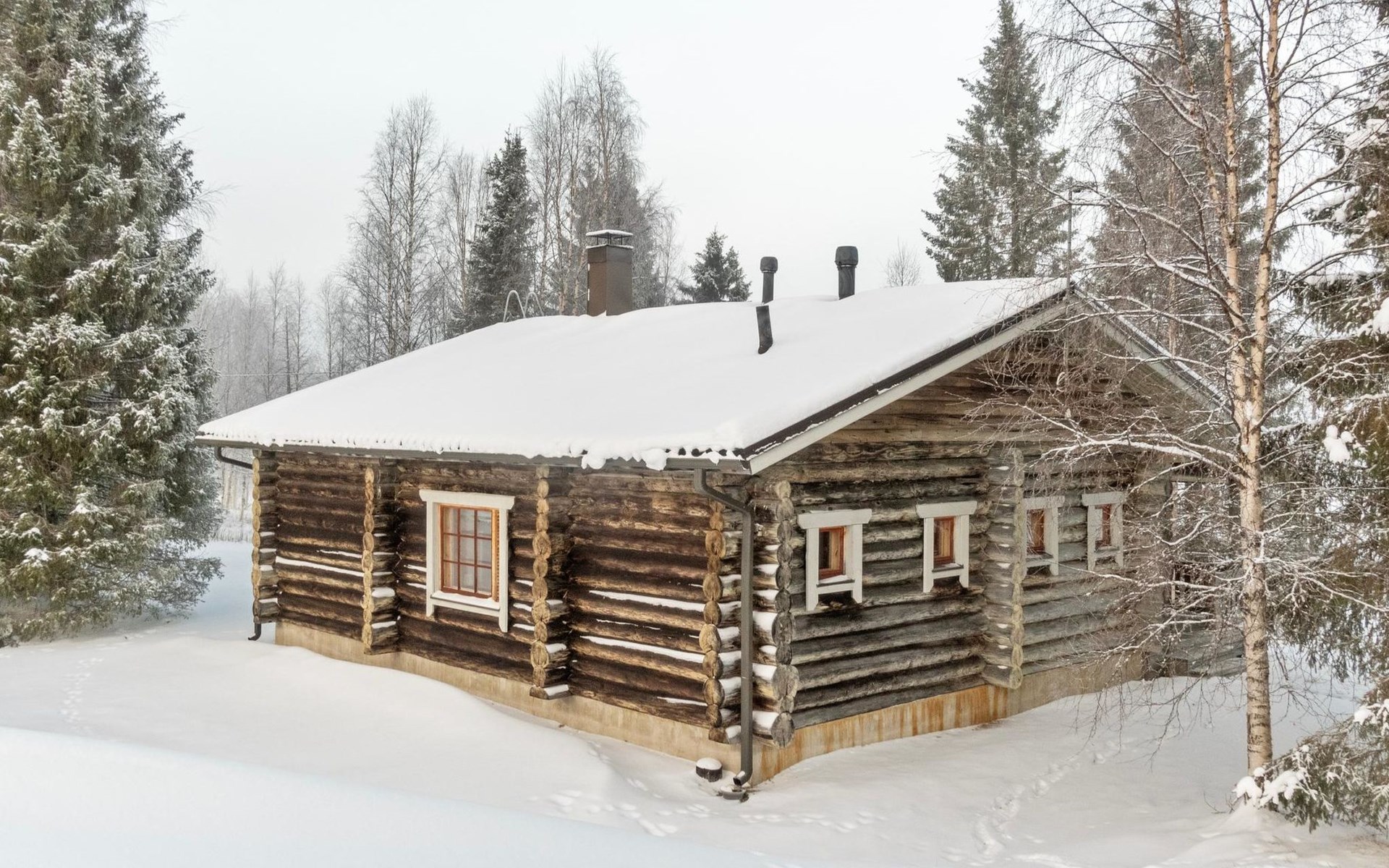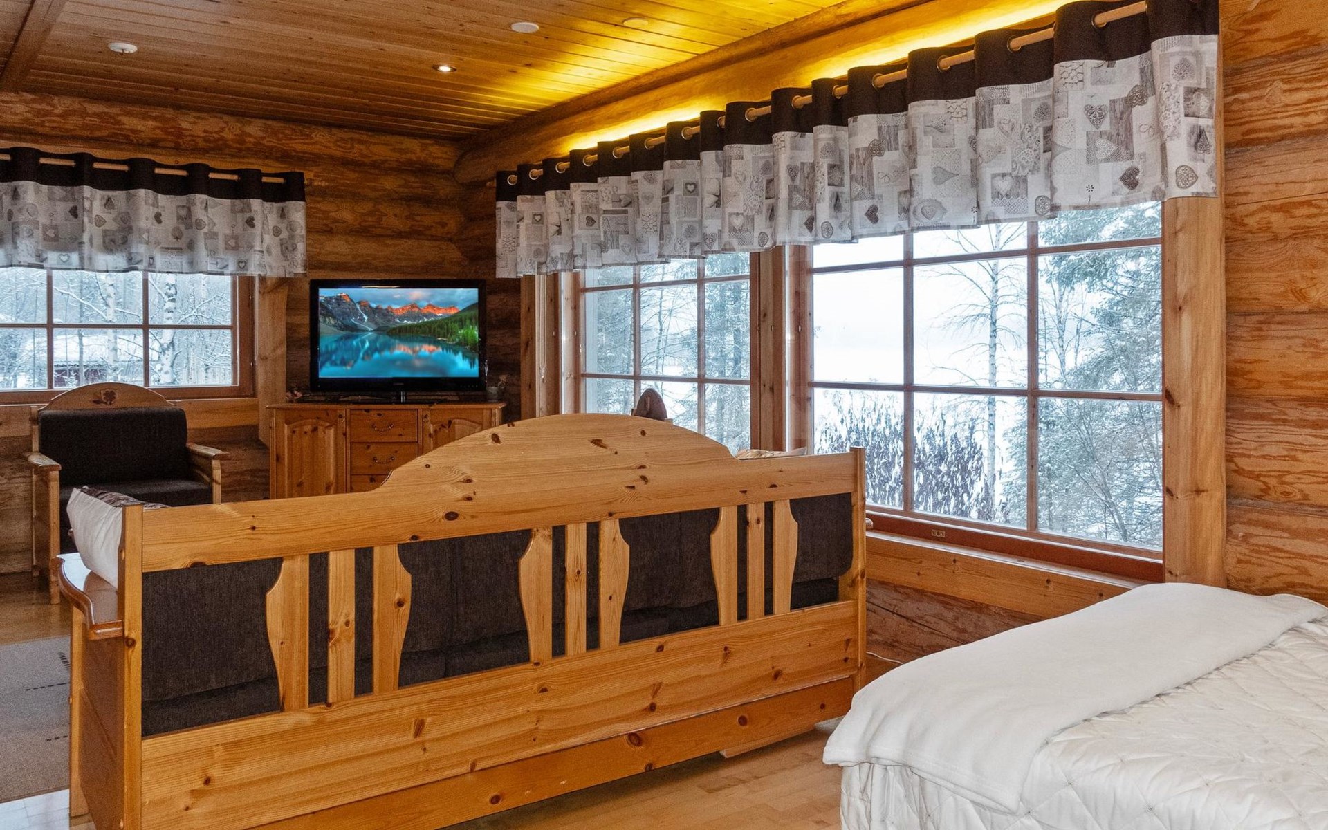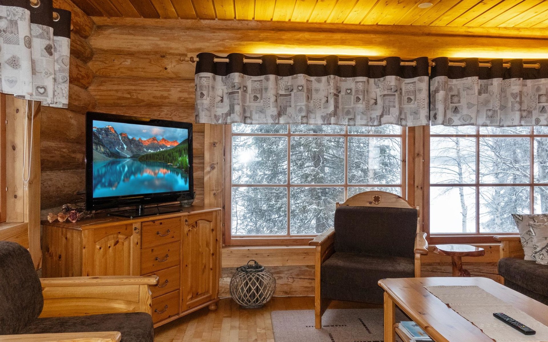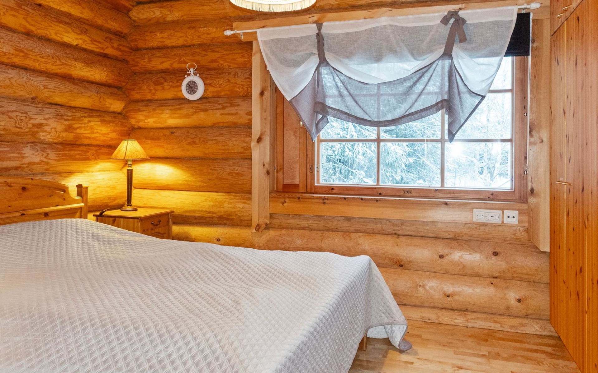 Handcrafted from logs, the cabin was completed in 2002. The cabin has one bedroom with a double bed. The spacious living area includes two 120 cm wide beds and a sofa bed. There is also an additional bed under the sofa, and the sofa itself serves as a bed. Additionally, the living area features a large fireplace.