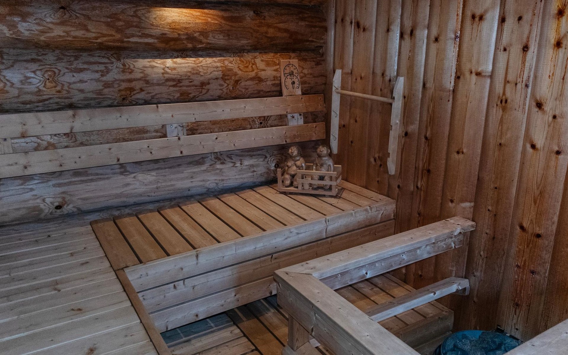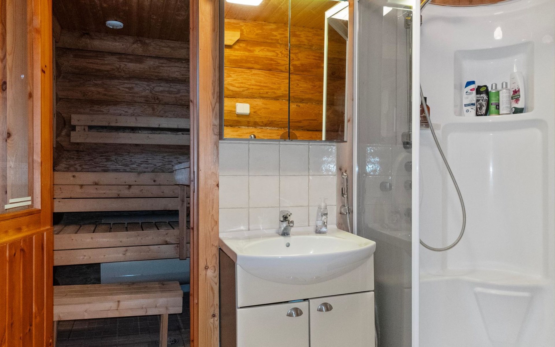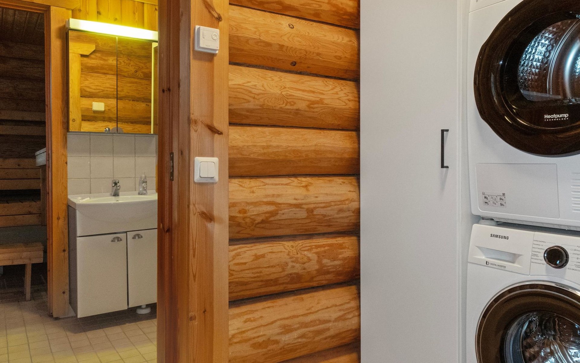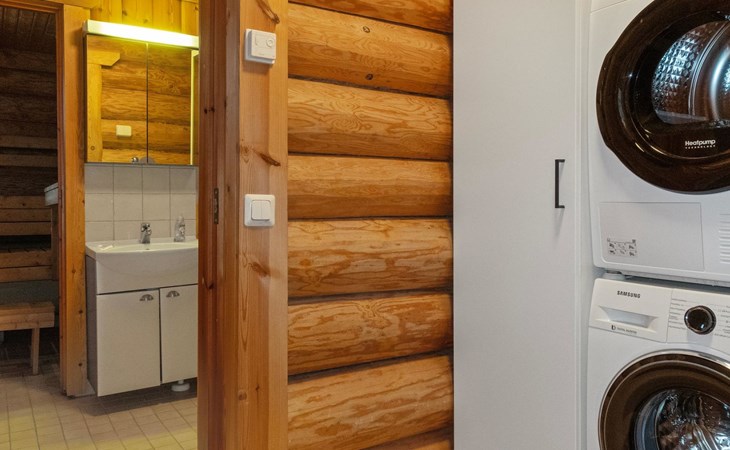 The dressing room contains a washing machine and a tumble dryer. The bathroom has a WC and a shower cubicle. The large sauna is electrically heated.