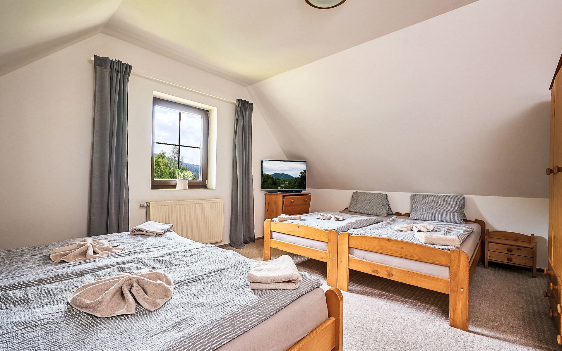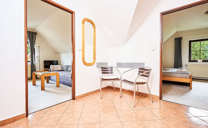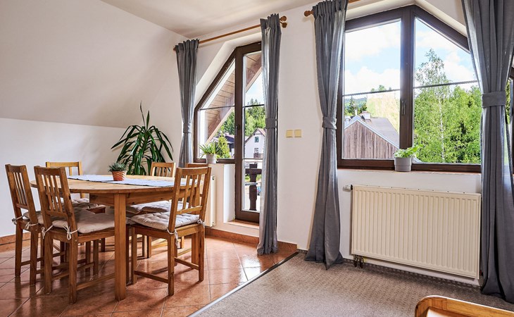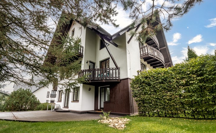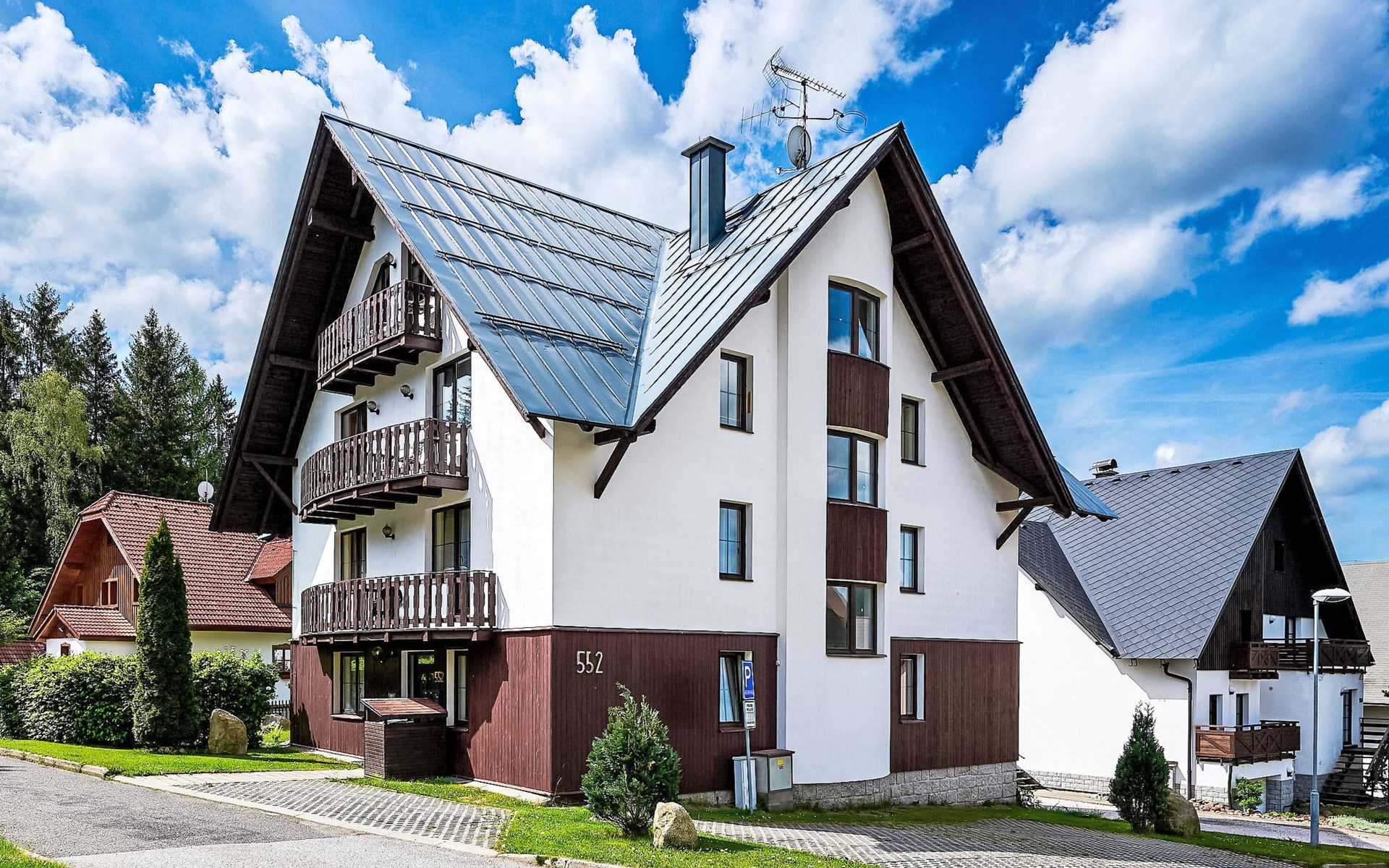 Mehrfamilienhaus 700 m.ü.M., auf 4 Stockwerken. 3 Wohnungen im Ferienhaus. Im Ortsteil Klondajk, 300 m vom Zentrum von Harrachow, in einem Wohnquartier, 25 km vom See, 500 m vom Skigebiet. Im Hause: Skiraum. Parkplatz beim Haus, Einzelgarage (extra). Einkaufsgeschäft, Supermarkt, Restaurant 150 m, Bushaltestelle "Harrachov, sklárna" 600 m, Bahnstation "Harrachov, Mýtiny" 3 km, Grasstrand 25 km, Freibad 1 km, Hallenbad 1 km. Golfplatz (9 Loch) 3.5 km, Tennis 2 km, Tennishalle 3 km, Skilift 500 m, Sessellift 500 km, Skipisten, Skiverleih 500 m, Skibushaltestelle 10 m, Skischule 500 km, Kinderskischule, Kinderspielplatz 500 m. Nahe gelegene Sehenswürdigkeiten: Mumlava vodopád 2.5 km, Kořenov 8 km, Jizerka 15 km, Jablonec nad Nisou 29 km, Liberec, Ještěd 40 km, Termy Cieplickie (Pl) 30 m. Bekannte Skigebiete sind gut erreichbar: Harrachov 1 km, Příchovice 10 km, Rokytnice nad Jizerou 15 km. Wandergebiete: Western City(Pl) 40 km, Karpacz Wang,Park miniatury Kowary (Pl) 44 km, Giganteria Piechowice 23km, Dinopark(Pl) 15 km. Garage auf Anfrage. Die Gästekarte HARRACHOV CARD ist im Preis inbegriffen.