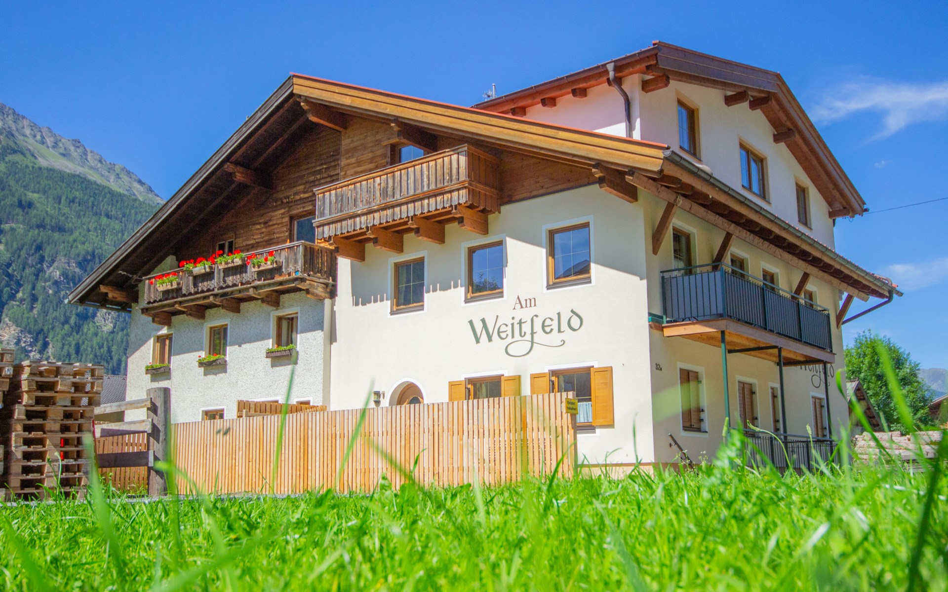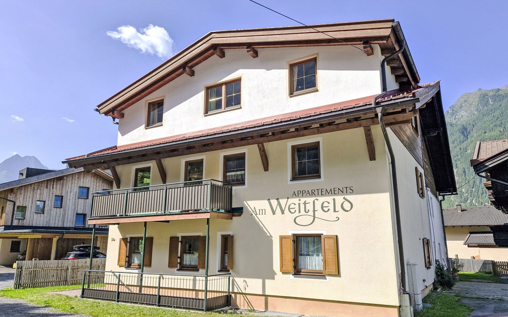 Komfortables Landhaus "Am Weitfeld", einseitig angebaut. Im Ortsteil Dorf, ruhige, sonnige Lage, verkehrsberuhigte Zone. Zur Mitbenutzung: naturbelassenes Grundstück. Sitzplatz. In der Anlage: Einstellraum für Fahrräder, Skiraum, Zentralheizung, Skischuhtrockner. Parkplatz beim Haus. Einkaufsgeschäft 2 km, Supermarkt 2 km, Restaurant 2 km, Bushaltestelle "Längenfeld-Espan" 500 m, Bahnstation "Ötztal Bahnhof" 25 km, Thermalbad "AQUA DOME" 3 km. Tennishalle 3 km, Reitstall 3 km, Gondelbahn 12 km, Skisportanlagen 12 km, Skibushaltestelle 50 m, Skischule 2 km. Nahe gelegene Sehenswürdigkeiten: Outdoor Park 'Area 47' in 26 km. Bekannte Skigebiete sind gut erreichbar: Sölden 12 km. Bitte beachten: Der Besitzer akzeptiert keine Jugendgruppen. Gratis Skibus. Der gratis Skibus fährt zum Skigebiet Sölden. Besitzer nutzt Räume im Haus.