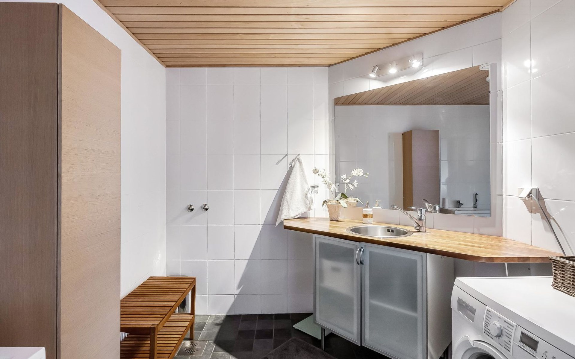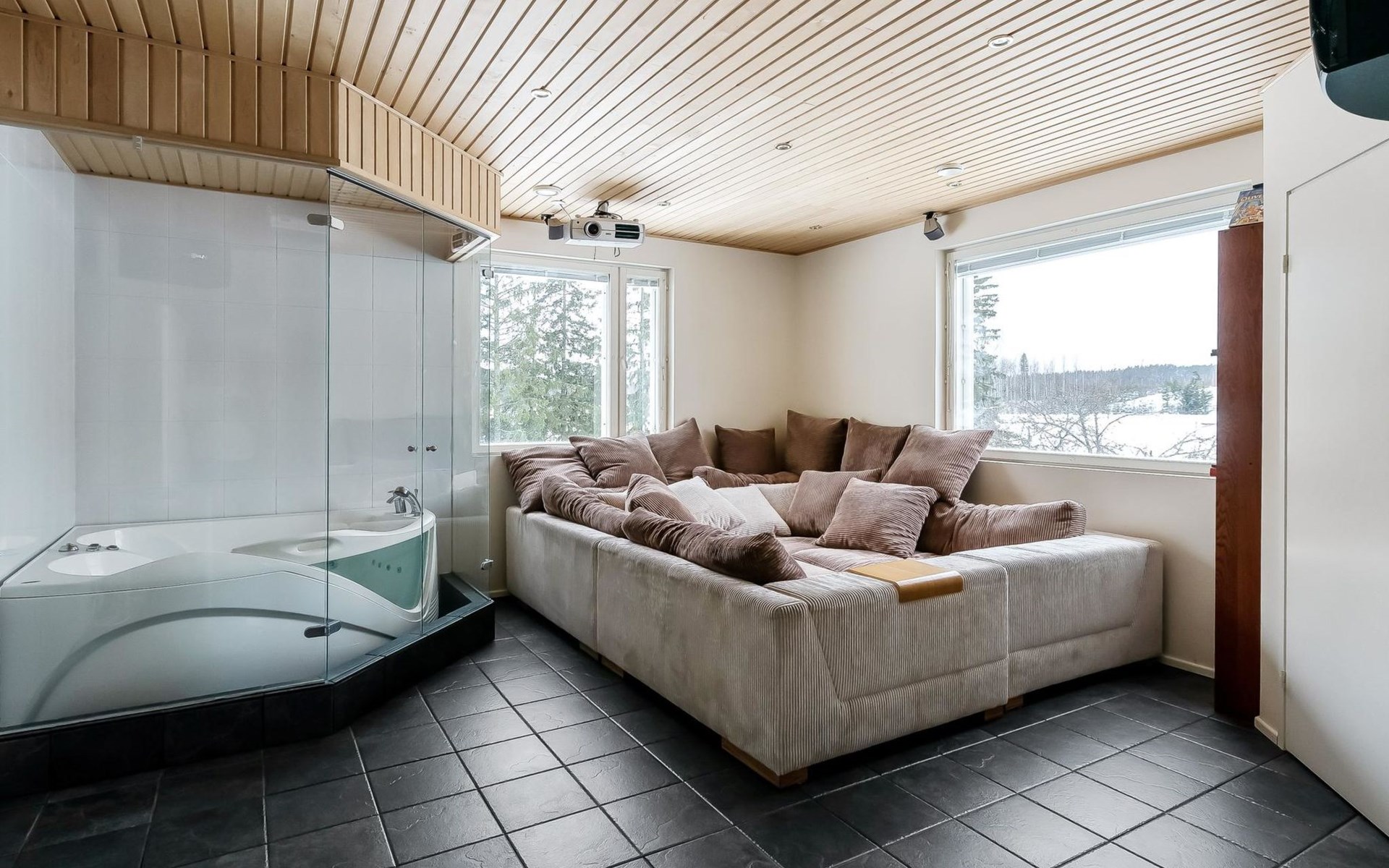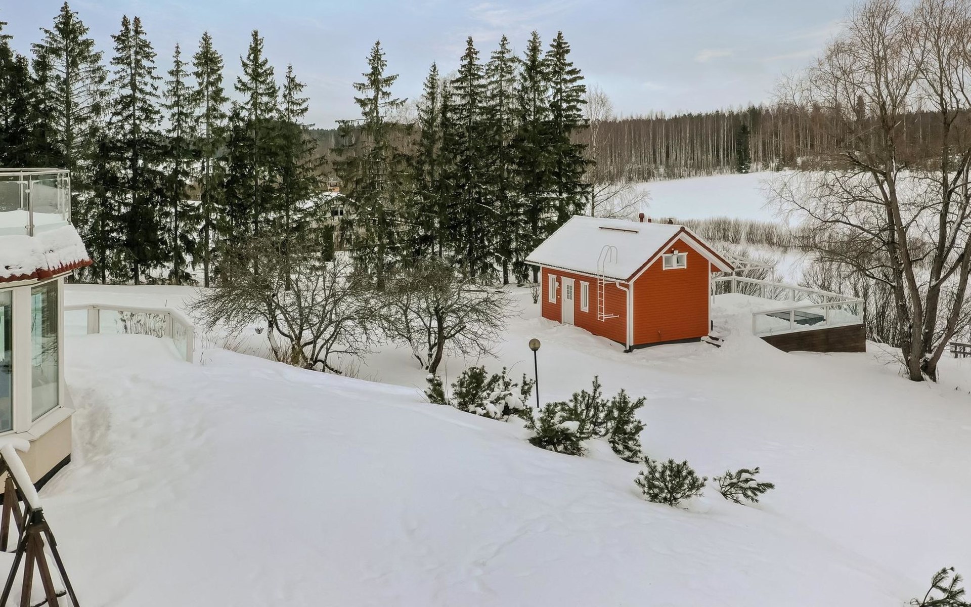 55 km nördlich von Helsinki, Fluss Mustijoki 30 m (Breite 20 m vor der Villa), tiefer und weicher Lehmboden, am Ende der Anlegestelle tiefer Boden, Boot, elektrischer Aussenborder. 2-stöckige Steinvilla, Baujahr 2004, im Erdgeschoss Küche, grosses Wohnzimmer (Kamin), Bibliothek mit 2 Betten, Raum mit Whirlpool, Sauna (Elektroherd), Waschraum (2 Duschen), Ankleideraum, Toilette. Von der Sauna gibt es Ausgang zur Terrasse, Eingangshalle. Im Obergeschoss Wohnbereich (mit Schlafcouch), Hauptschlafzimmer mit Doppelbett, 2 Schlafzimmer mit je 2 Betten, Schlafzimmer mit 4 Betten und Kinderetagenbett, Toilette, Balkon. Separate Ufersauna (25 m²), Ankleidezimmer (mit Schlafcouch und kleiner Küchenzeile), Duschbad, Dampfbad (Holzofen), Dachbodenraum mit Matratzen (hauptsächlich für Kinder geeignet, steile Treppe, die geöffnet werden muss), grosse Terrassenbereiche. Auf der Terrasse der Sauna kann Whirlpool im Freien gemietet werden (ganzjährig verfügbar). Die Miete beträgt € 100/Buchungszeitraum. Wenn Sie den Whirlpool buchen wollen, fügen Sie bitte bei der Buchung die Zusatzleistung "Whirlpool" hinzu. Hochgeschwindigkeit-Internetzugang (100 MB), 5 Fernseher, Videoprojektor, Karaoke-Anlage, Heimkino, ca. 200 DVDs (die meisten auf Englisch), Klavier, Spielgeräte und Trampolin im Hof. Gasgrill. Moderne elegante Villa, an einem kleinen Fluss, inmitten fruchtbarer Ackerlandschaften in Mäntsälä, nur eine halbe Autostunde von Helsinki entfernt. Der Hof ist geräumig, hell und grasbewachsen. Es gibt 2 Geschirrspüler und 2 Kamine. Verpflegungsdienst nach Vereinbarung/gegen Aufpreis in der Nachbarschaft. Nach Absprache/zu einem anderen Preis ist es möglich mehr als 12 Personen unterzubringen, dies muss jedoch vor der Reservierung angefragt werden. Die maximale Personenzahl (12 Personen) darf nicht überschritten werden, ohne dass Sie vor der Buchung nachfragen und den Aufpreis zahlen. Helsinki-Sehenswürdigkeiten 55 km, Lahti (z.B. die Sibelius-Halle, Konzerte) 50 km, Hyvinkää 30 km, Porvoo (z.B. die idyllische Altstadt und die Kathedrale) 40 km, Järvenpää (z.B. das Sibelius-Ainola-Hausmuseum) 30 km, Mäntsälä 9 km, Talma und Messilä Skipisten 50 km. Hinweis! Der Eigentümer wird am Anreisetag eine Kaution, in Höhe von € 150 (in bar), verlangen. Er wird diese Kaution wieder zurückerstatten, wenn nach dem Urlaub alles in einwandfreiem Zustand ist und die Endreinigung gemäss den Buchungsbedingungen von Lomarengas erfolgt ist. Die Endreinigung kann als zusätzliche Dienstleistung gebucht werden. Bei Bedarf ist auch eine vollständige Endreinigung zum Preis von € 350 verfügbar. Wenn Sie eine vollständige Endreinigung buchen wollen, wenden Sie sich bitte an unser Vertriebsbüro. Die vollständige Endreinigung beinhaltet auch das Abwaschen des Geschirrs und das Entfernung des Mülls.