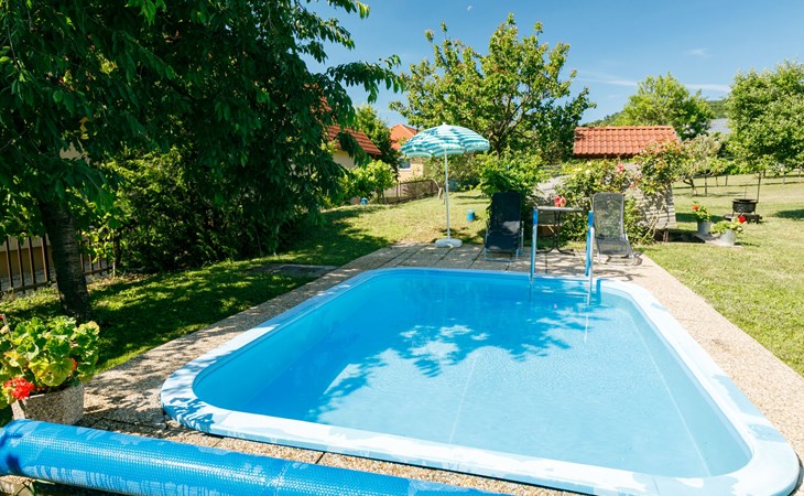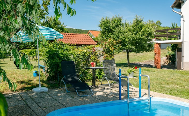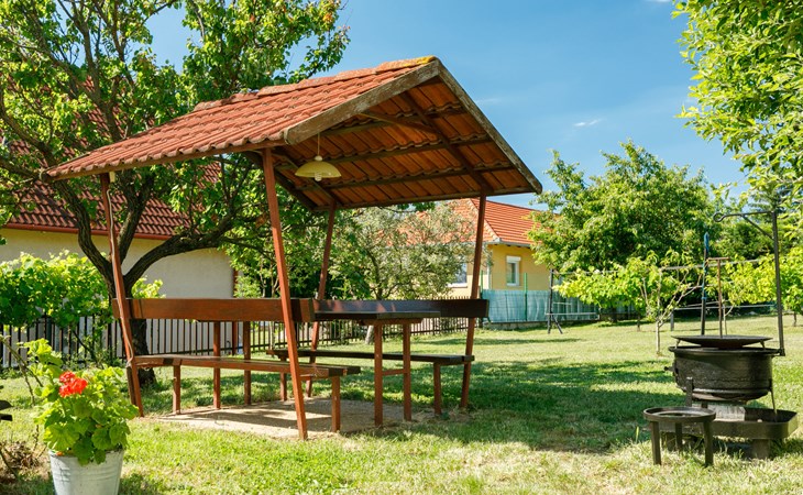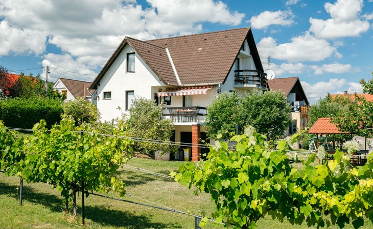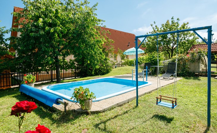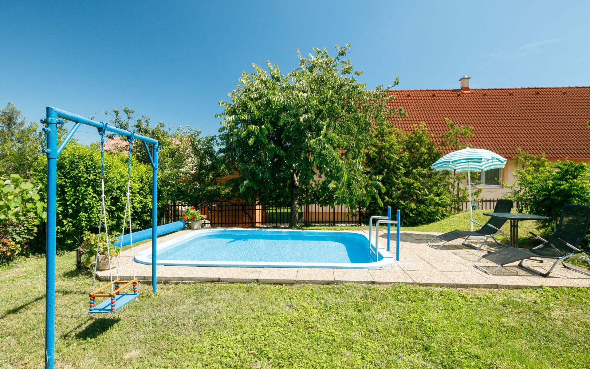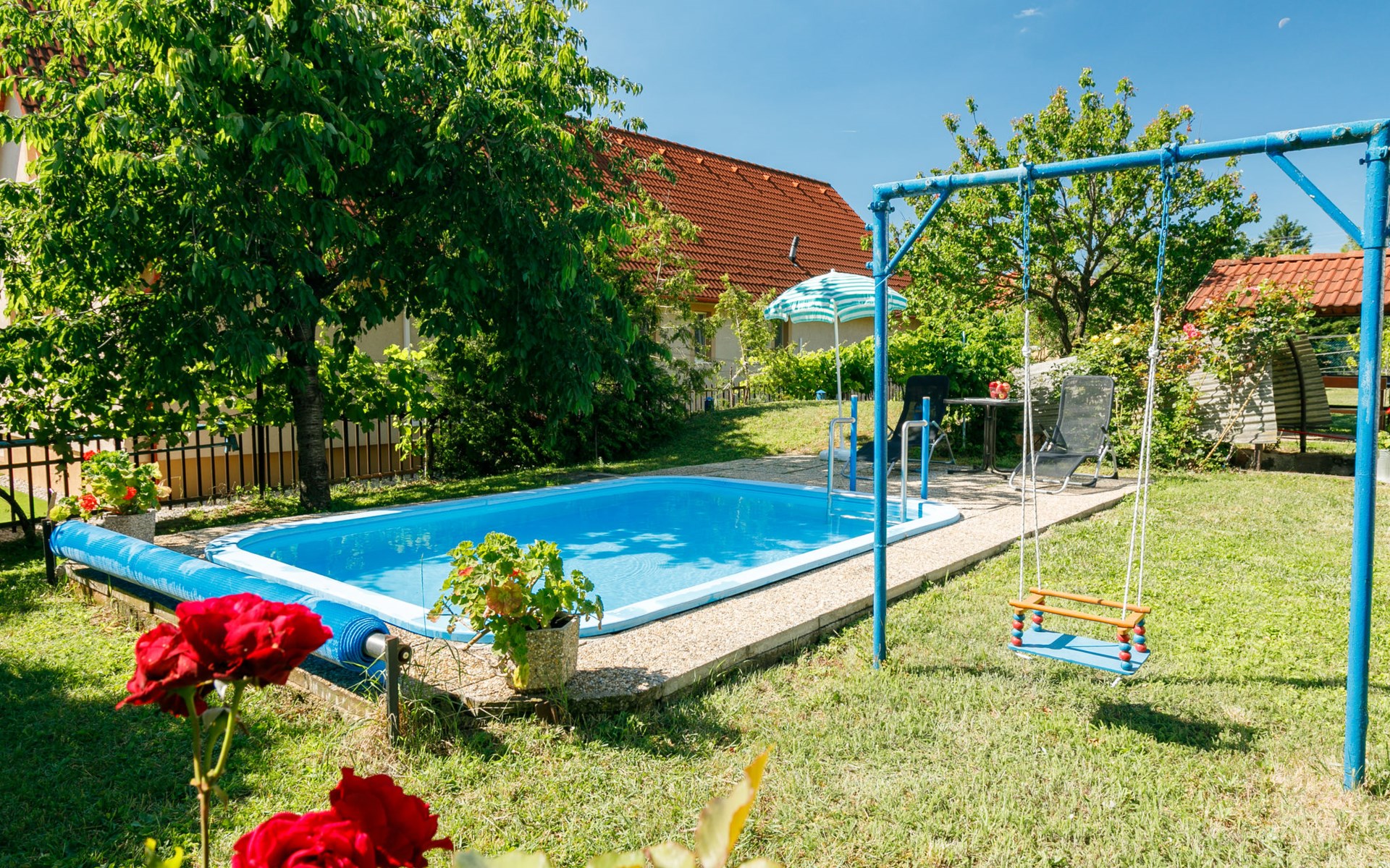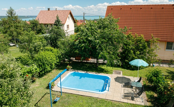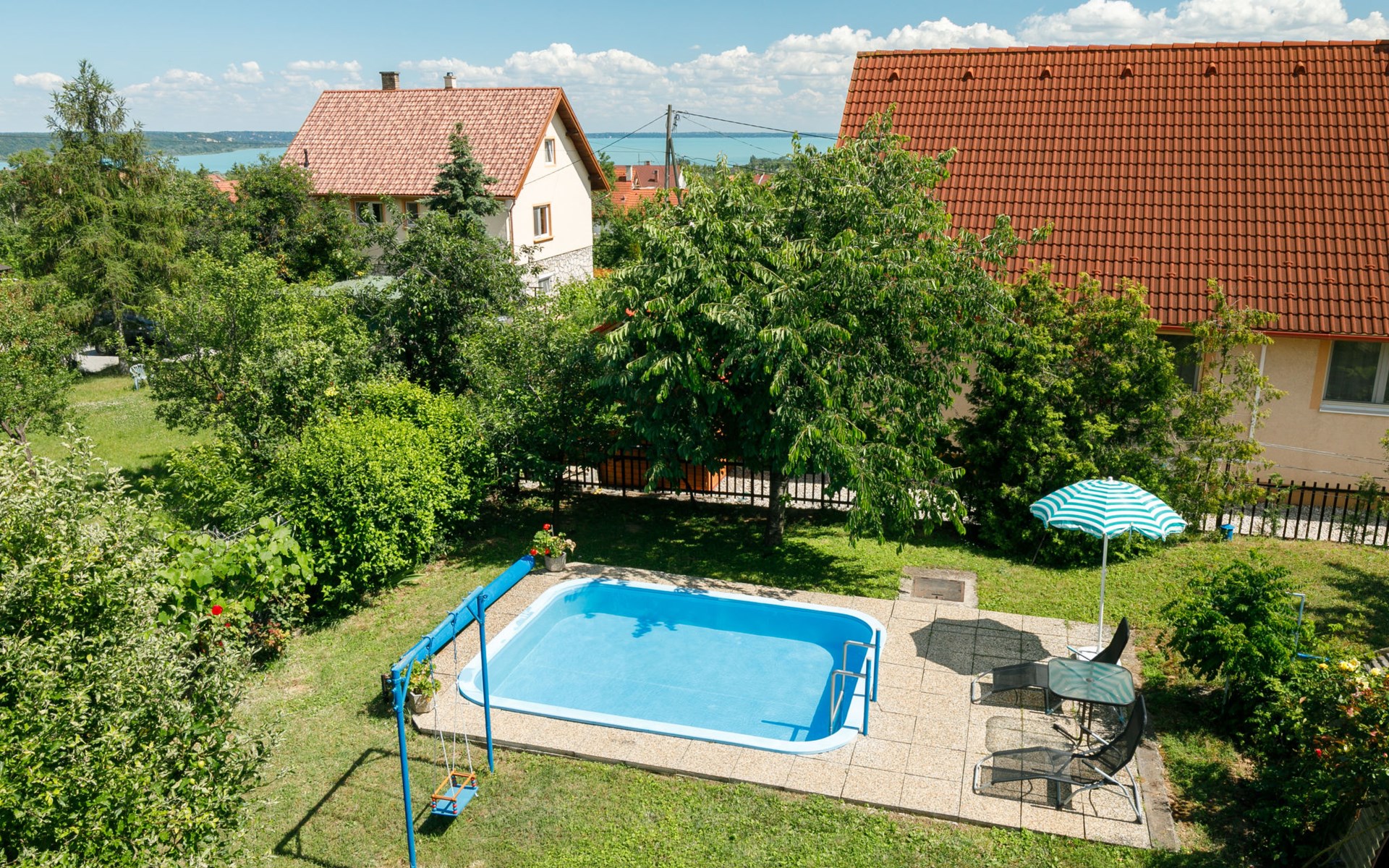 Balatonalmádi 16 km von Balatonfüred: Einfamilienhaus "Antal". 1.2 km vom Zentrum von Balatonalmadi, 7 km vom Zentrum von Balatonfüzfö, 17 km vom Zentrum von Balatonfüred, am Hang, in einem Wohnquartier, 2 km vom See, 3.2 km vom Strand, in einer Sackgasse. Zur Alleinbenutzung: Grundstück 1'400 m2 (eingezäunt) mit Bäumen, Wiese, Schwimmbad (4 x 3 m, 90 cm tief, saisonale Verfügbarkeit: 15.Mai. - 30.Sep.). Kinderspielplatz (Schaukel). Abstellraum vorhanden. Parkplatz (für 3 Autos) auf dem Grundstück. Lebensmittelgeschäft 300 m, Supermarkt 2.4 km, Restaurant 300 m, Grasstrand 2 km, Thermalbad "Hévíz" 88 km. Tennis 2.5 km, Reitstall 650 m, Sportzentrum 1.2 km, Radweg 2.5 km, Kinderspielplatz 1 km. Nahe gelegene Sehenswürdigkeiten: Veszprém Zoo 19 km, Balatonibob Leisure Park 4 km, Balatonfüred Annagora Aquapark 18 km, Tihany 24 km, Balaton Golf Club 28 km, Folly Arboretum 53 km.