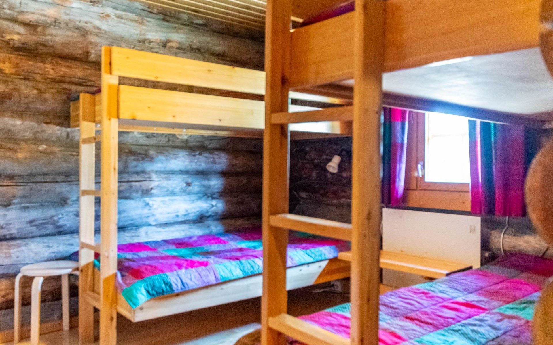 The cottage has two bedrooms, each with two bunk beds. The lower bed is 100 cm wide and the upper bed 80 cm, with 17 cm thick mattresses. In the room with fireplace there is a convertible bunk.