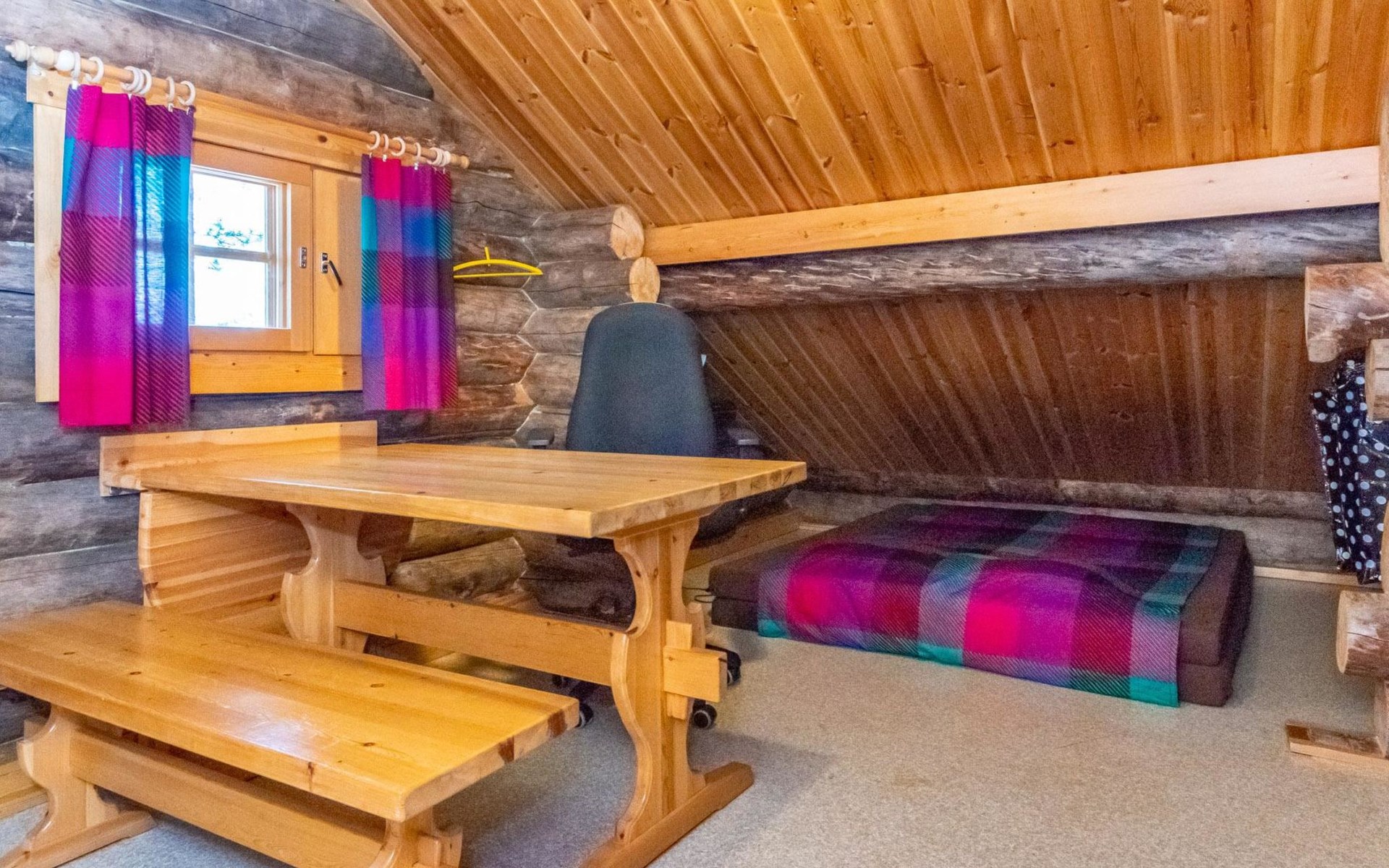 The loft above the room with fireplace has a window, free floor space and a child gate to keep children safe when playing there. Steep stairs to the loft.