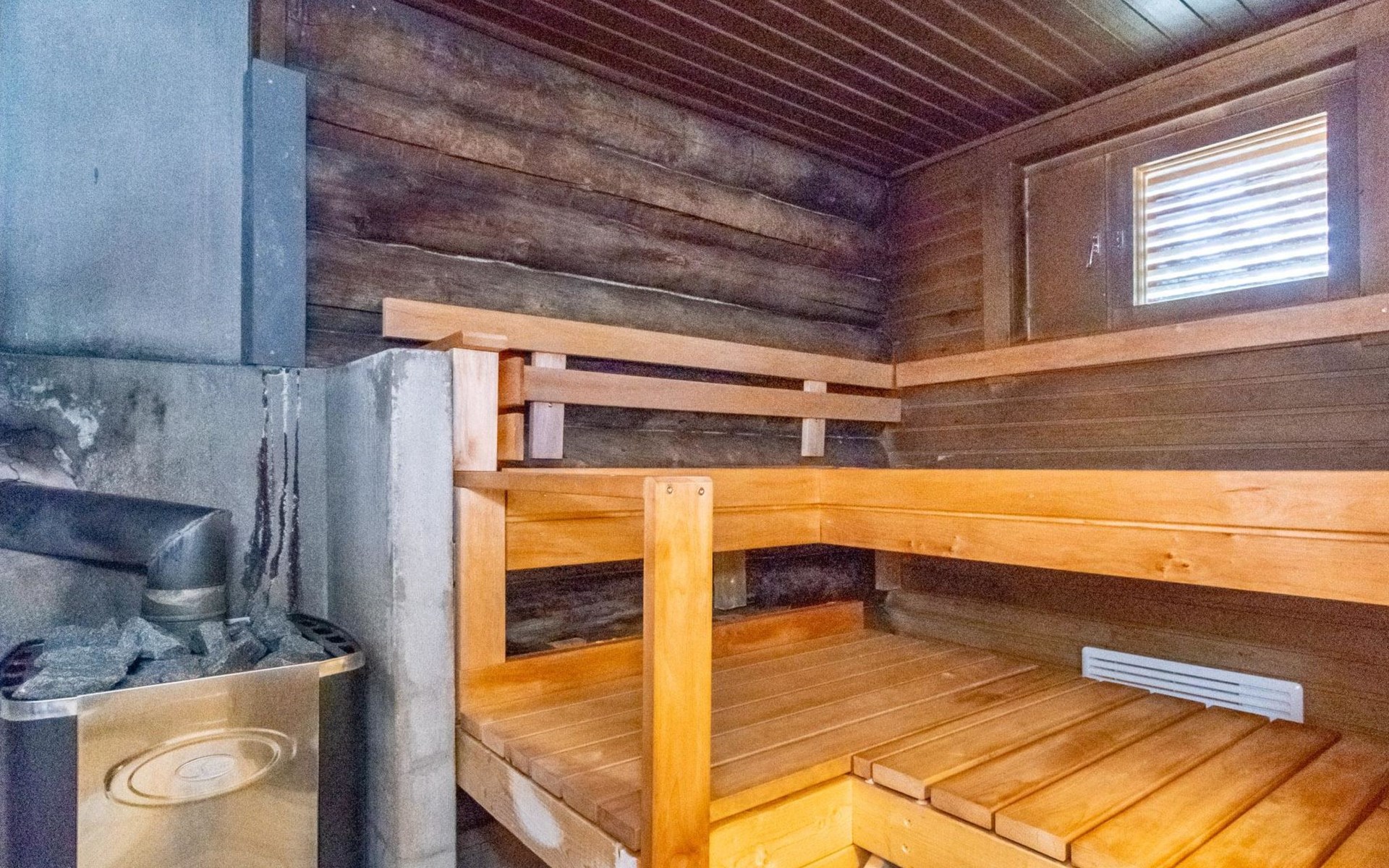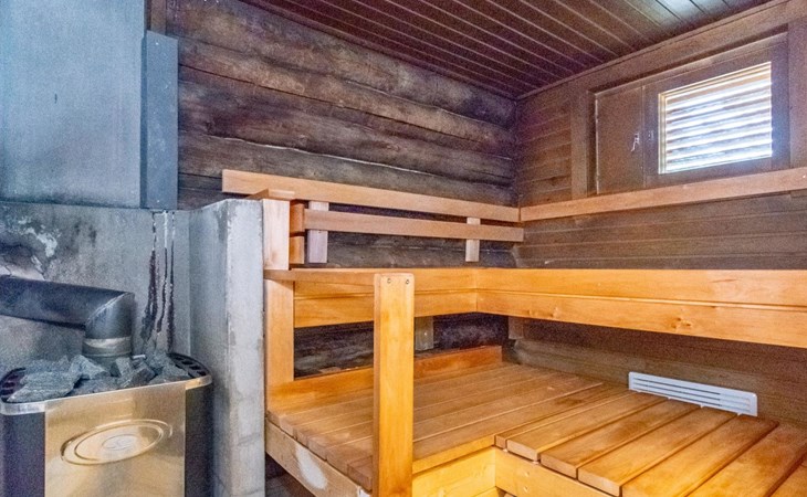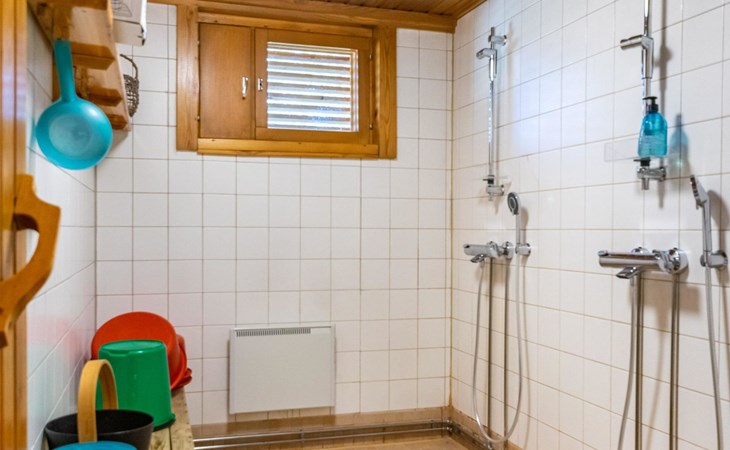 The wood-fired sauna is spacious and the benches are child-friendly. The tiled washroom has two showers and a toilet. There is also a separate toilet.
