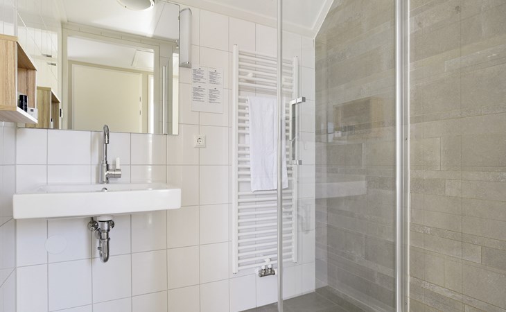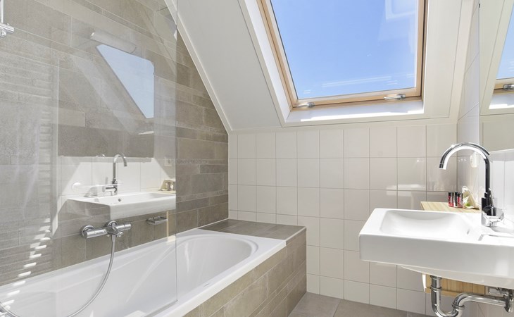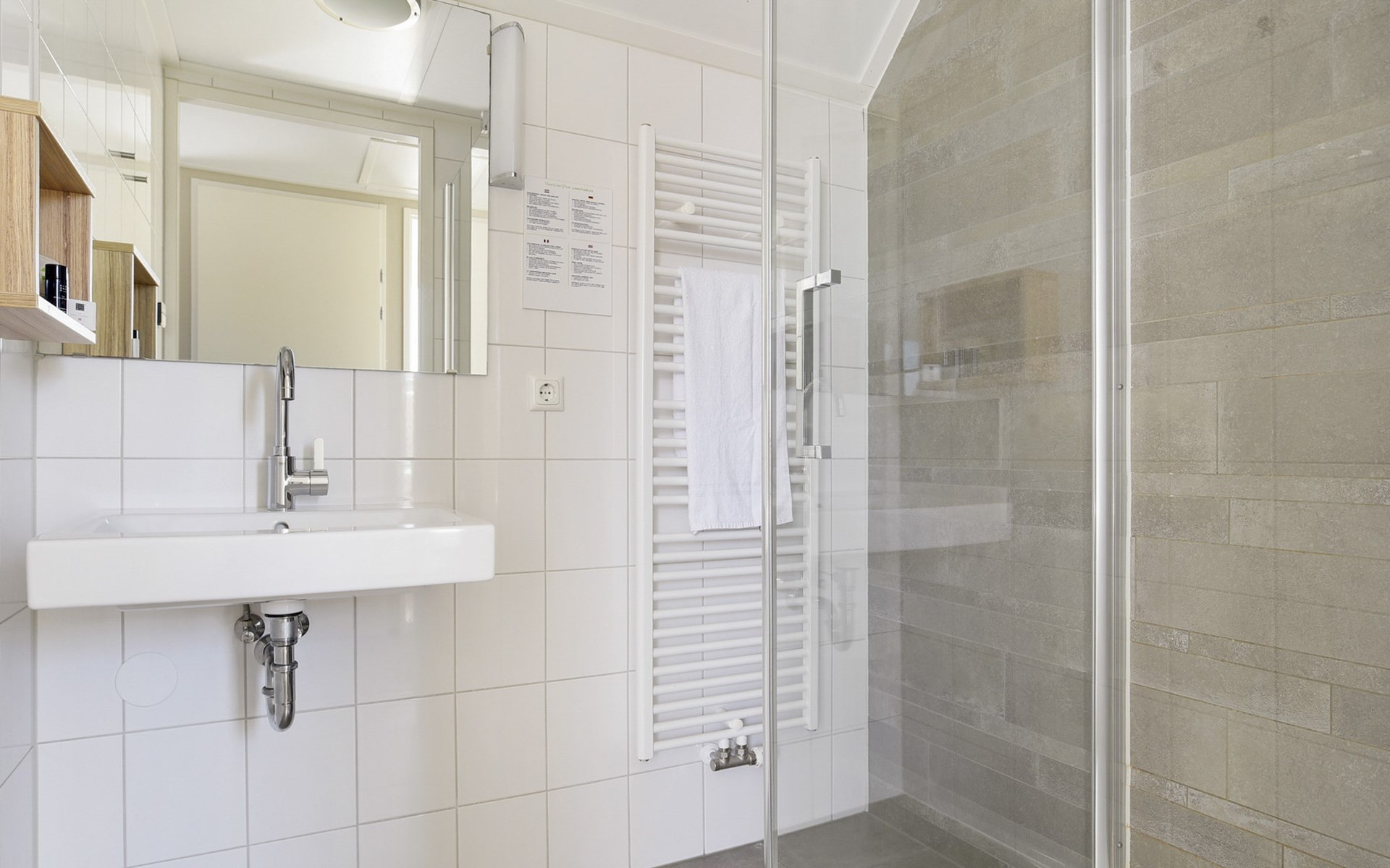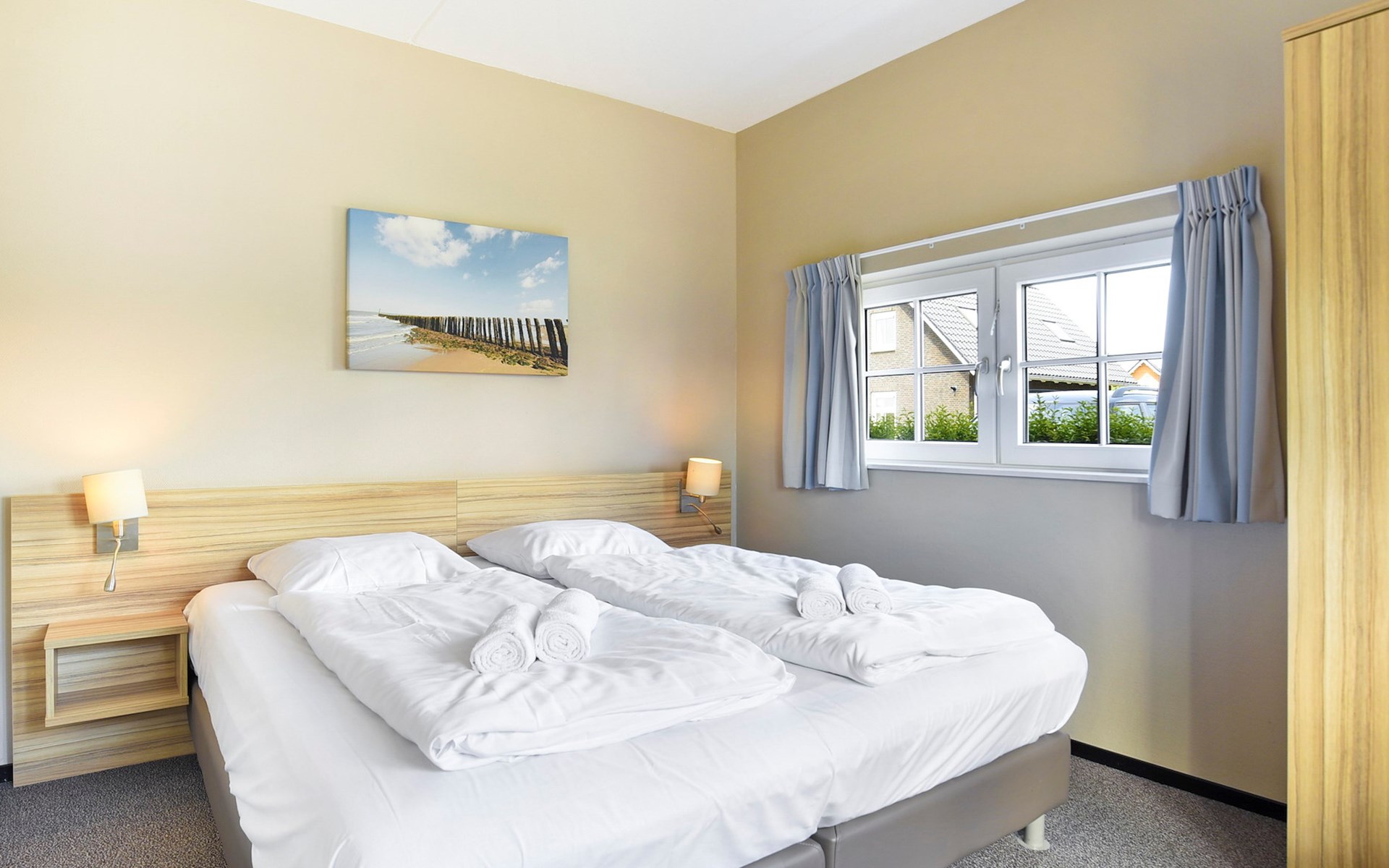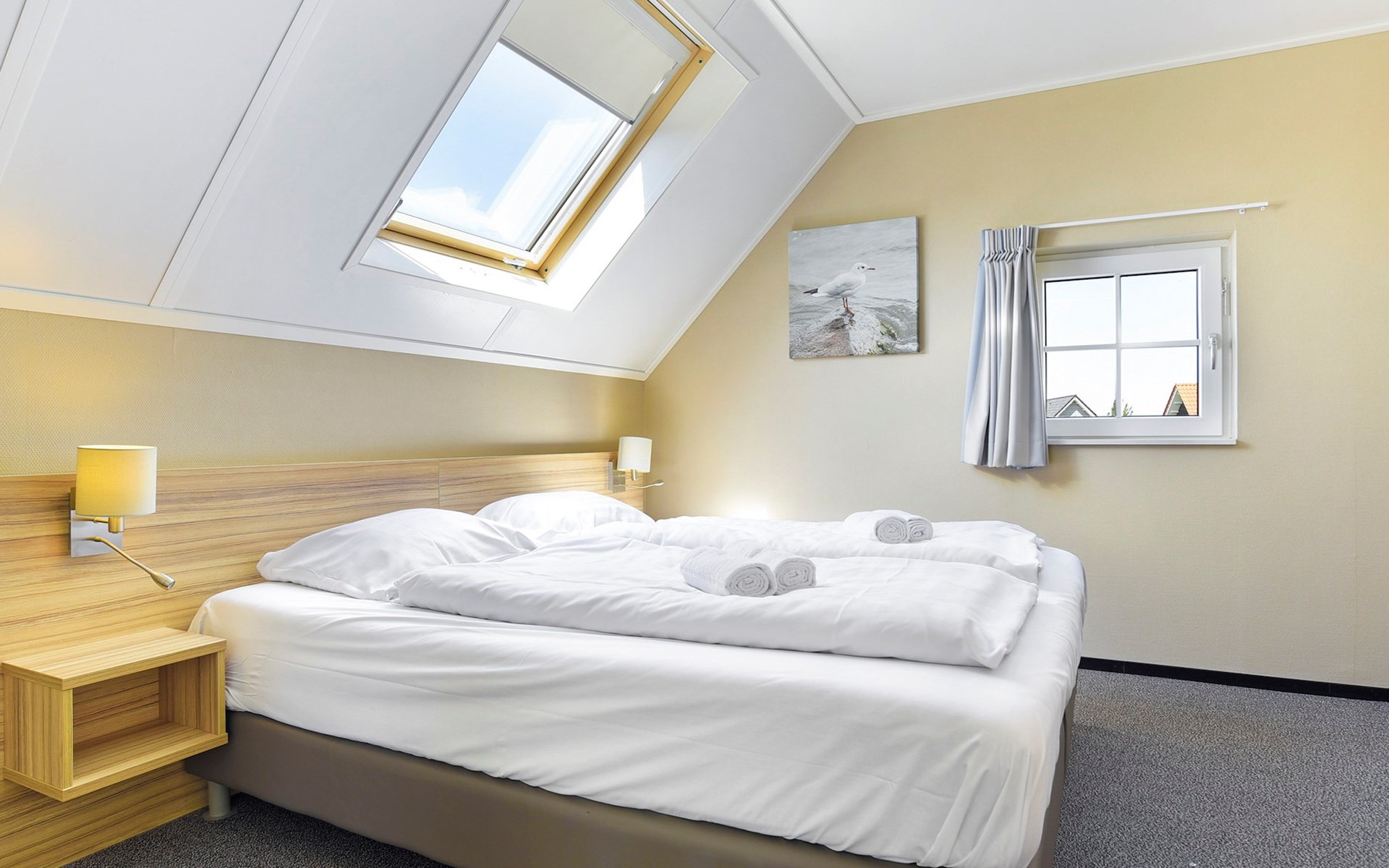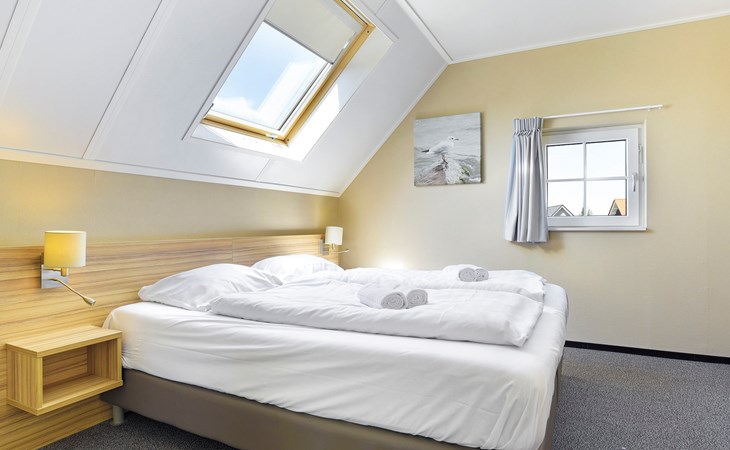 Im Erdgeschoss befinden sich 2 Schlafzimmer mit je 2 Einzel-Boxspringbetten, wobei die Betten in 1 Schlafzimmer als Doppelbett aufgestellt sind. Ein Schlafzimmer im Erdgeschoss ist mit einem Fernseher ausgestattet. Außerdem gibt es ein Badezimmer mit Dusche und Waschbecken im Erdgeschoss und eine separate Toilette.