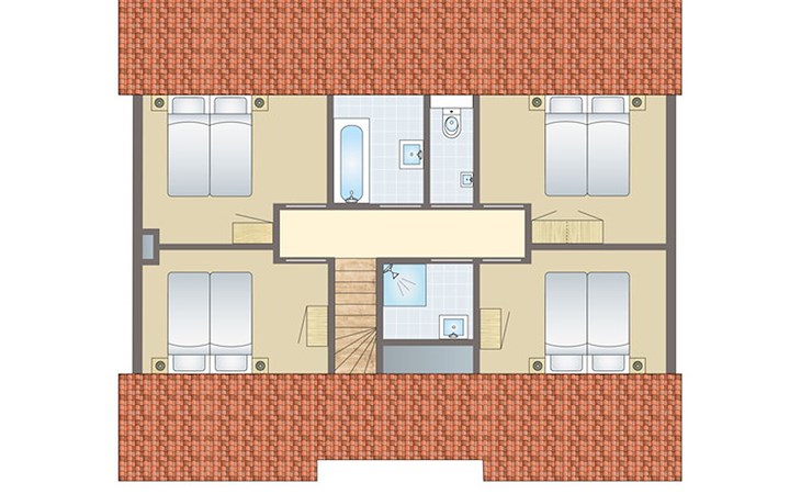 In der ersten Etage gibt es 4 Schlafzimmer mit je 2 Einzel-Boxspringbetten, wobei die Betten in 1 Schlafzimmer als Doppelbett aufgestellt sind. Außerdem finden Sie in der ersten Etage 2 Badezimmer. Ein Badezimmer hat eine Badewanne, eine Dusche und ein Waschbecken. Das andere Badezimmer hat eine Dusche und ein Waschbecken. Außerdem gibt es eine separate Toilette in der ersten Etage.