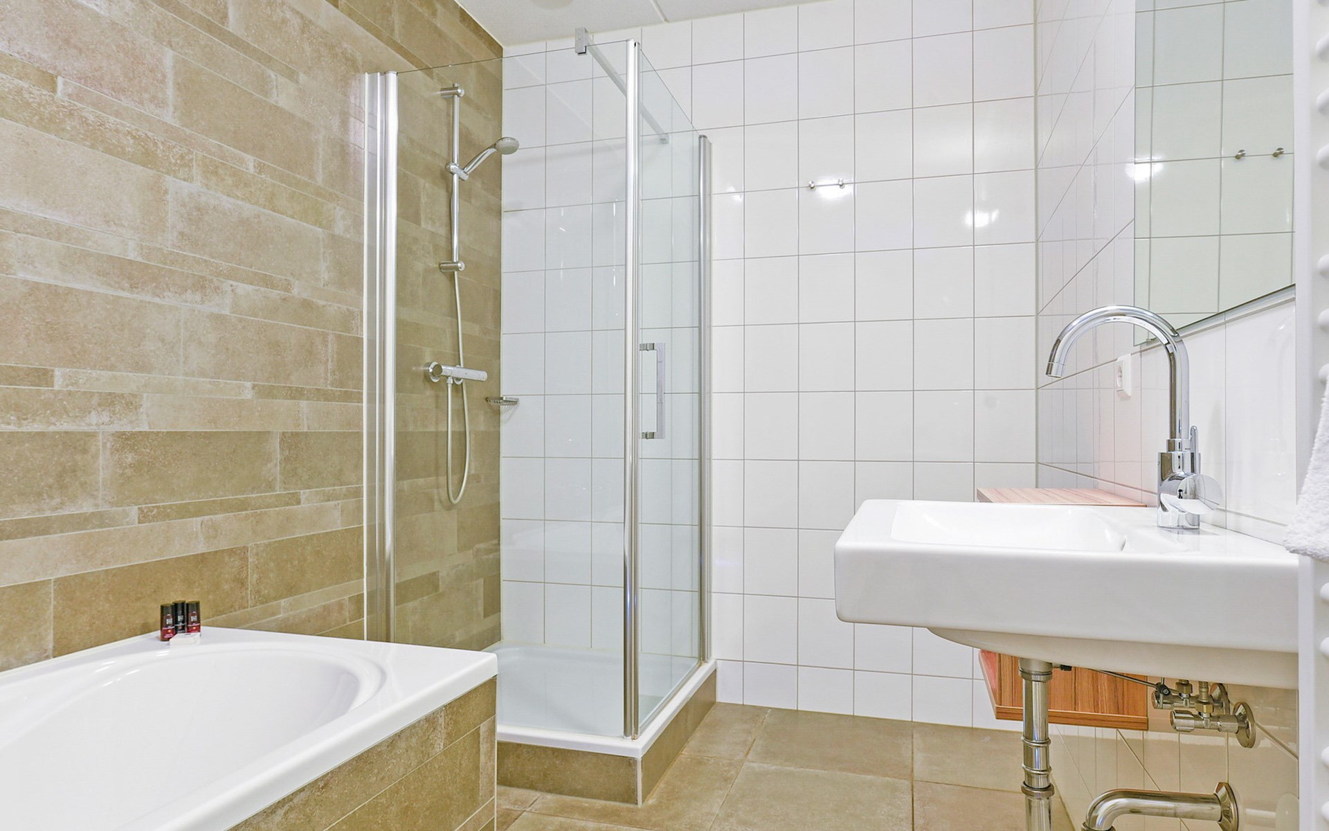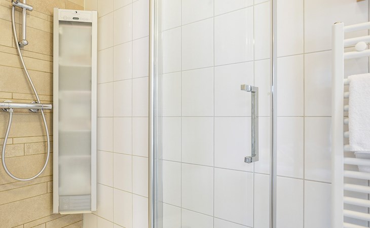 Ebenfalls im Erdgeschoss befindet sich 1 Schlafzimmer mit 2 Einzel-Boxspringbetten, die als Doppelbett aufgestellt werden können, und einen Fernseher. Das Schlafzimmer im Erdgeschoss verfügt über ein En-Suite-Badezimmer mit Dusche und Waschbecken. Es gibt ebenfalls eine separate Toilette.