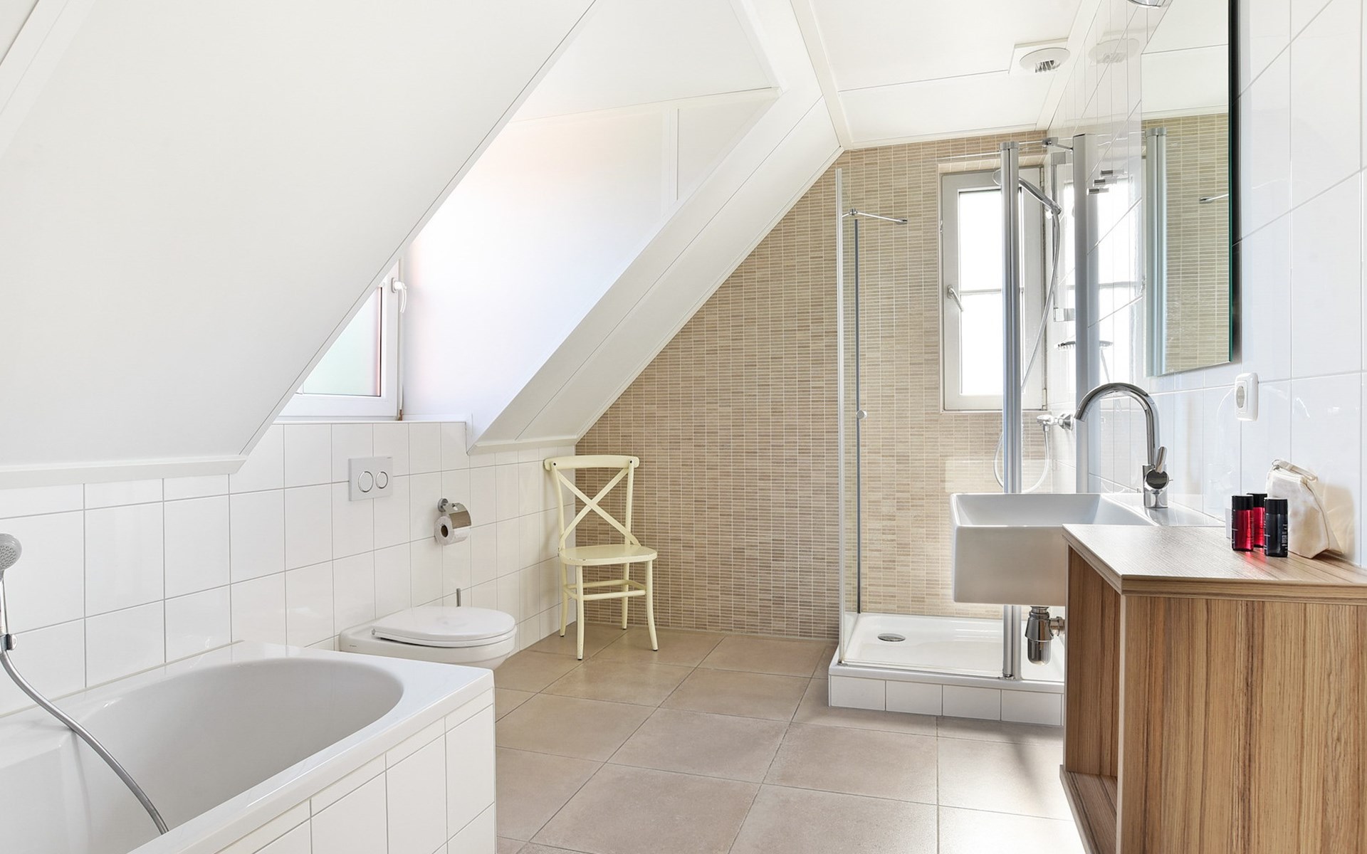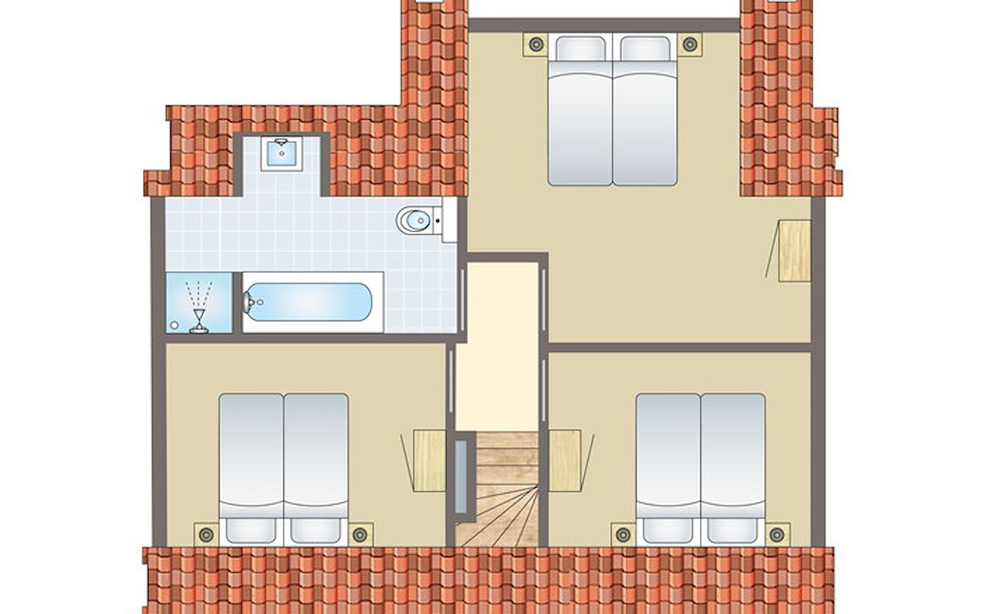 In der ersten Etage befinden sich 3 Schlafzimmer mit jeweils 2 Einzel-Boxspringbetten. Außerdem gibt es in der ersten Etage ein Badezimmer mit Badewanne, Dusche, Waschbecken und Toilette.