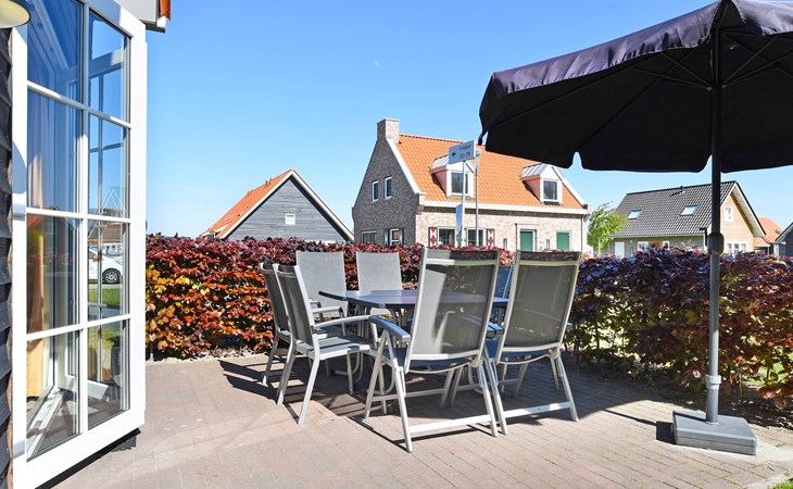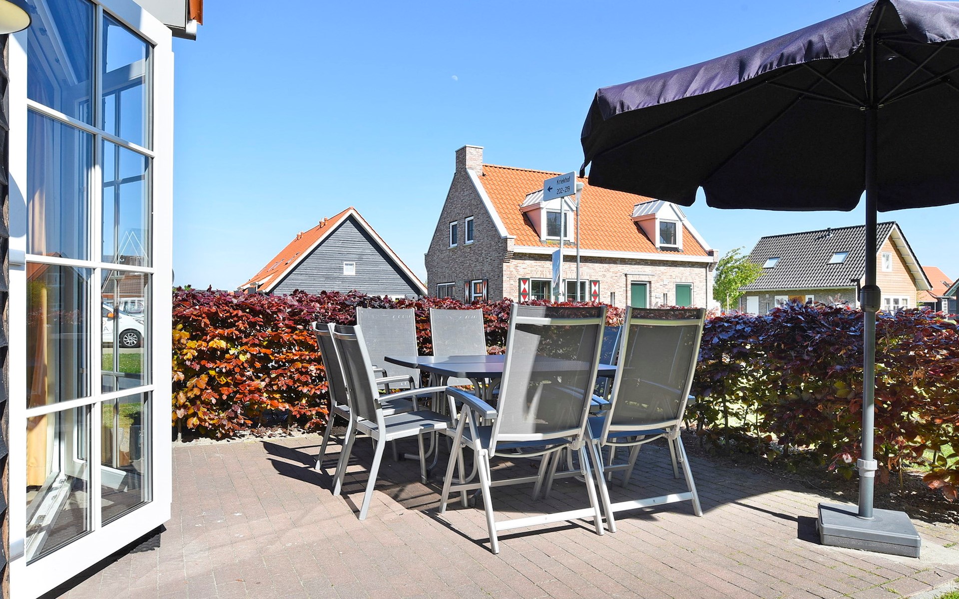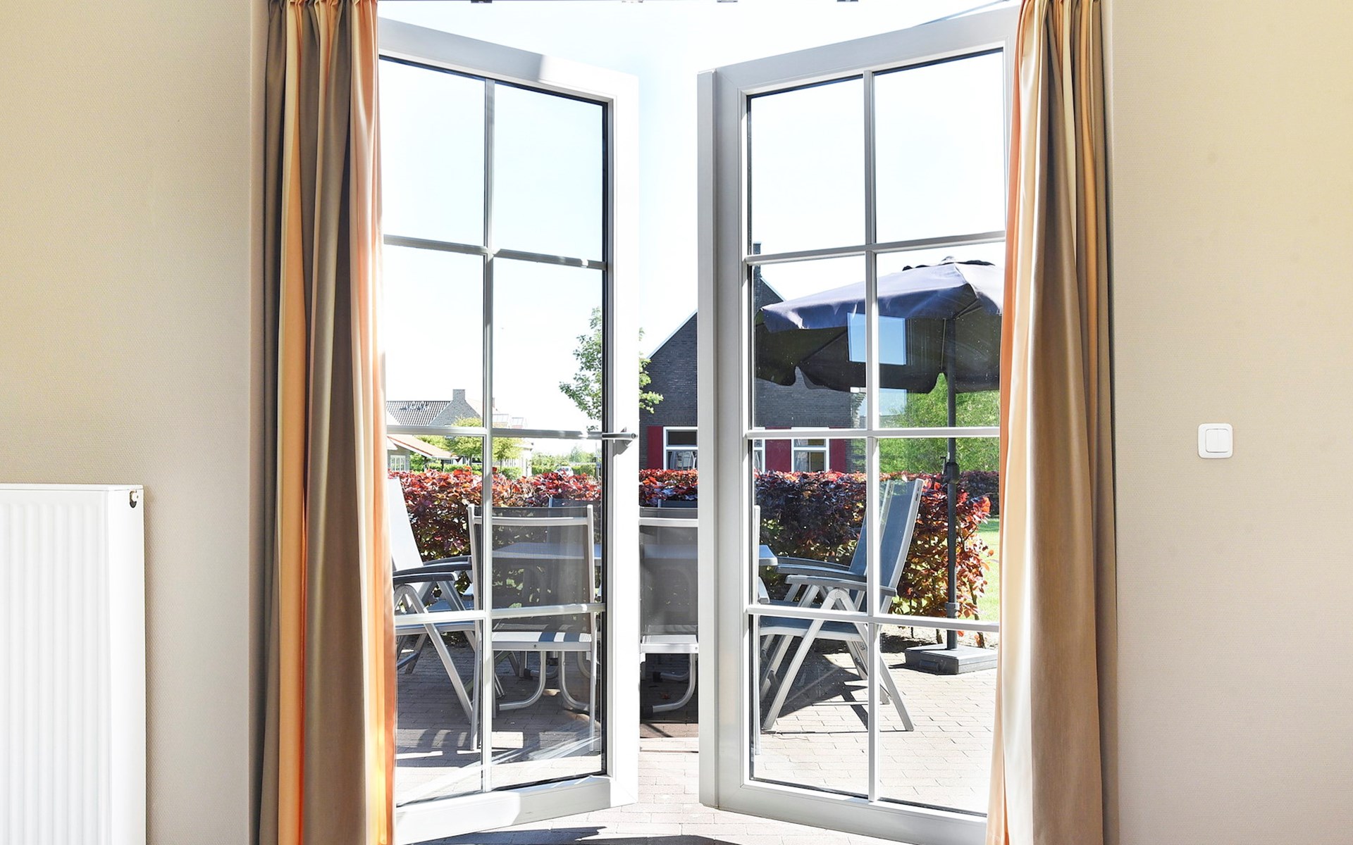 Durch die Flügeltüren im Wohnzimmer gelangen Sie in den Garten mit einer möblierten Terrasse. Außerdem gibt es einen geräumigen Abstellraum an der Vorderseite des Ferienhauses, in dem Sie z.B. Ihre Fahrräder unterbringen können.