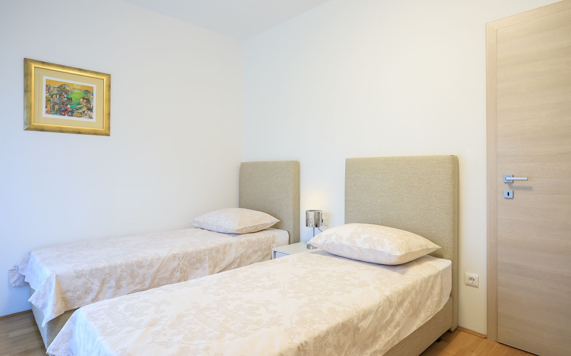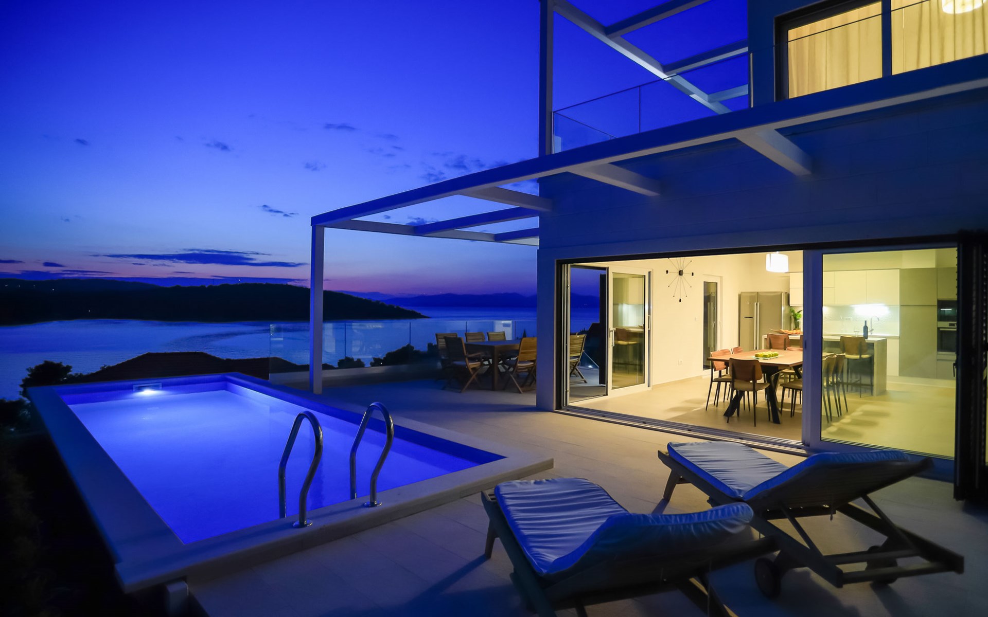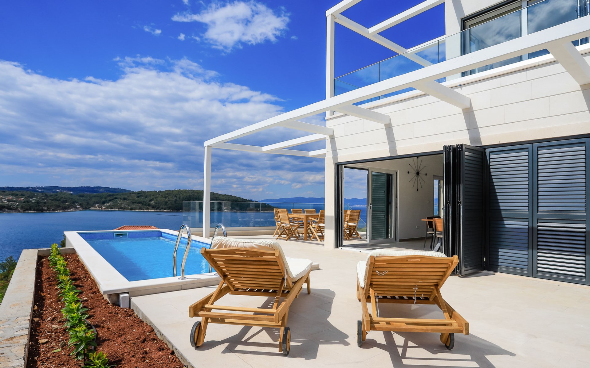 Einfamilienhaus "Jakša", auf 2 Stockwerken, Baujahr 2019. Ruhige, sonnige, erhöhte Lage, 200 m vom Meer, 200 m vom Strand. Zur Alleinbenutzung: Grundstück 450 m2, Schwimmbad eckig, beheizt (8 x 2 m, 20 m2, 150 cm tief, saisonale Verfügbarkeit: 01.Mai. - 01.Okt.). Aussendusche, Terrasse (60 m2), Gartenmöbel. Im Hause: Internetzugang, Waschmaschine, Wäschetrockner. Zur Verfügung: Fahrräder (3). Parkplatz (für 2 Autos) beim Haus auf dem Grundstück. Einkaufsgeschäft 5 km, Restaurant 250 m, Bushaltestelle 550 m, Kieselstrand 500 m, Felsstrand 200 m. Einkaufsgeschäft 850 m (15.06.-15.09.). Schwimmbad beheizt (extra).