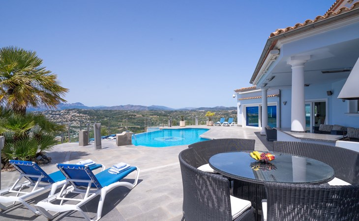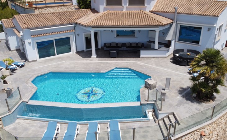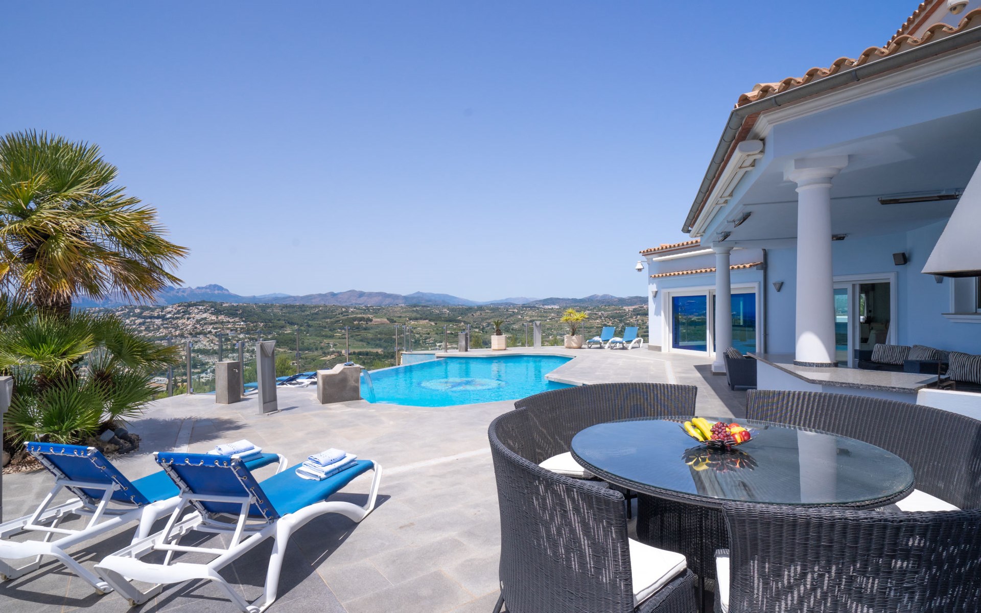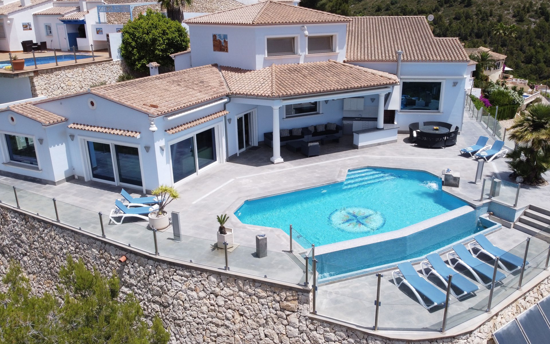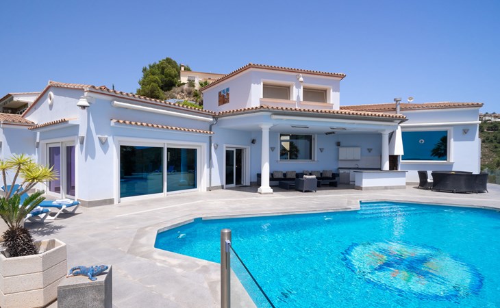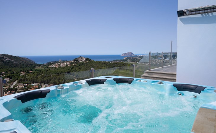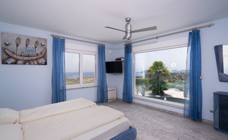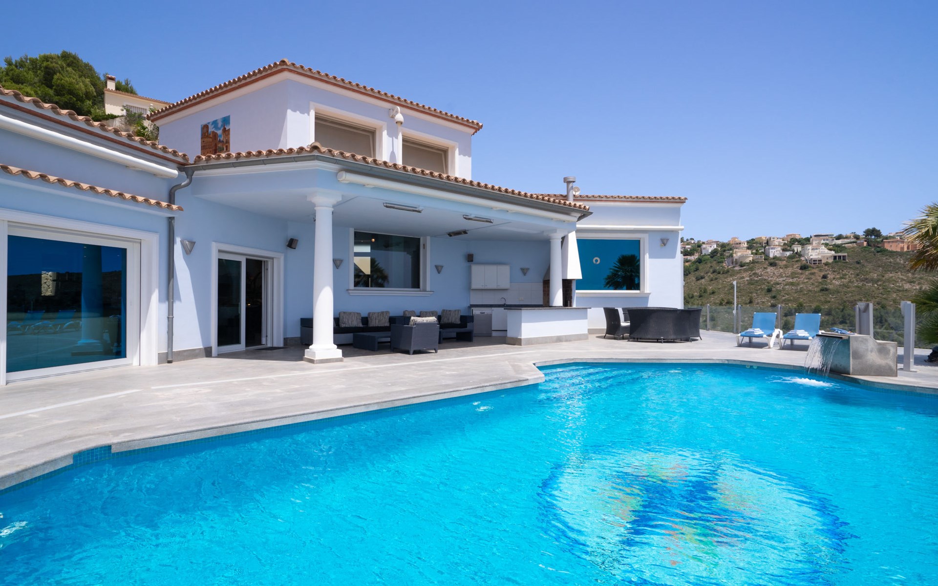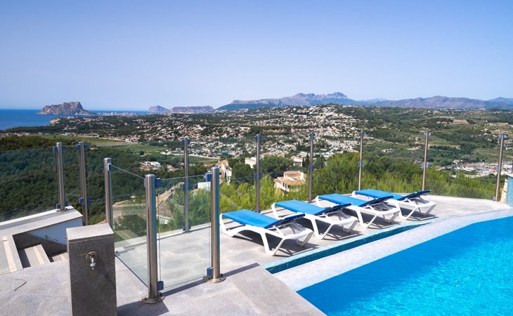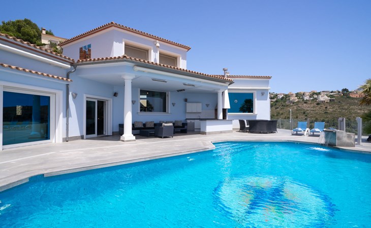 Golden Valley: Sehr moderne, luxuriöse Finca "Finca Edel", auf 2 Stockwerken. 4.5 km vom Zentrum von Moraira, ruhige, sonnige, erhöhte Lage, 4.5 km vom Meer, in einer Sackgasse. Zur Alleinbenutzung: Grundstück 1'200 m2 (eingezäunt), Schwimmbad nicht einsehbar (50 m2, saisonale Verfügbarkeit: 01.Jan. - 31.Dez.) mit Innentreppe. Terrasse, Gartenmöbel, Grillhaus. Im Hause: Sauna, Sprudelbad (alles inkl.), Zentralheizung, Klimaanlage, Waschmaschine, Wäschetrockner. Supermarkt 1.3 km, Restaurant 1.3 km, Bar 1.3 km, Bushaltestelle "Moraira" 4.9 km, Bahnstation "Teulada" 7.1 km, Fähre "Denia" 22.7 km, Sandstrand "Playa L'Ampolla" 5.4 km. Golfplatz (18 Loch) 9 km. Der Besitzer akzeptiert keine Jugendgruppen.