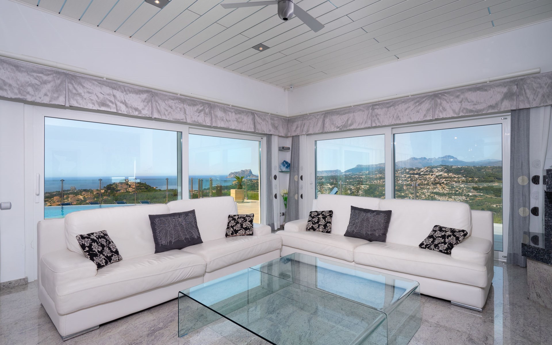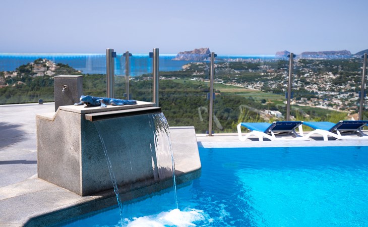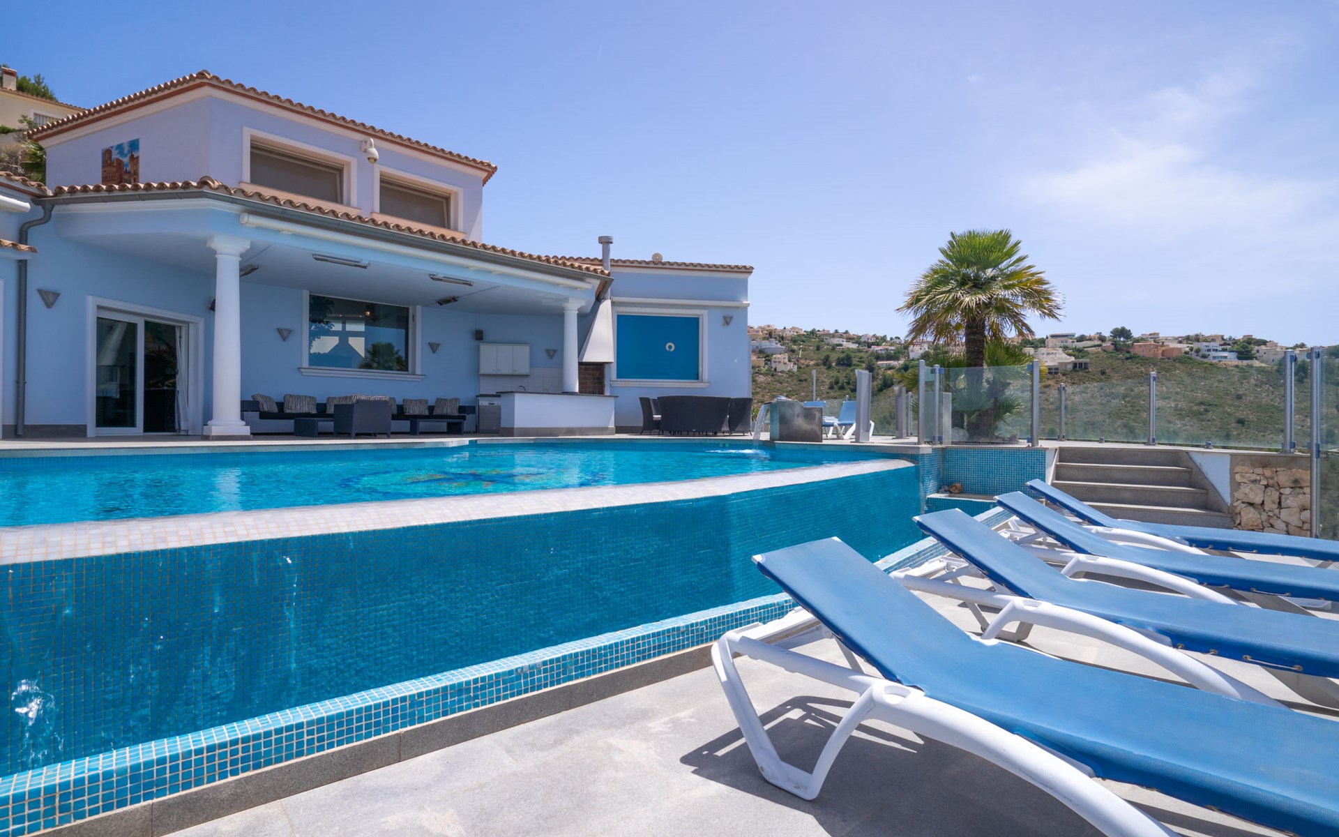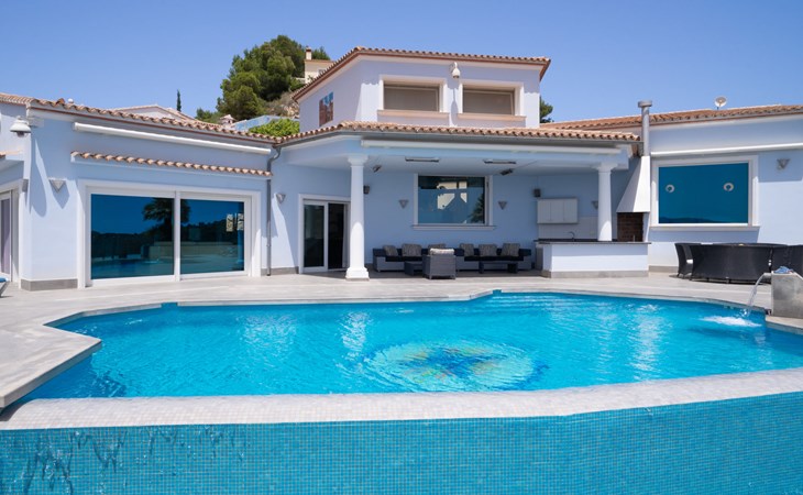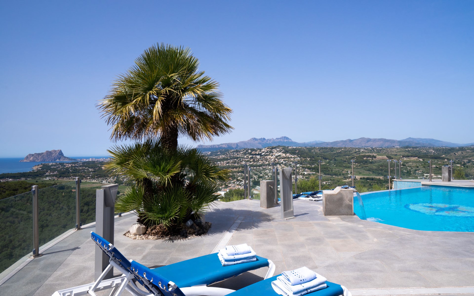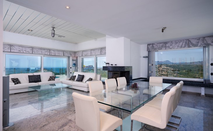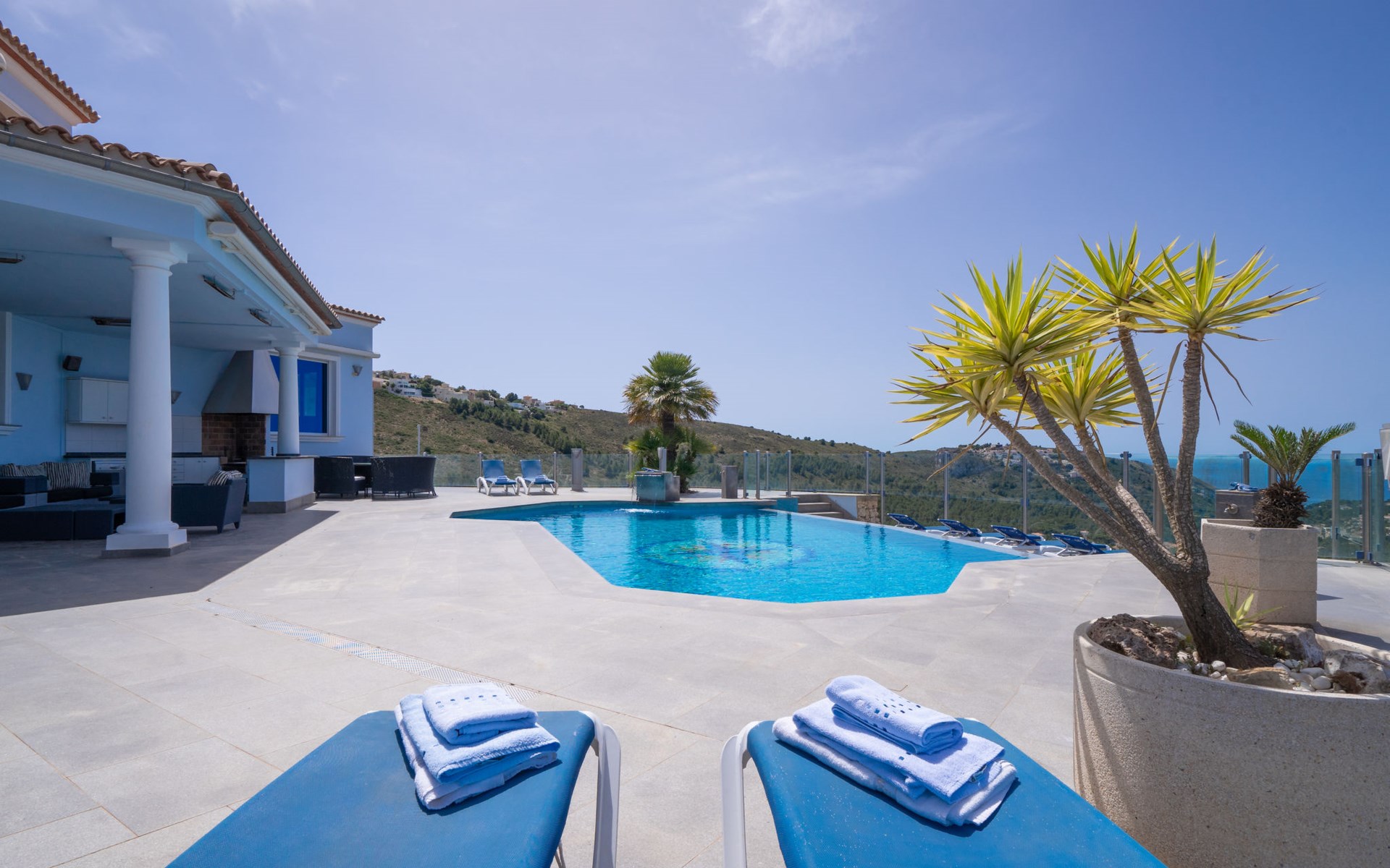 Golden Valley: Sehr moderne, luxuriöse Finca "Finca Edel", auf 2 Stockwerken. 4.5 km vom Zentrum von Moraira, ruhige, sonnige, erhöhte Lage, 4.5 km vom Meer, in einer Sackgasse. Zur Alleinbenutzung: Grundstück 1'200 m2 (eingezäunt), Schwimmbad nicht einsehbar (50 m2, saisonale Verfügbarkeit: 01.Jan. - 31.Dez.) mit Innentreppe. Terrasse, Gartenmöbel, Grillhaus. Im Hause: Sauna, Sprudelbad (alles inkl.), Zentralheizung, Klimaanlage, Waschmaschine, Wäschetrockner. Supermarkt 1.3 km, Restaurant 1.3 km, Bar 1.3 km, Bushaltestelle "Moraira" 4.9 km, Bahnstation "Teulada" 7.1 km, Fähre "Denia" 22.7 km, Sandstrand "Playa L'Ampolla" 5.4 km. Golfplatz (18 Loch) 9 km. Der Besitzer akzeptiert keine Jugendgruppen.