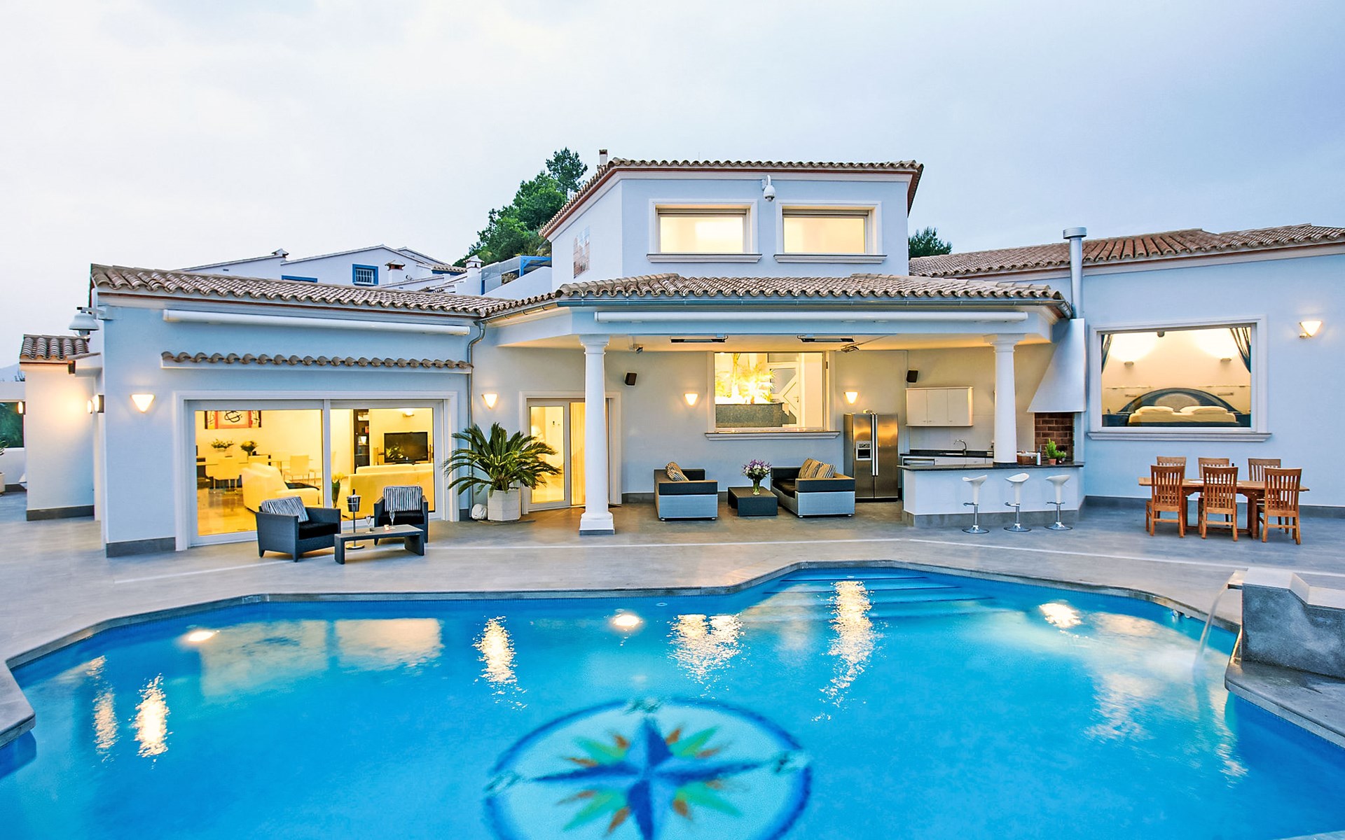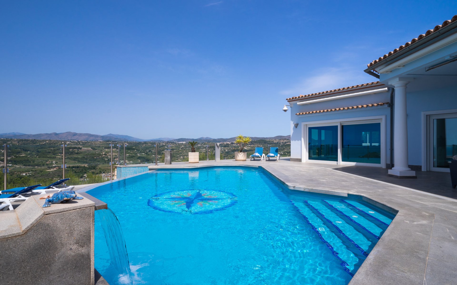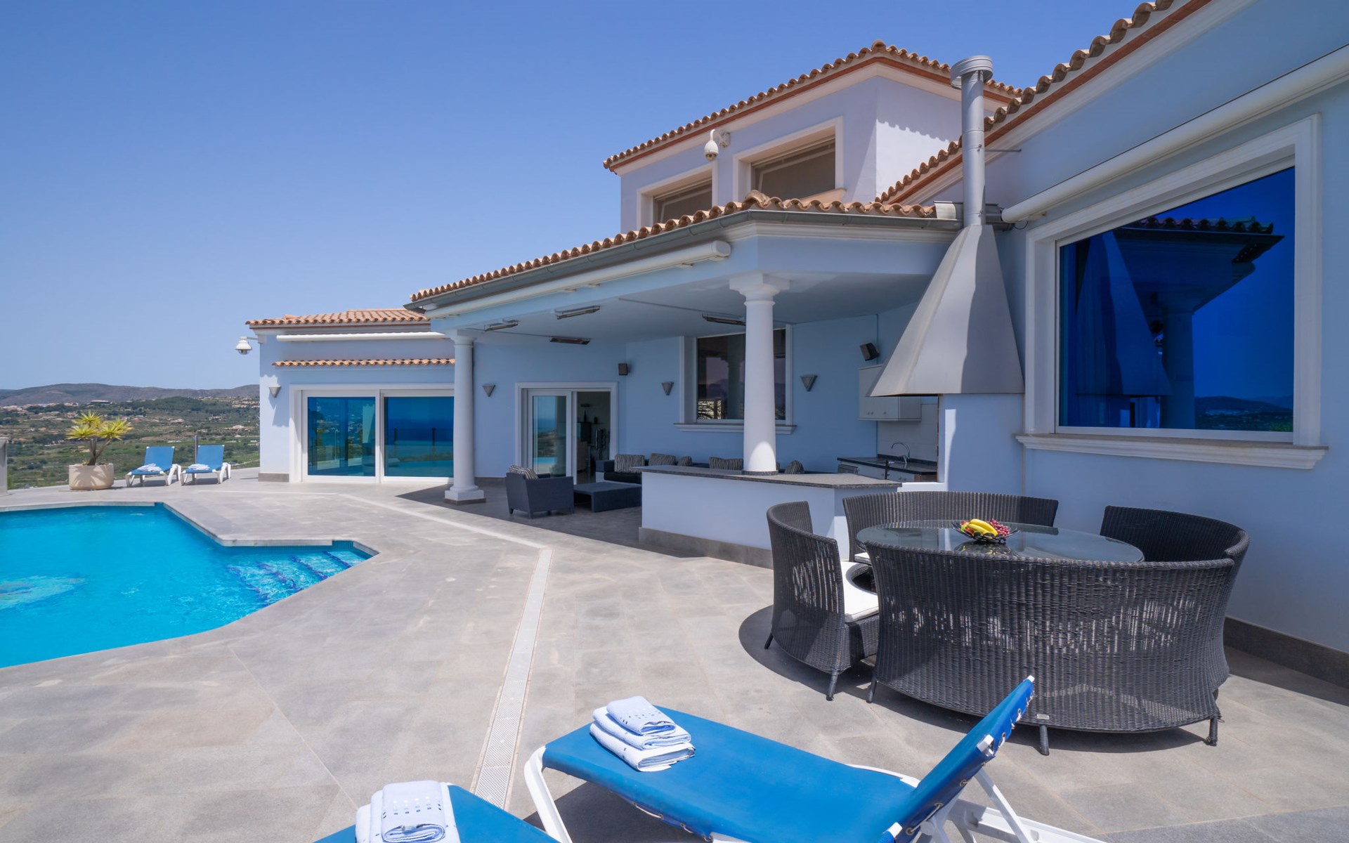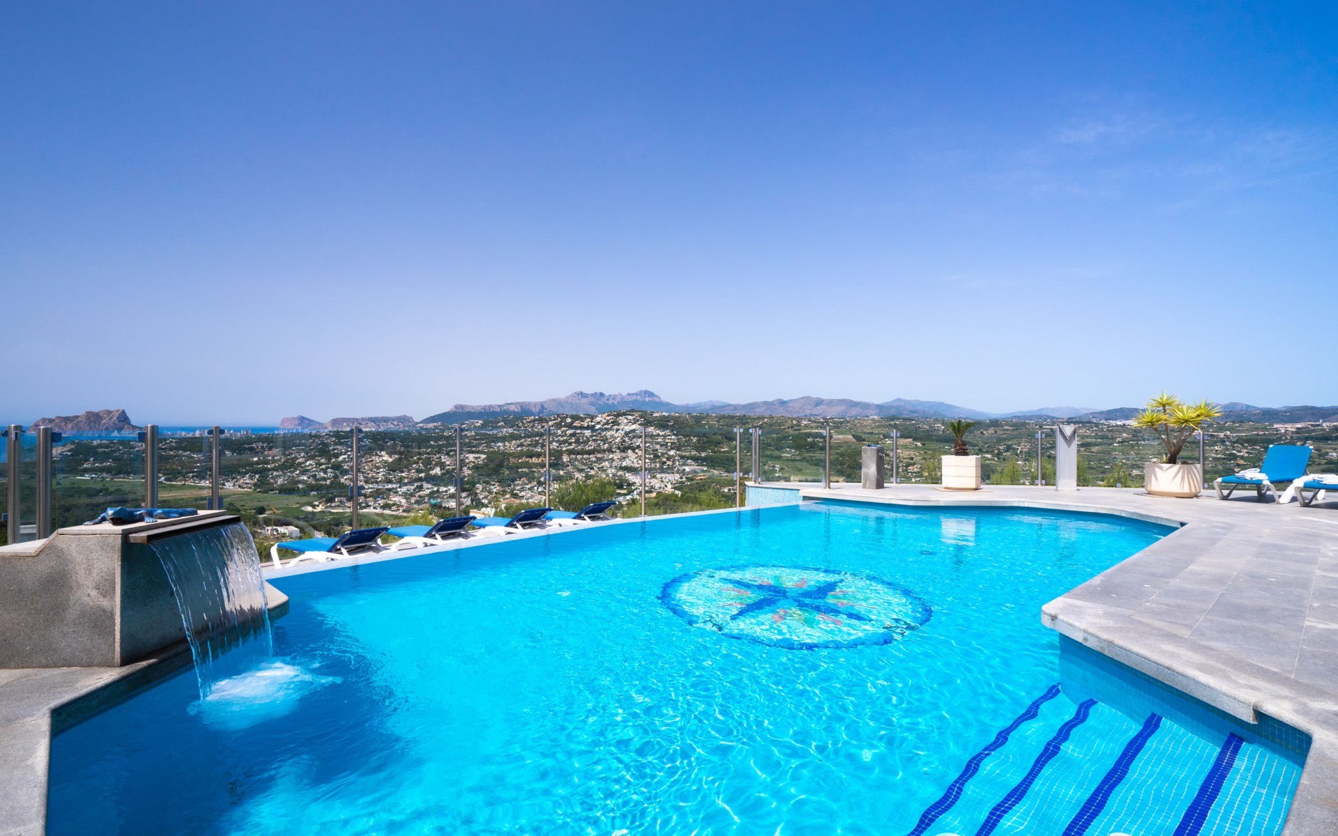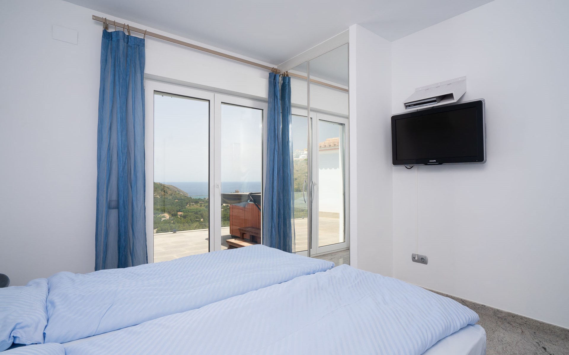 Golden Valley: Sehr moderne, luxuriöse Finca "Finca Edel", auf 2 Stockwerken. 4.5 km vom Zentrum von Moraira, ruhige, sonnige, erhöhte Lage, 4.5 km vom Meer, in einer Sackgasse. Zur Alleinbenutzung: Grundstück 1'200 m2 (eingezäunt), Schwimmbad nicht einsehbar (50 m2, saisonale Verfügbarkeit: 01.Jan. - 31.Dez.) mit Innentreppe. Terrasse, Gartenmöbel, Grillhaus. Im Hause: Sauna, Sprudelbad (alles inkl.), Zentralheizung, Klimaanlage, Waschmaschine, Wäschetrockner. Supermarkt 1.3 km, Restaurant 1.3 km, Bar 1.3 km, Bushaltestelle "Moraira" 4.9 km, Bahnstation "Teulada" 7.1 km, Fähre "Denia" 22.7 km, Sandstrand "Playa L'Ampolla" 5.4 km. Golfplatz (18 Loch) 9 km. Der Besitzer akzeptiert keine Jugendgruppen.