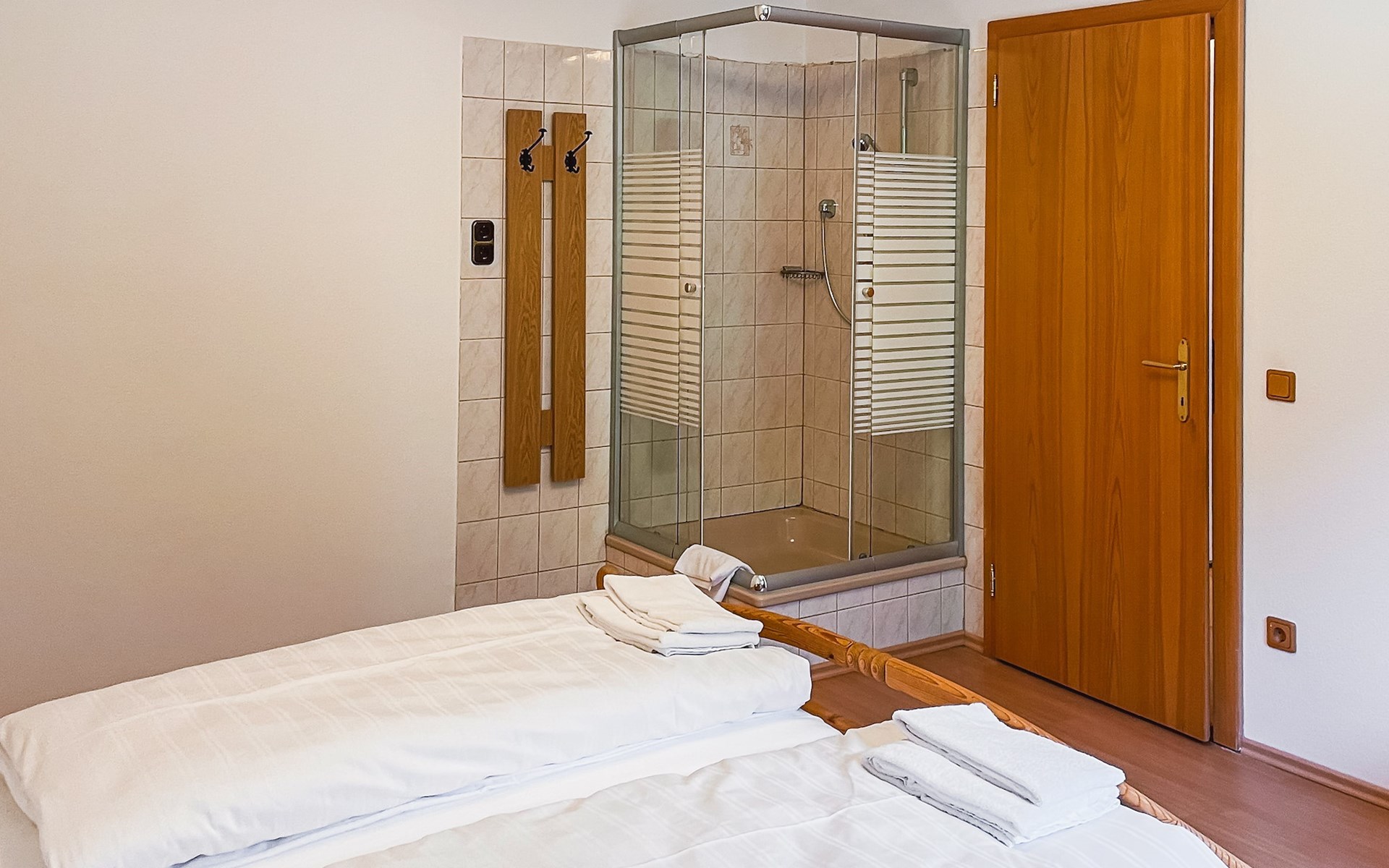 Das Doppelschlafzimmer hat ein Kingsize-Bett und eine Dusche. Das Badezimmer ist mit einer Badewanne, Waschbecken und einer Toilette ausgestattet. Darüber hinaus gibt es ein zweites Schlafzimmer mit einem Einzelbett. Sie haben auch Zugang zu einem Abstellraum in der Ferienwohnung.