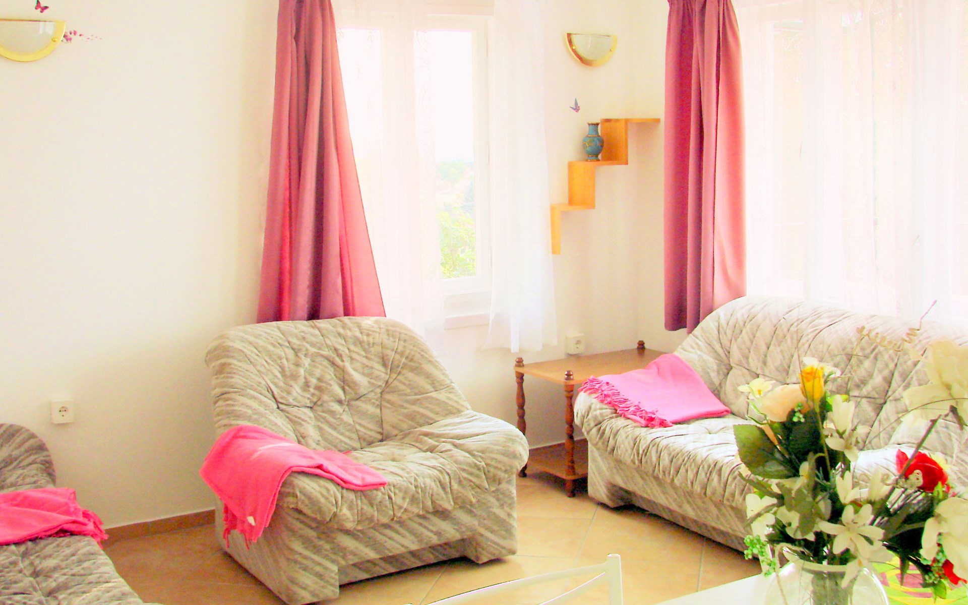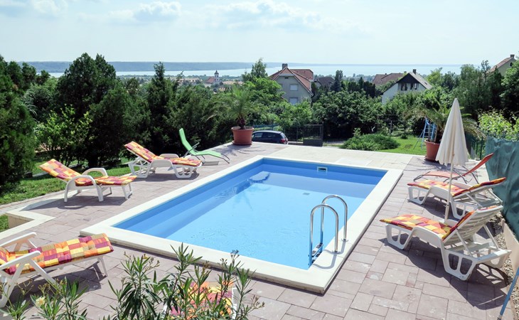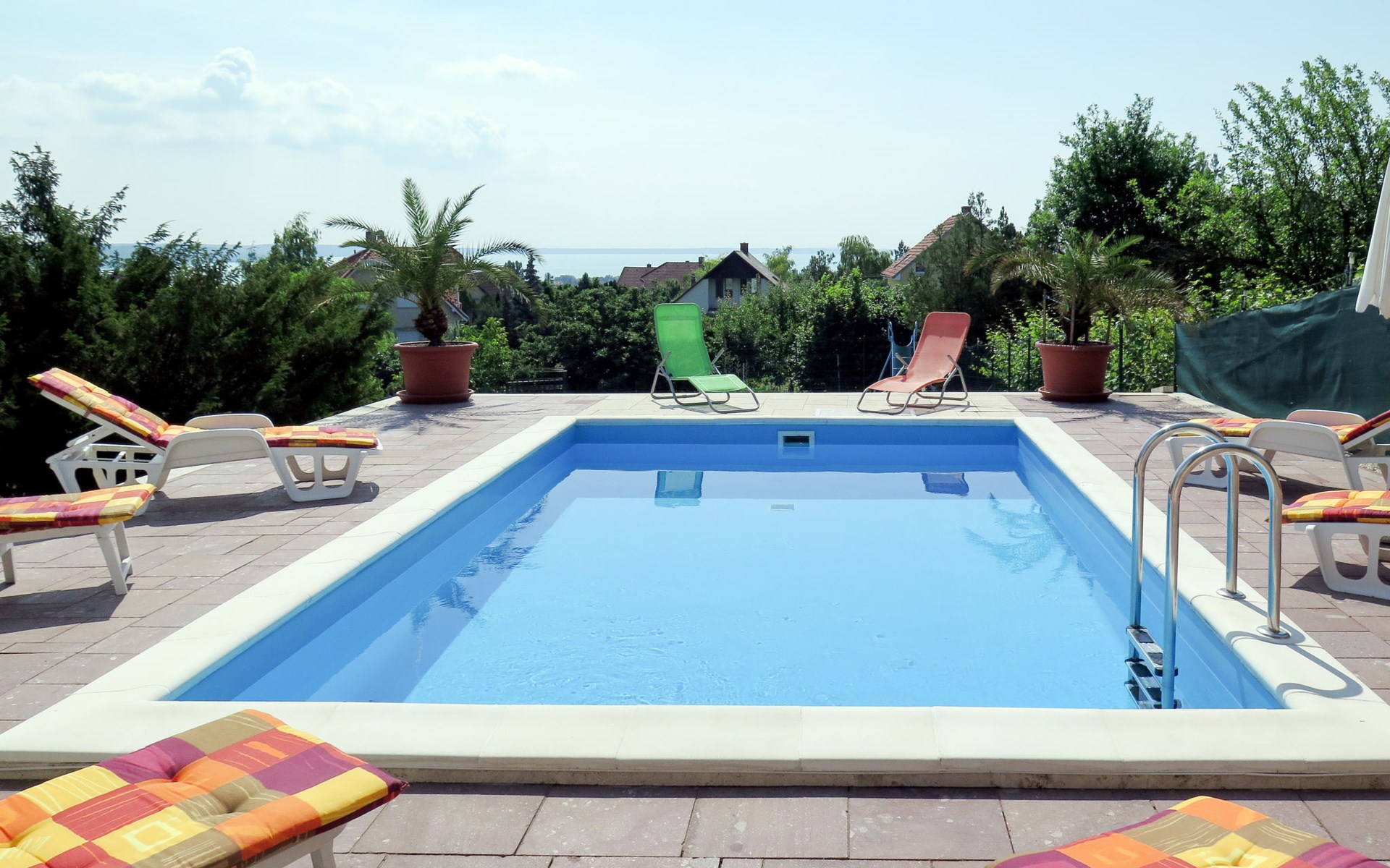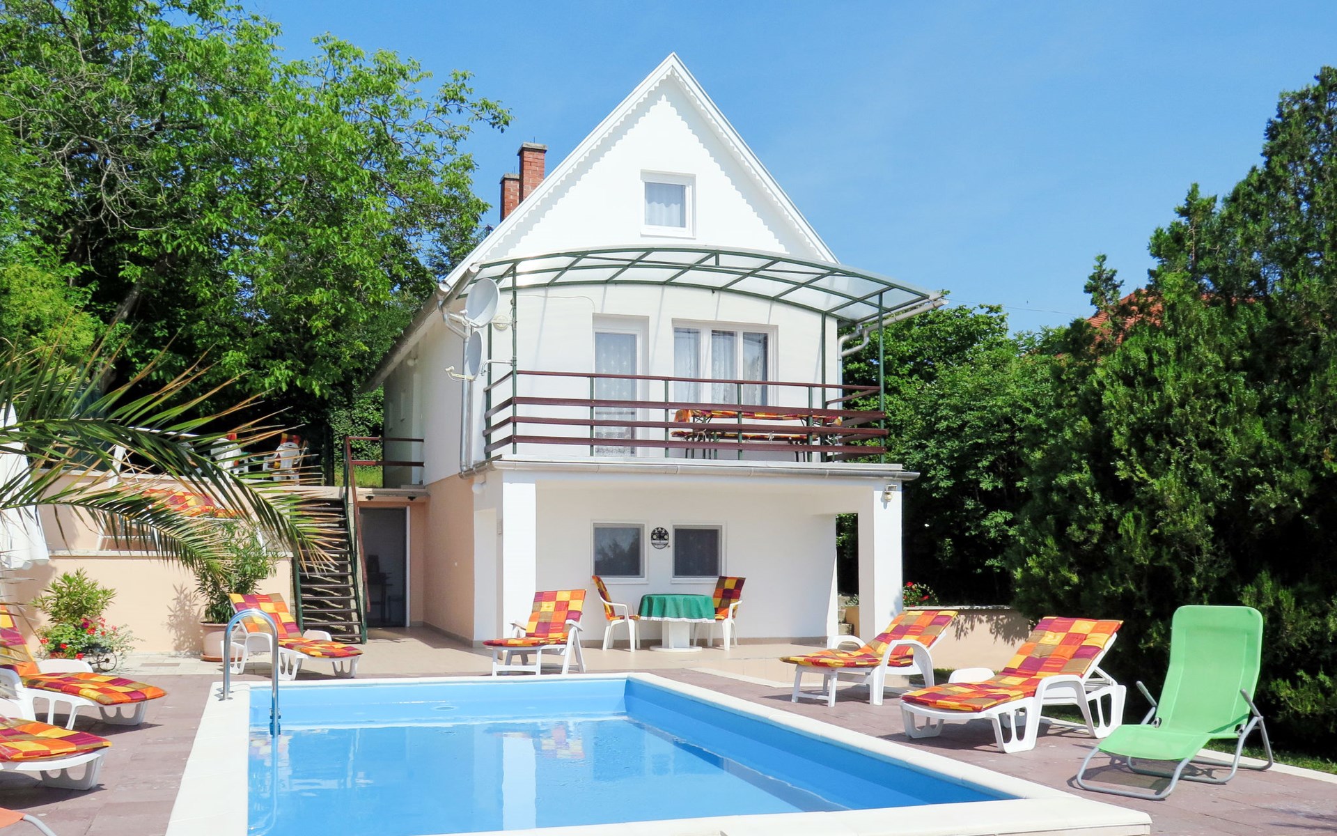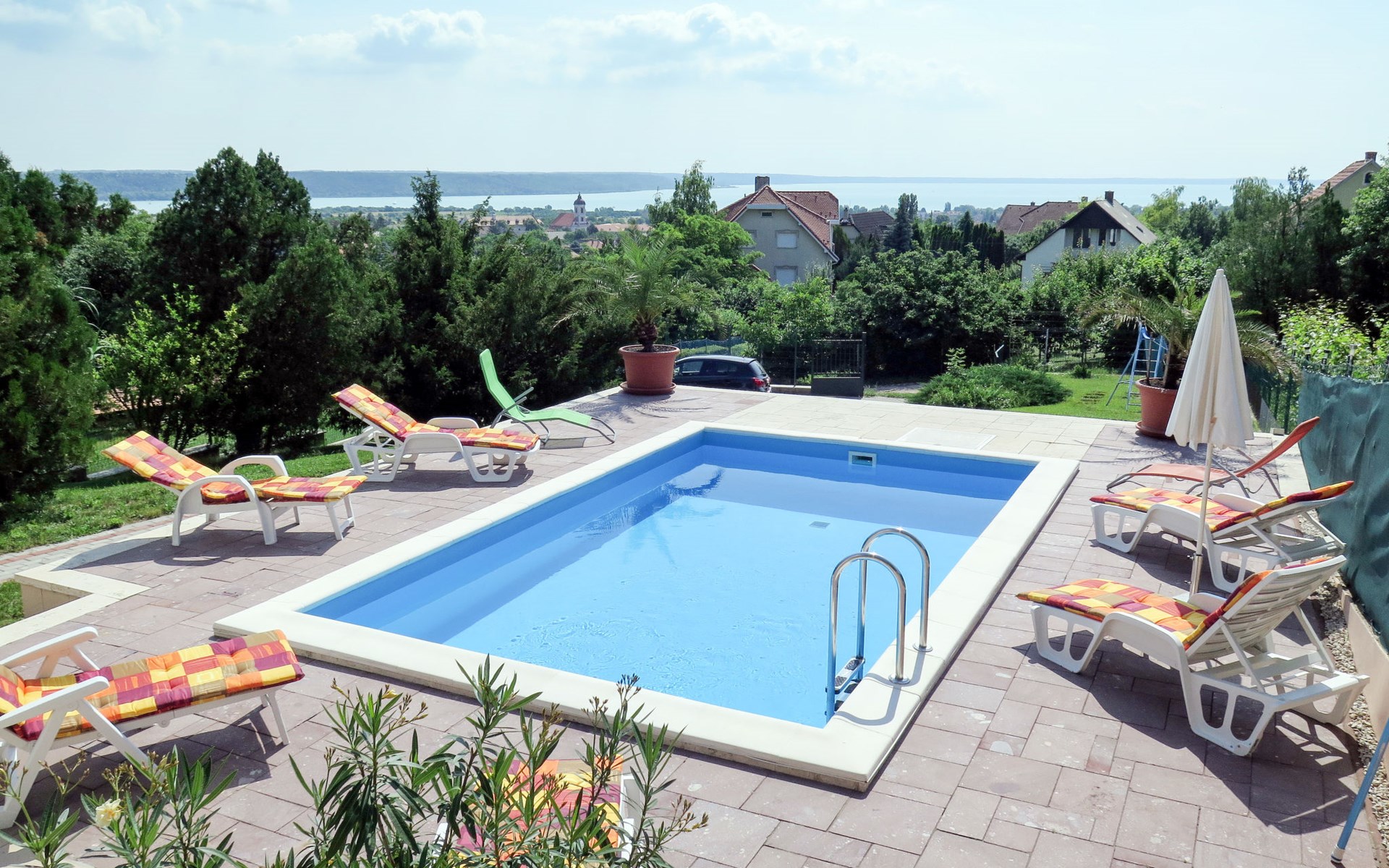 Balatonalmádi 16 km von Balatonfüred: Schönes Einfamilienhaus "Annemarie". 2 km vom Zentrum von Balatonalmadi, am Ortsrand, 7 km vom Zentrum von Balatonfüzfö, 17 km vom Zentrum von Balatonfüred, am Hang, in einem Wohnquartier, 2.4 km vom See, 2.8 km vom Strand. Zur Alleinbenutzung: Grundstück 800 m2 (eingezäunt) mit Bäumen, Wiese, Schwimmbad beheizt (6 x 4 m, 120 cm tief, saisonale Verfügbarkeit: 15.Mai. - 30.Sep.). Kinderspielplatz (Rutschbahn). Im Hause: Tischfussball. 200 m lange holprige Zufahrt. Treppenweg bis zum Haus. Parkplatz (für 3 Autos) auf dem Grundstück. Lebensmittelgeschäft 1 km, Supermarkt 2 km, Grasstrand 2.4 km, Thermalbad "Pápai Thermal Bath" 62 km. Tennis 2 km, Reitstall 2 km, Radweg 2 km, Kinderspielplatz 2 km. Nahe gelegene Sehenswürdigkeiten: BalatoniBob Theme Park 5 km, Veszprém Zoo 15 km, Balatonfüred Annagora Aquapark 18 km, Tihany 24 km, Balaton Theme Park Nosztori 18 km, Koloska Valley 18 km.
