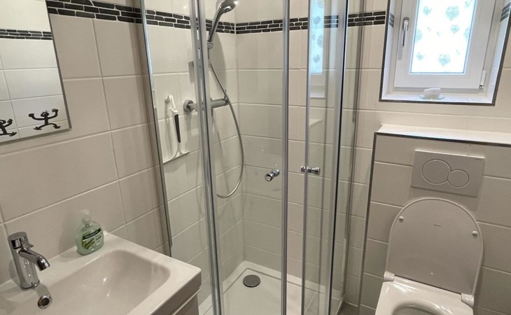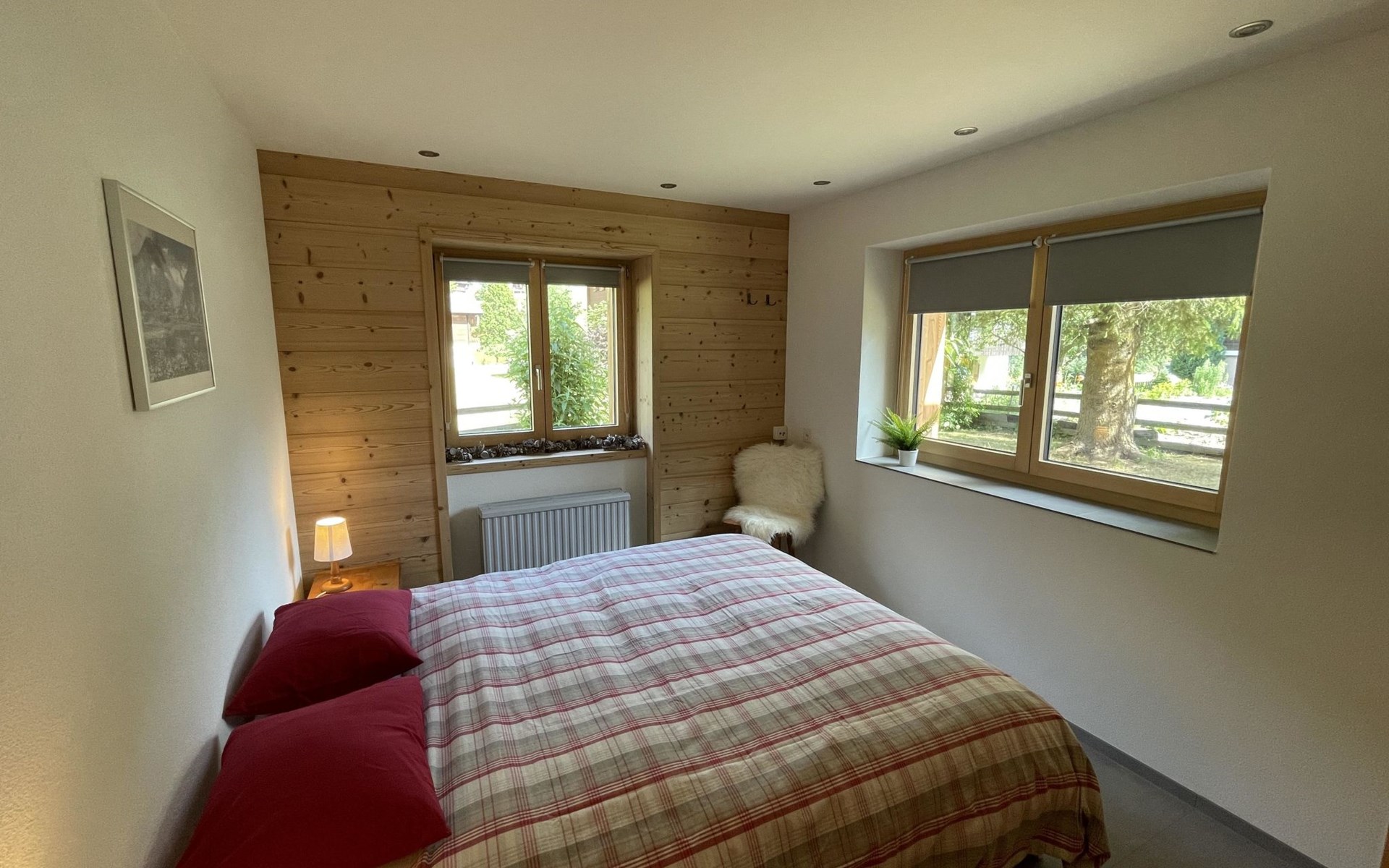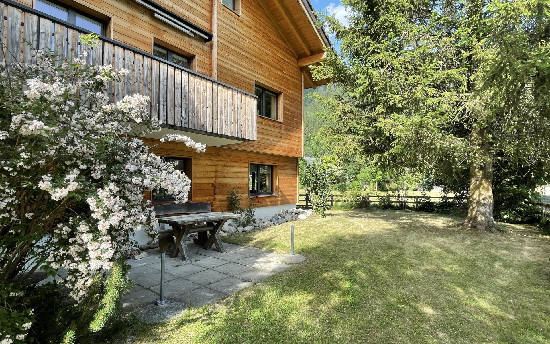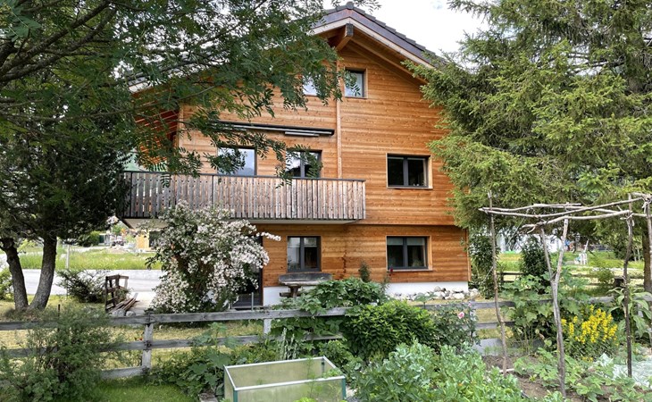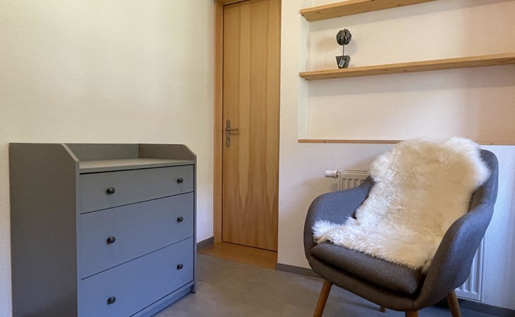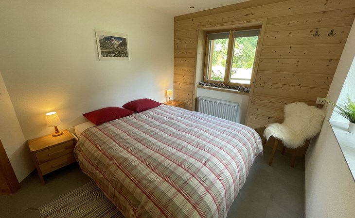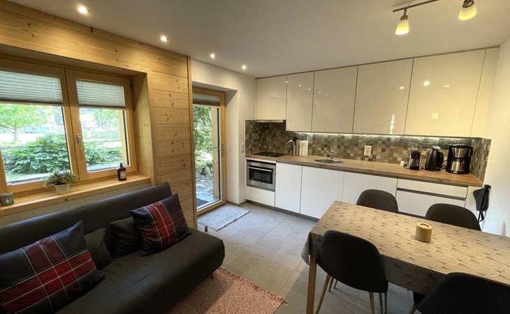 Die stilvolle 3-Zimmerwohnung verfügt über eine offene Wohnküche, zwei Schlafzimmer und ein Badezimmer mit Dusche. Die moderne Küche ist mit einem Induktionsherd, Backofen mit integrierter Mikrowelle, Geschirrspüler, Kaffeemaschine, Toaster, Wasserkocher und Fondue-Rechaud ausgestattet. Ein Tisch für vier Personen, ein gemütliches Sofa und ein Fernseher ergänzen das Angebot im Wohnbereich. Das Schlafzimmer verfügt über ein kuscheliges Bett (1.60m) und einen grosszügigen Schrank. Im anderen Schlafzimmer finden die Gäste ein weiteres Bett vor, das bei Bedarf vergrössert werden kann, so dass auch problemlos zwei Kinder dort übernachten können. Ein Kinderbett und Kinderstuhl sind auf Anfrage kostenlos erhältlich. Im Badezimmer steht Ihnen ein Haartrockner sowie Frottierwäsche zur Verfügung. Ein gemütlicher Aussensitzplatz im Garten rundet das Angebot ab. Im separaten Abstellraum können Skis oder Fahrräder abgestellt werden.
