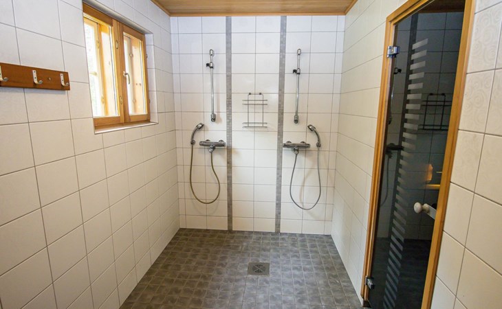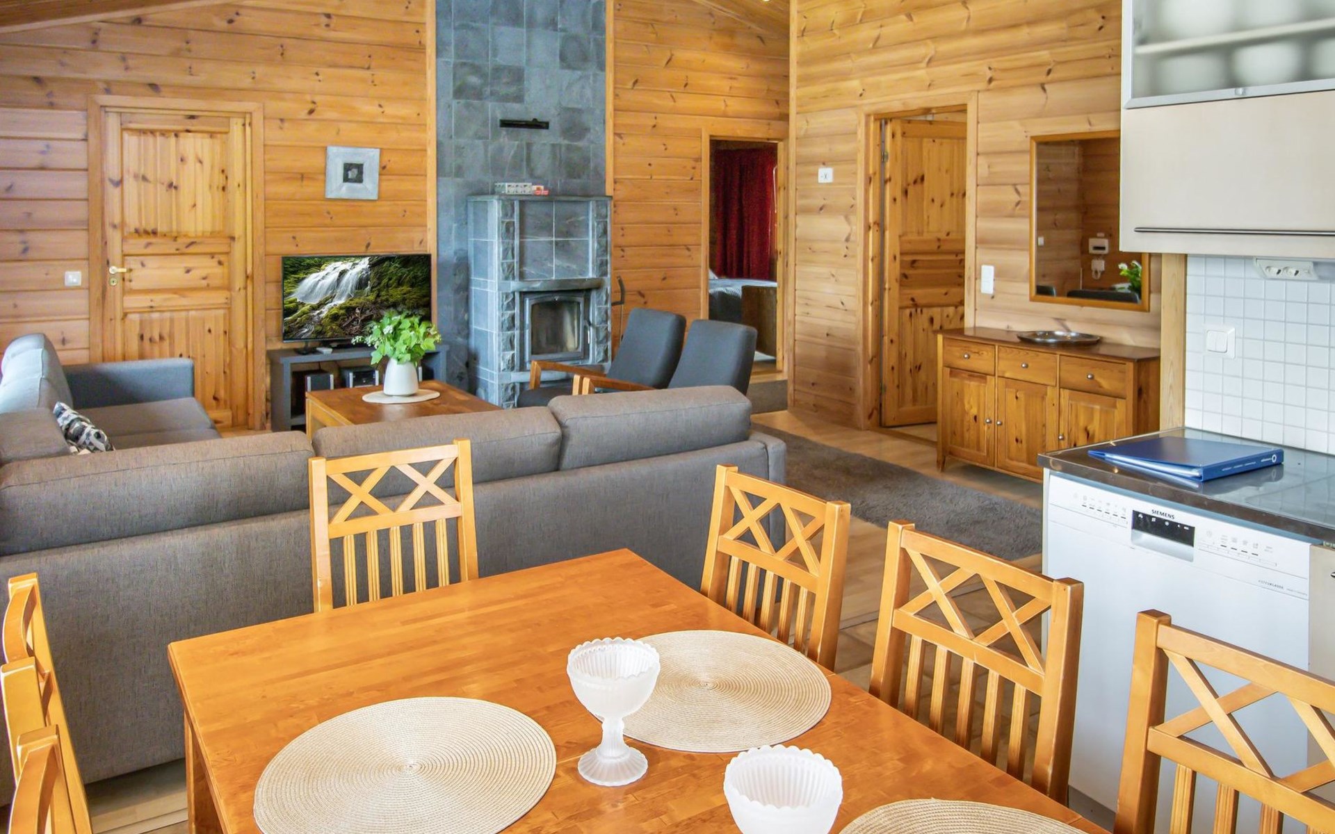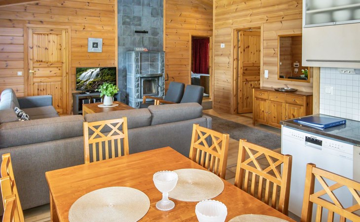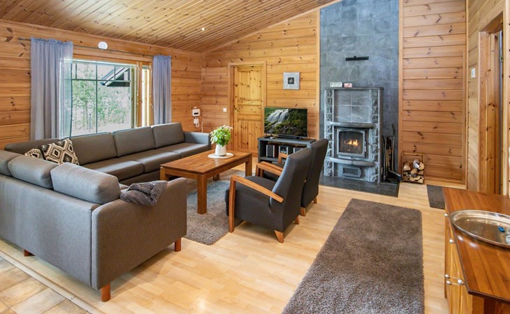 The cabin features a bright open-plan kitchen and living room, and three bedrooms. One bedroom has a double bed, the second has two single beds, and the third is equipped with three single beds. The property also includes two separate WCs, a dressing/utility room with access to a washroom with two showers, and a wood-heated sauna.