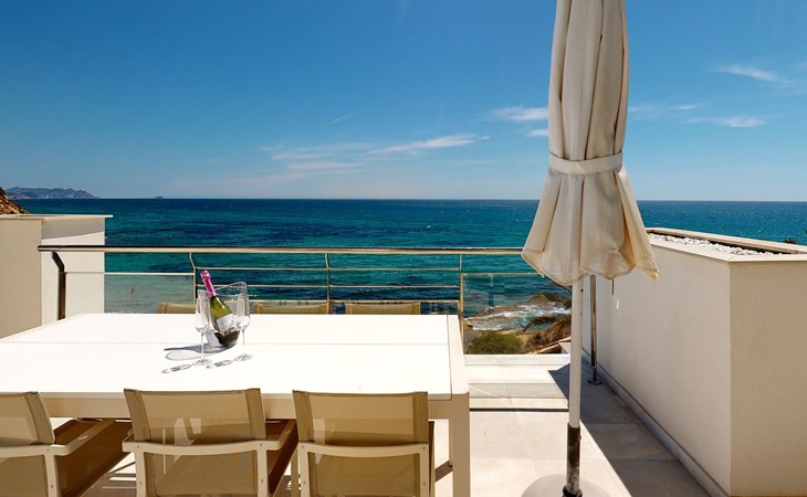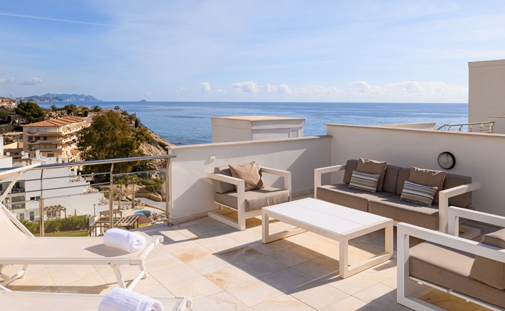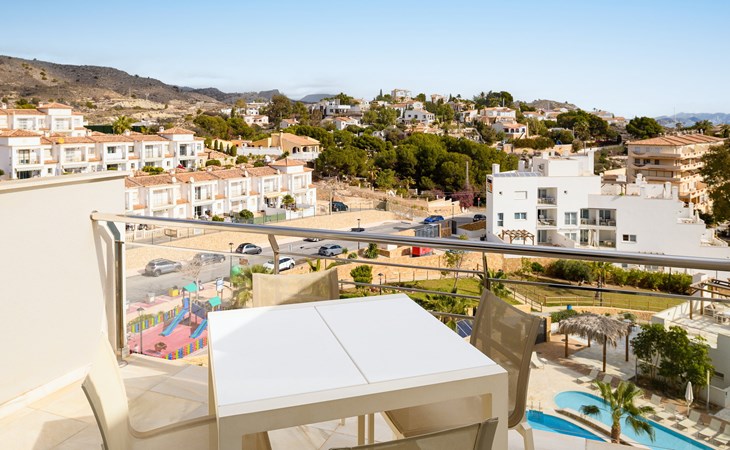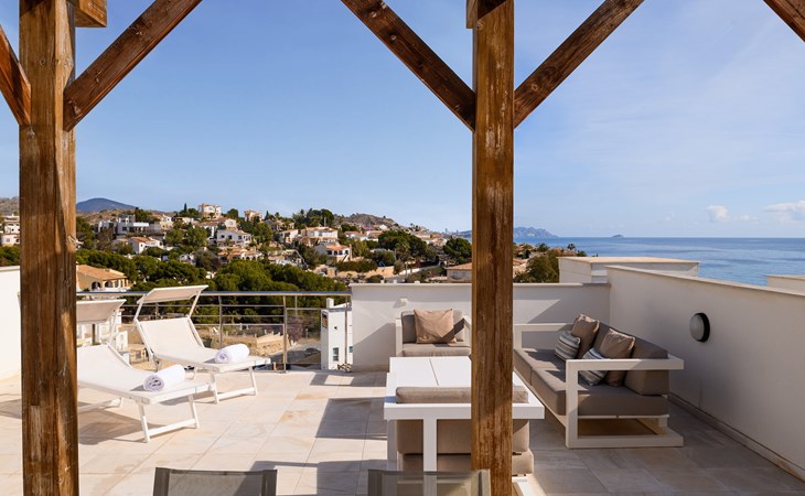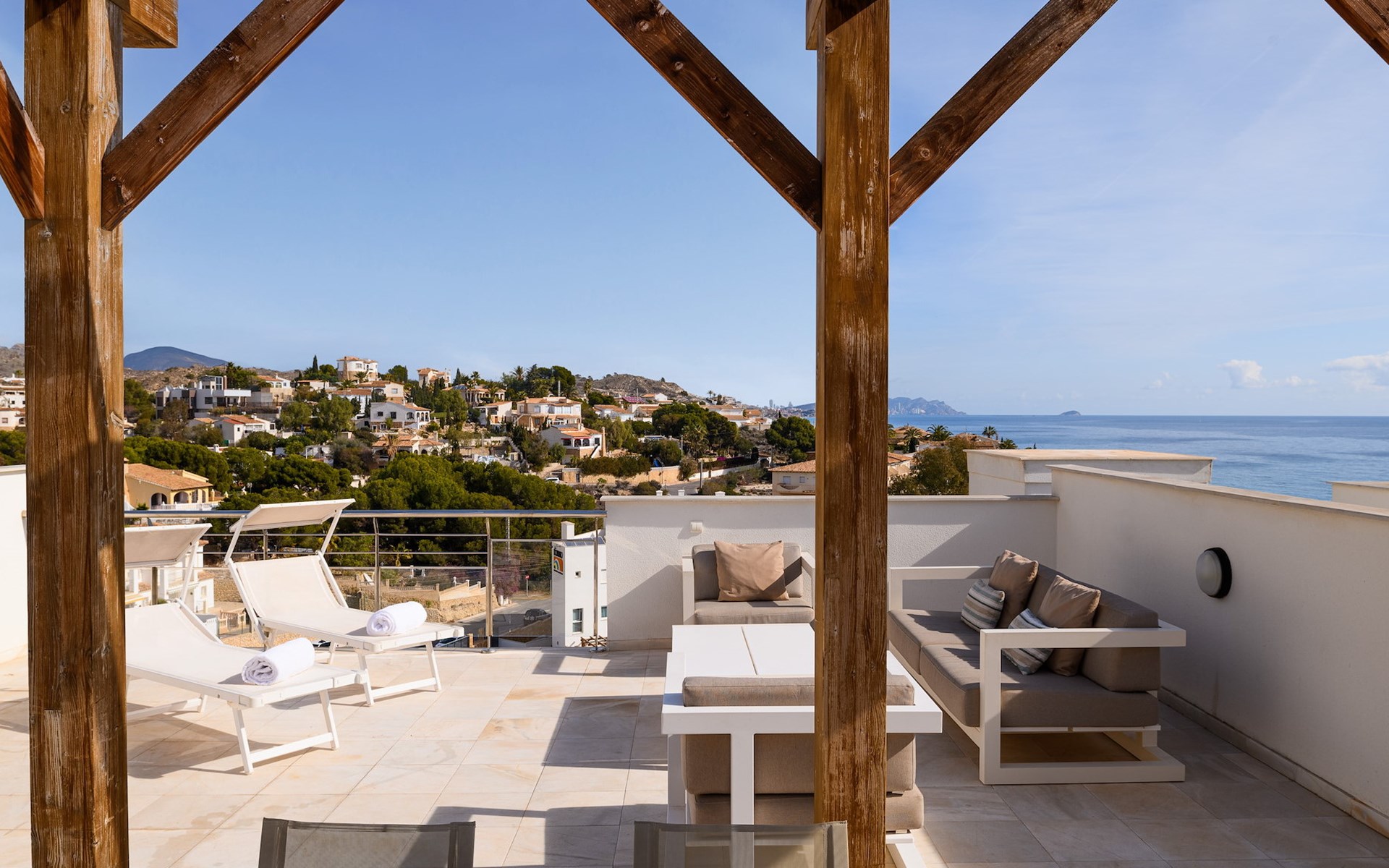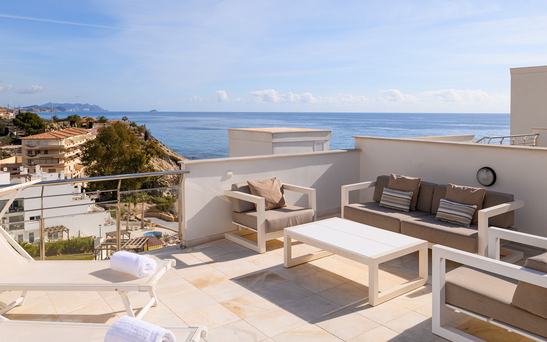 Penthouse Varadero ist eine Ferienwohnung im Dormio Resort Costa Blanca mit viel Luxus und Komfort. Die Unterkunft kann bis zu 6 Personen beherbergen und hat eine Nutzfläche von etwa 55m2. Auf dem Balkon mit Terrassenmöbeln können Sie den ganzen Tag im Freien verbringen. Eine Treppe auf dem Balkon führt zu einer Panoramadachterrasse mit einer Pergola und Schattentüchern. Sowohl vom Balkon als auch von der Dachterrasse aus hat man einen atemberaubenden Meerblick von vorne oder von der Seite.