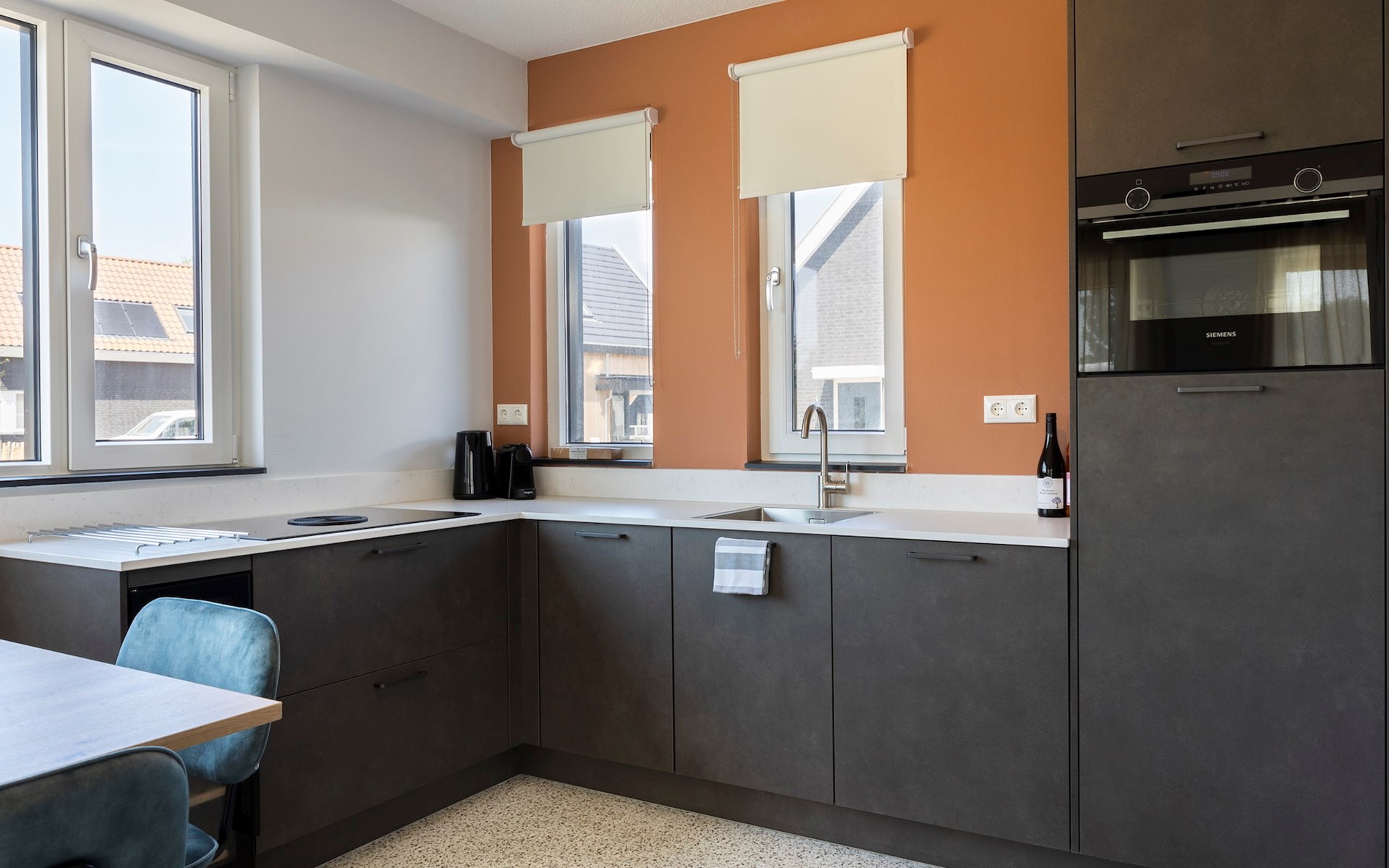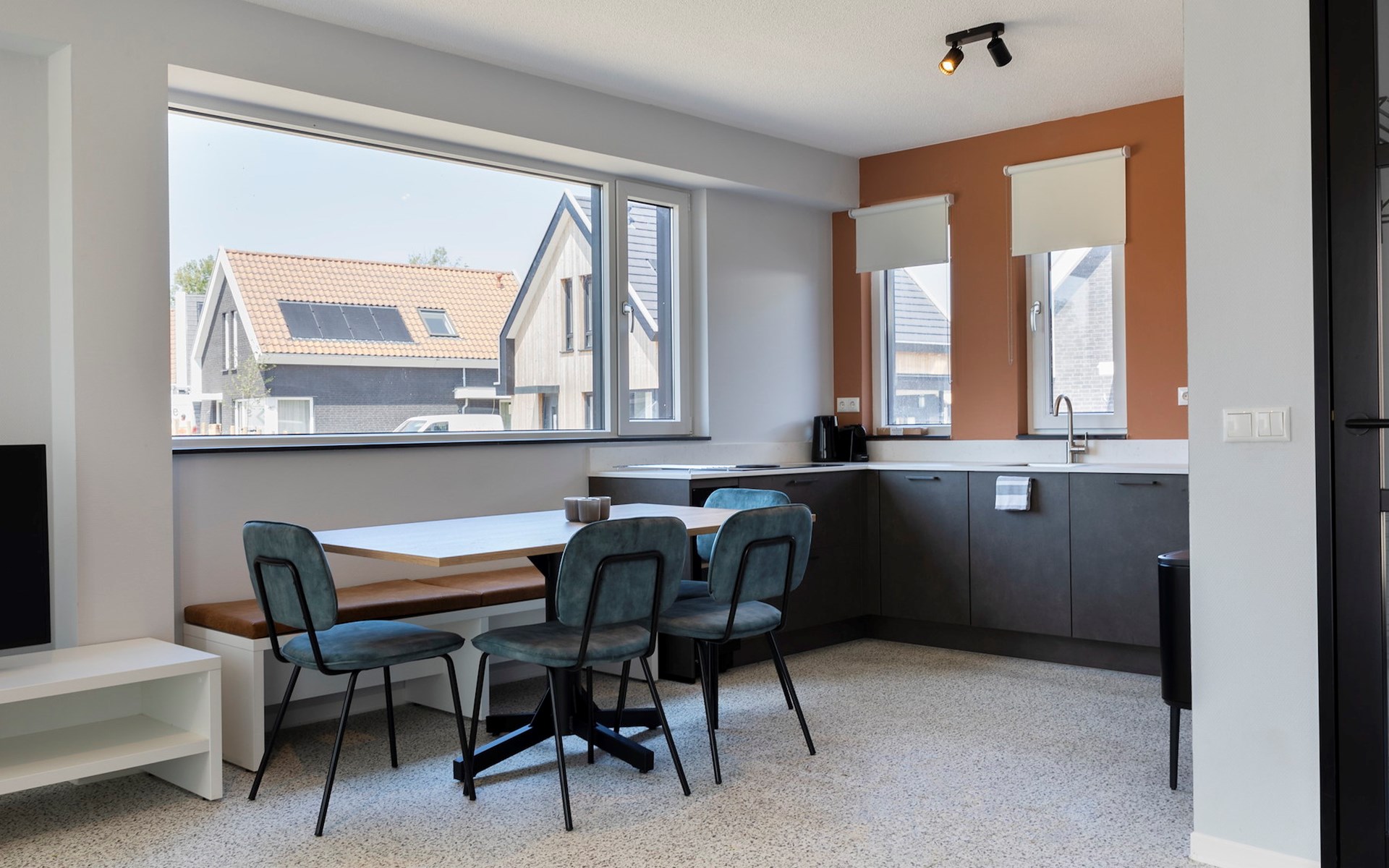 Das große Wohnzimmer verfügt über einen Zwinger (55 x 90 Zentimeter) und eine gemütliche Ess- und Sitzecke sowie einen Smart-TV mit Streaming-Funktion. Die moderne offene Küche ist mit Luxusgeräten wie einem Bora-Kochfeld, einem Kombiofen, einem Geschirrspüler, einer Nespresso-Maschine und einem Weinkühlschrank ausgestattet. Es gibt auch eine separate Toilette.