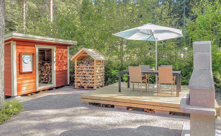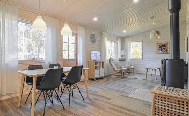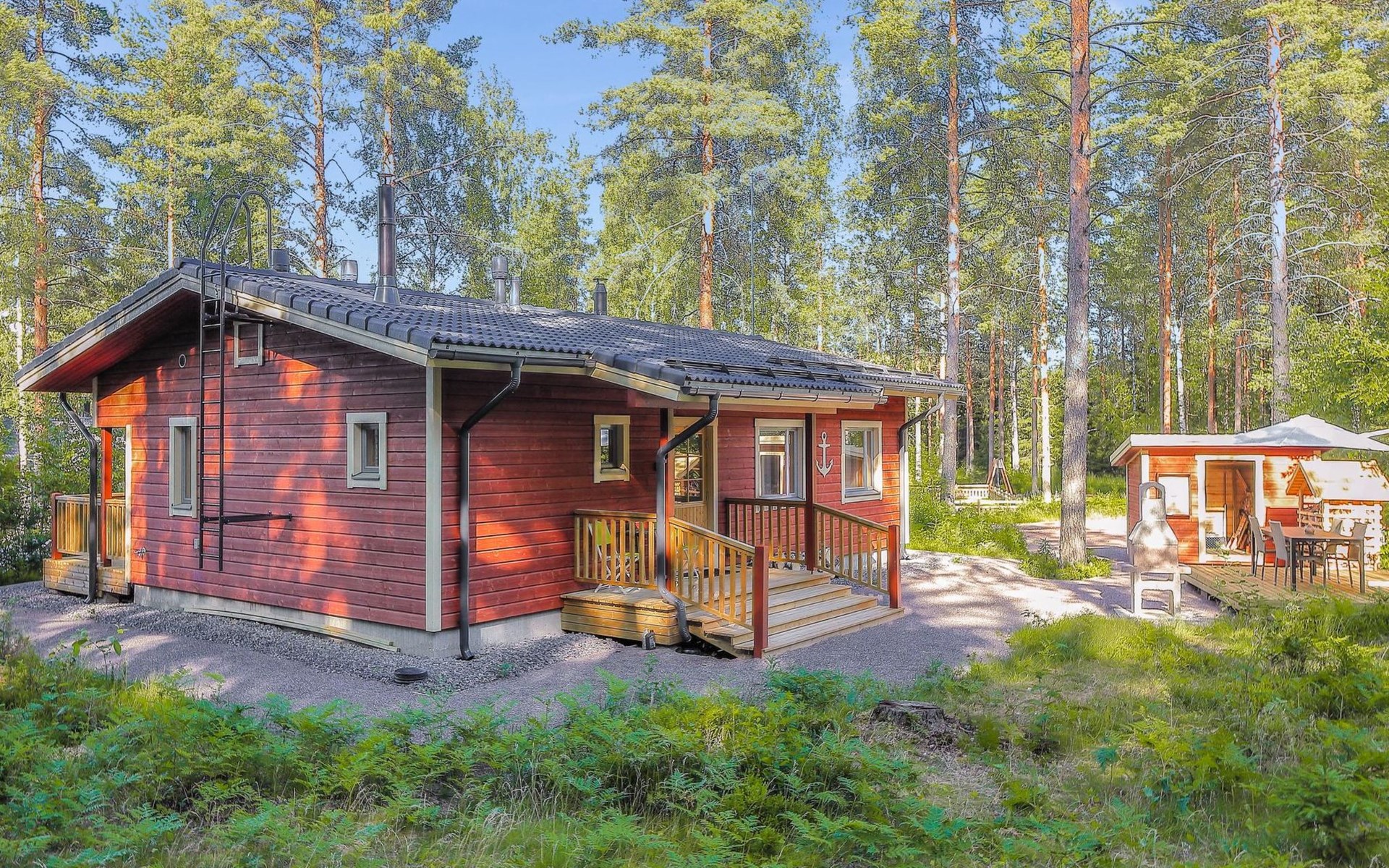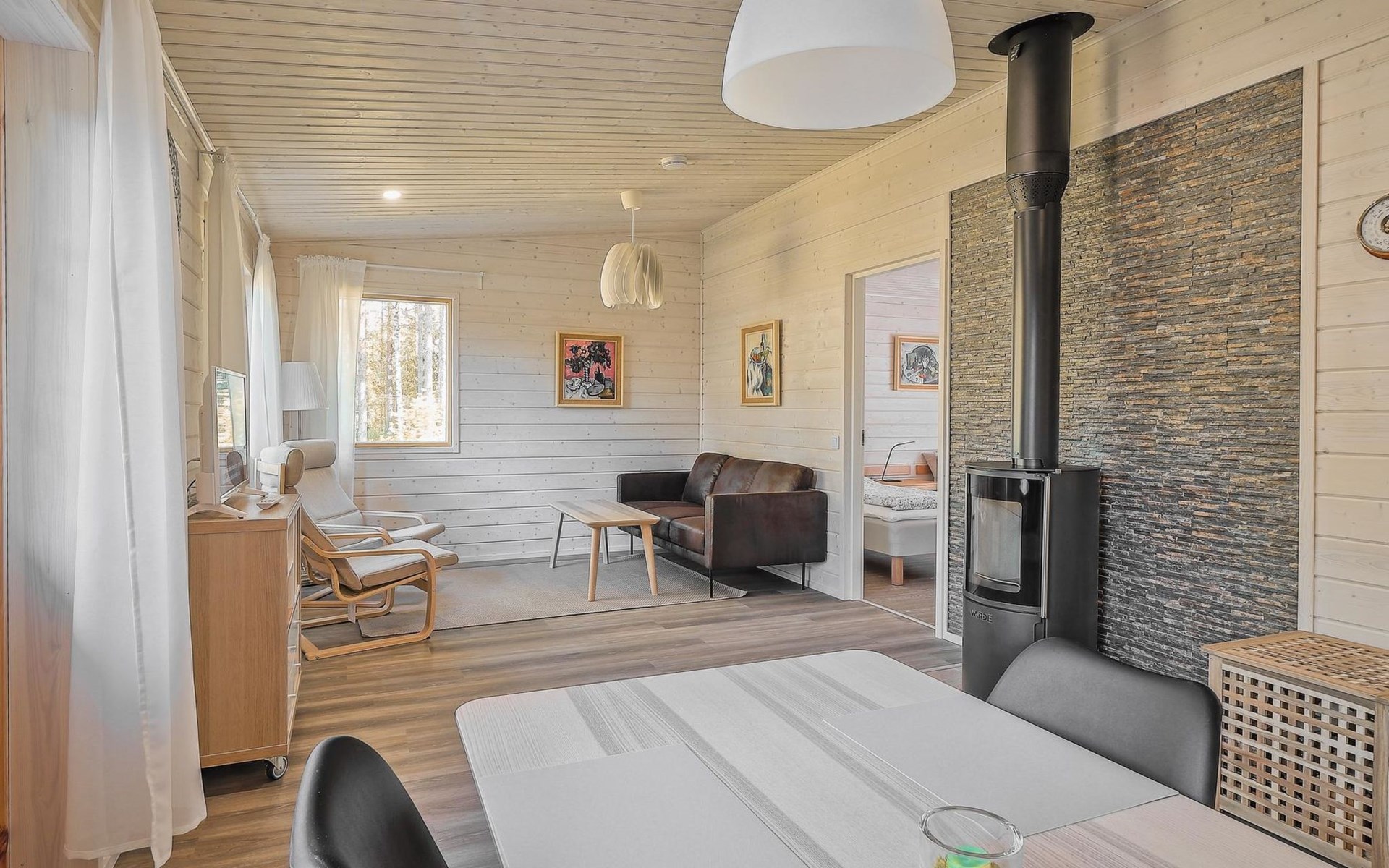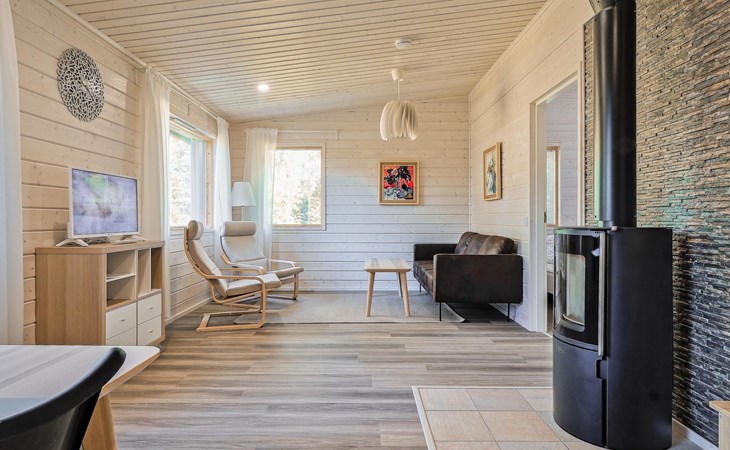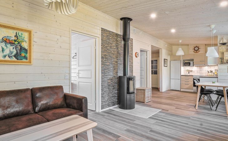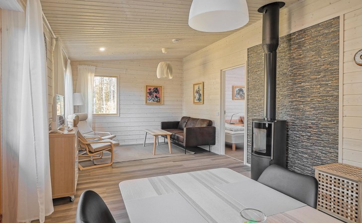Wooden cabin, built in 2020, living room/kitchen, two bedrooms with a double bed in one and two single beds in the other, WC, a utility room/bathroom, and a sauna with a wood-burning sauna stove. Covered porch and a rear terrace, cooking hut.