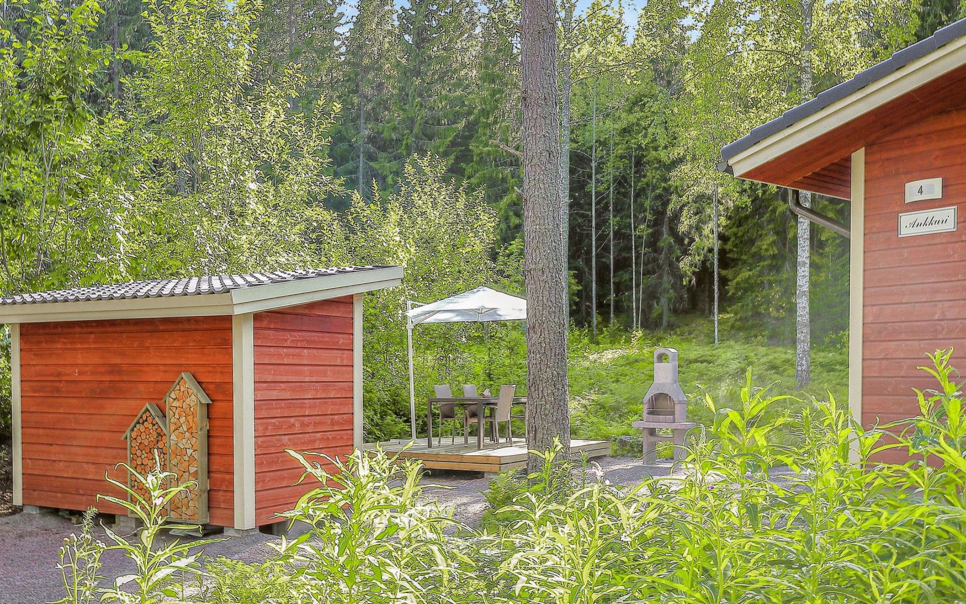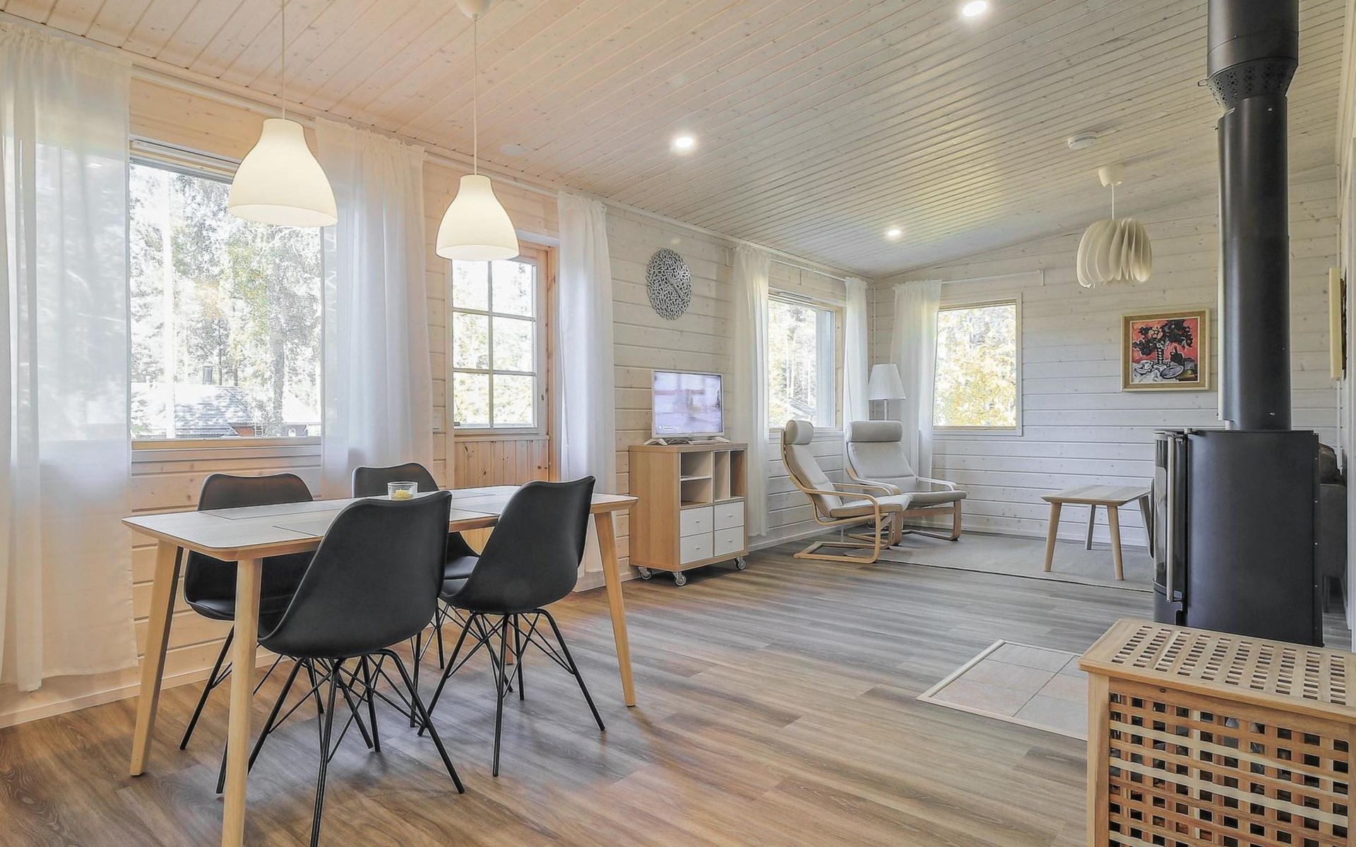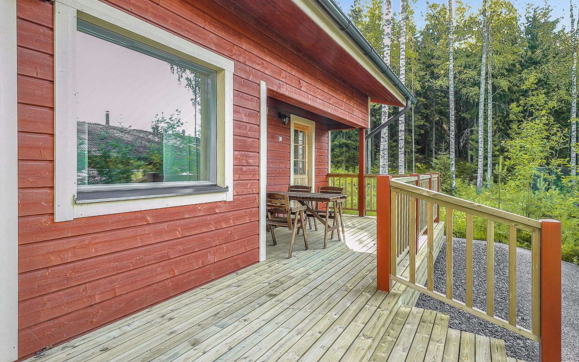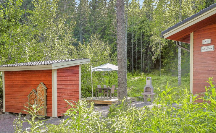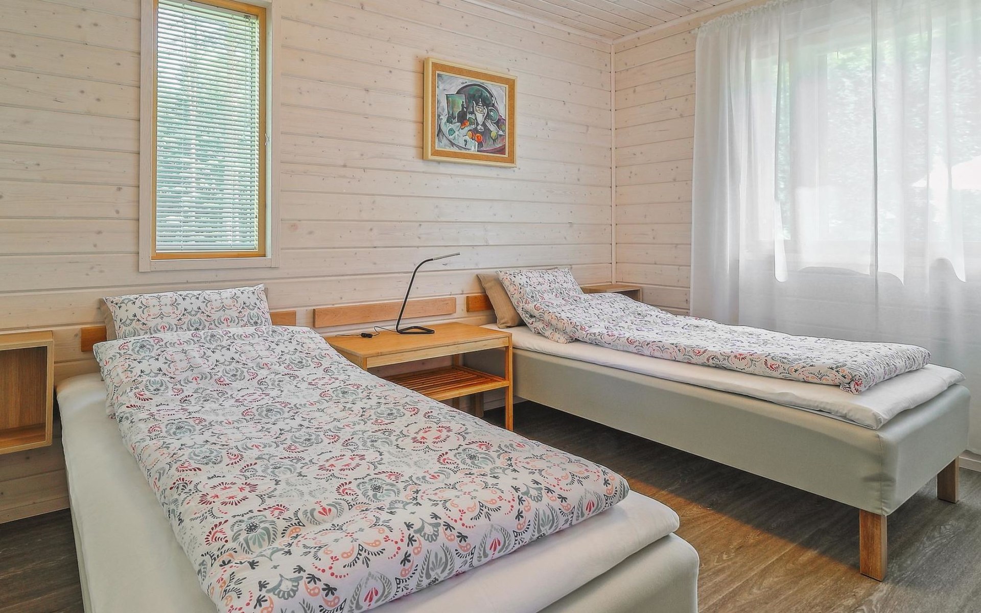 Wooden cabin, built in 2020, living room/kitchen, two bedrooms with a double bed in one and two single beds in the other, WC, a utility room/bathroom, and a sauna with a wood-burning sauna stove. Covered porch and a rear terrace, cooking hut.