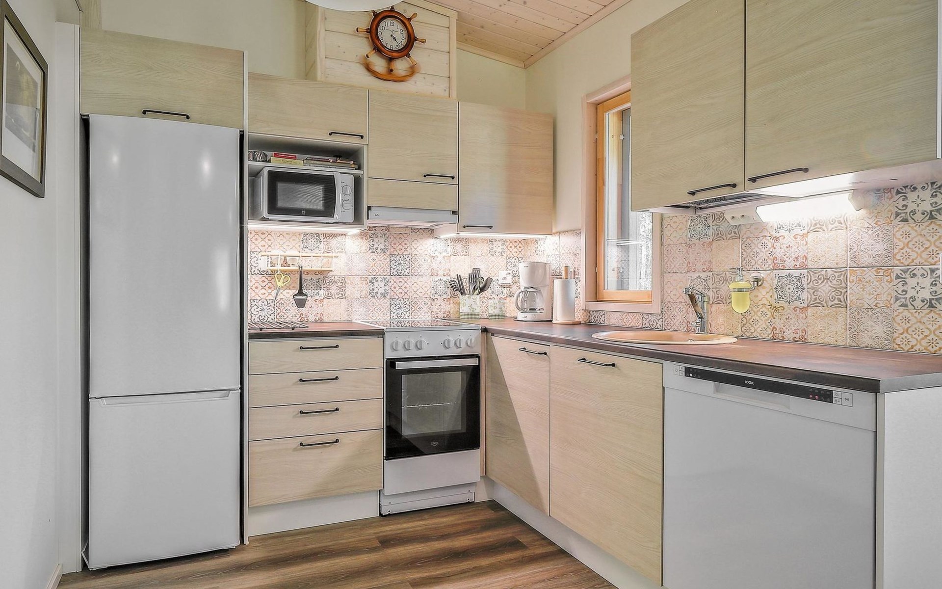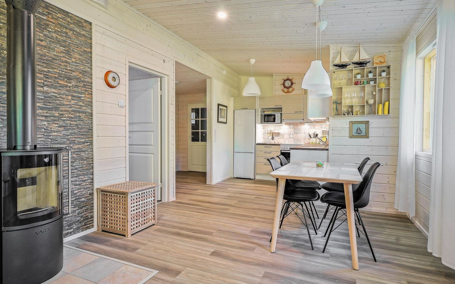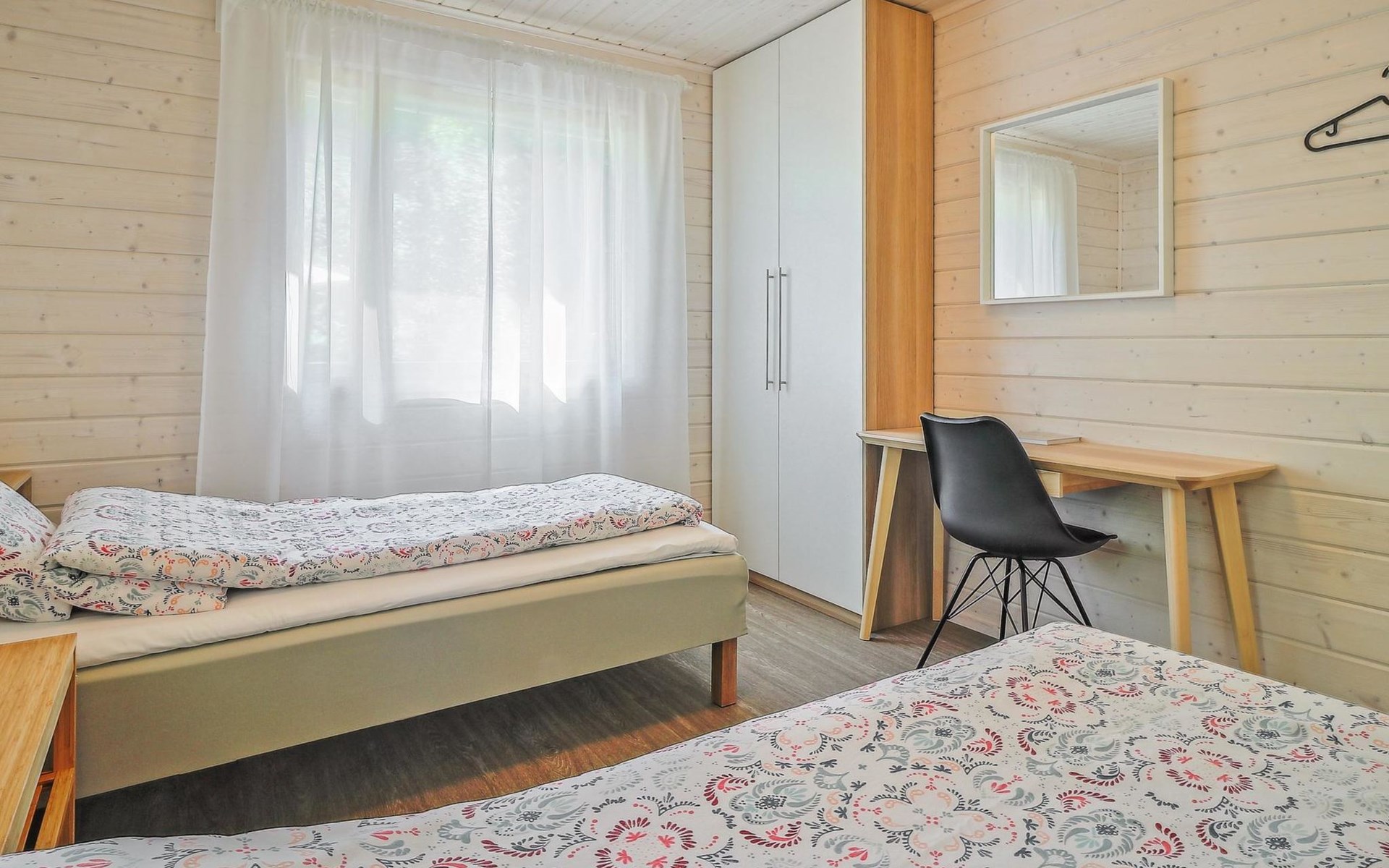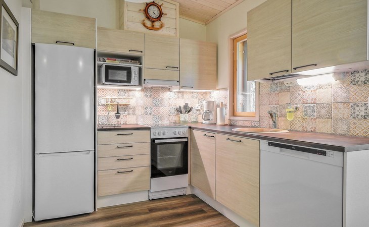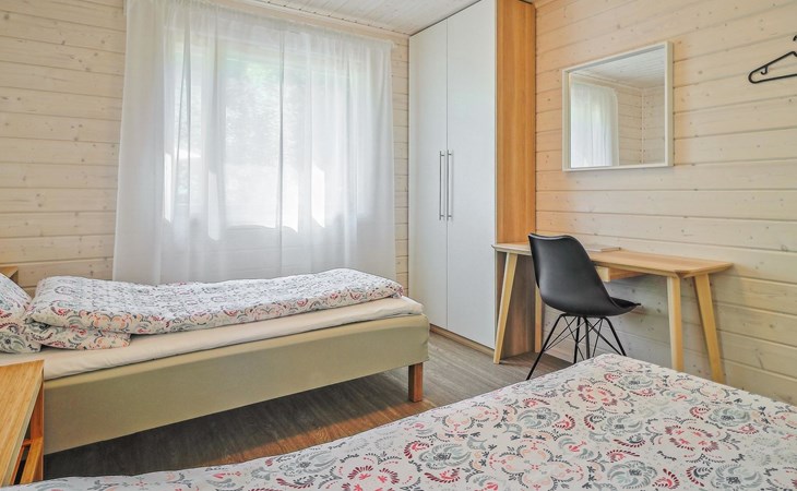 Wooden cabin, built in 2020, living room/kitchen, two bedrooms with a double bed in one and two single beds in the other, WC, a utility room/bathroom, and a sauna with a wood-burning sauna stove. Covered porch and a rear terrace, cooking hut.