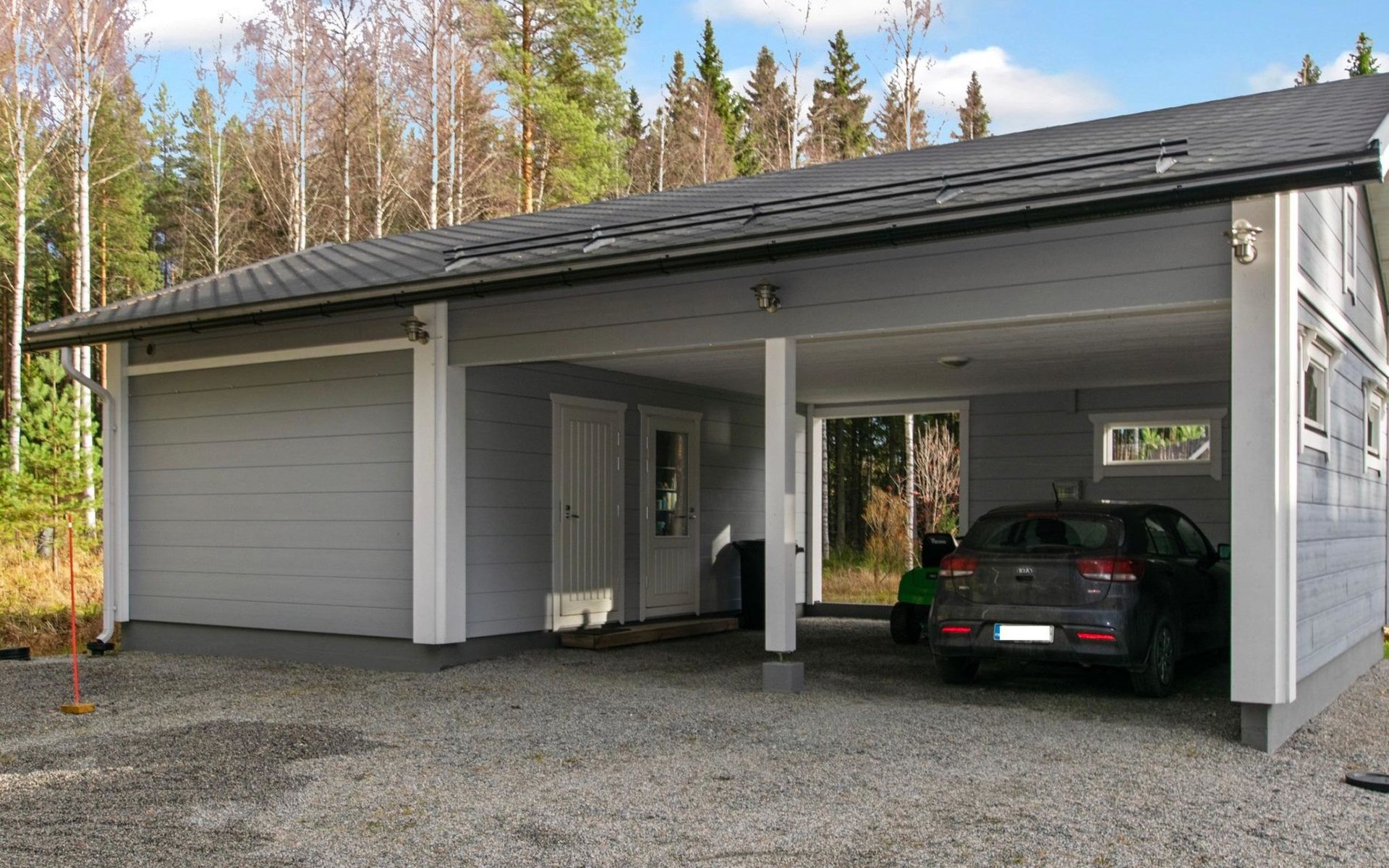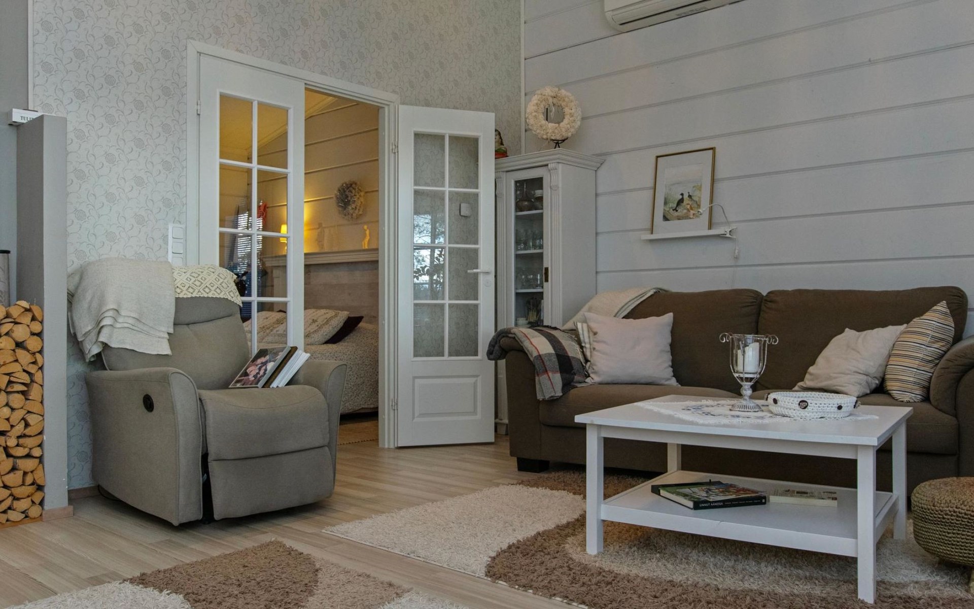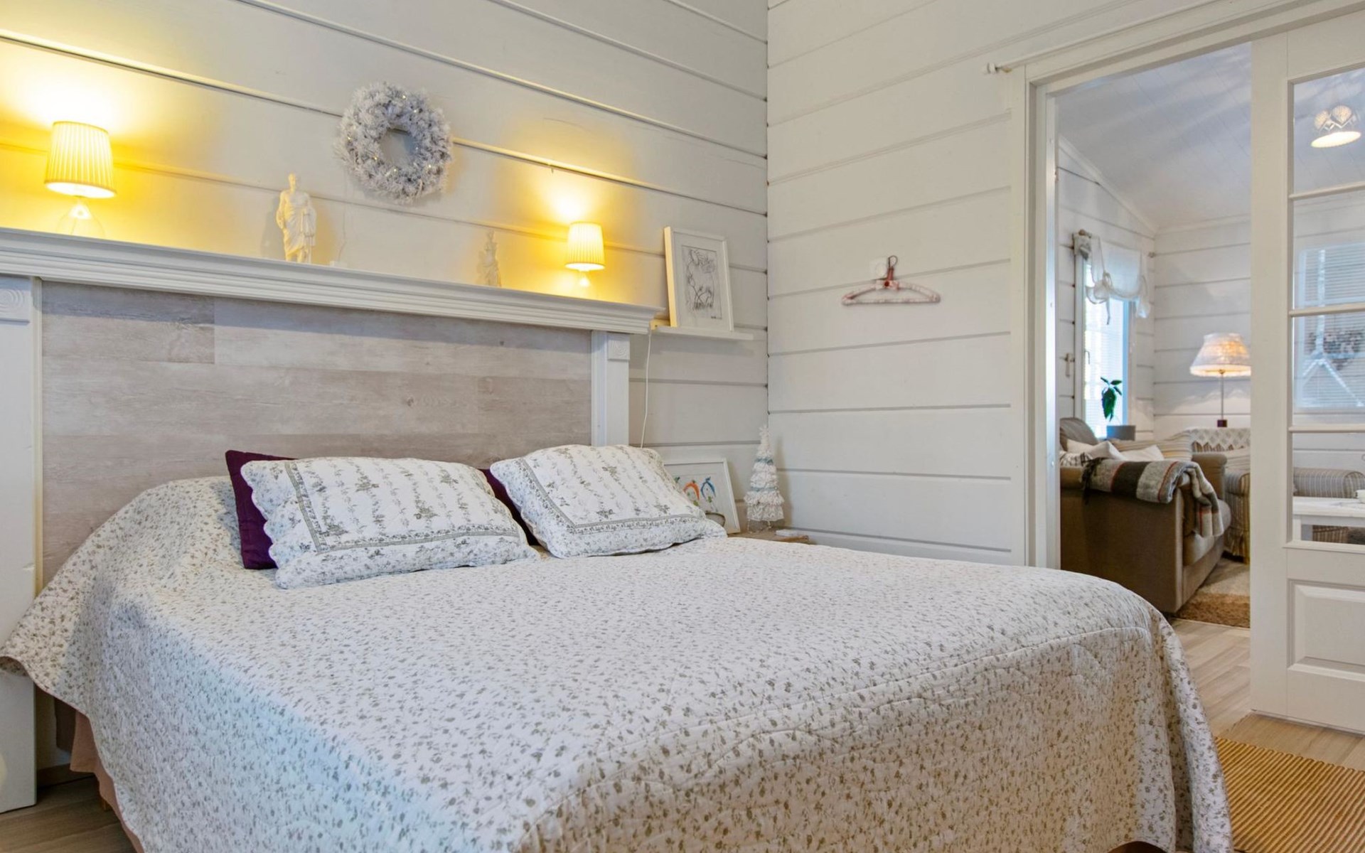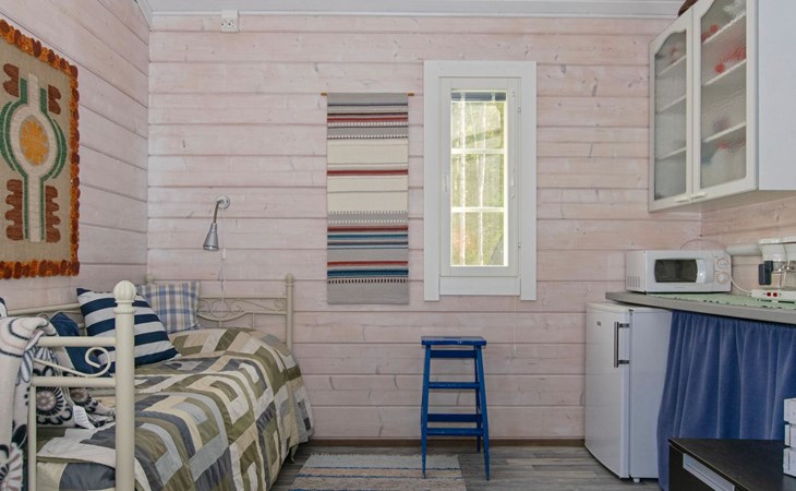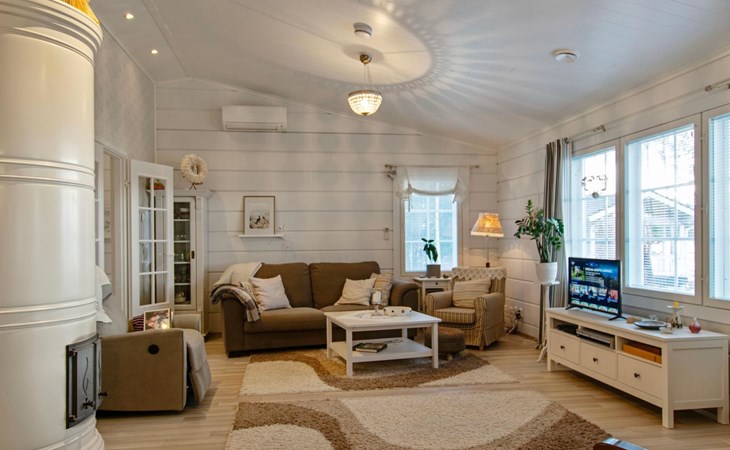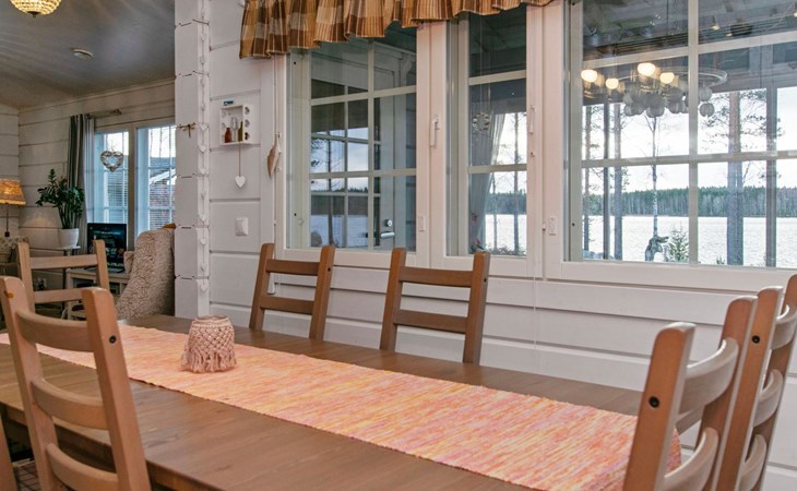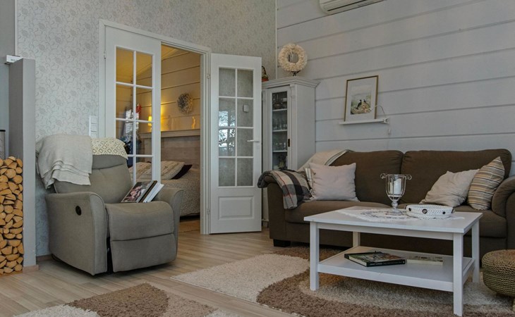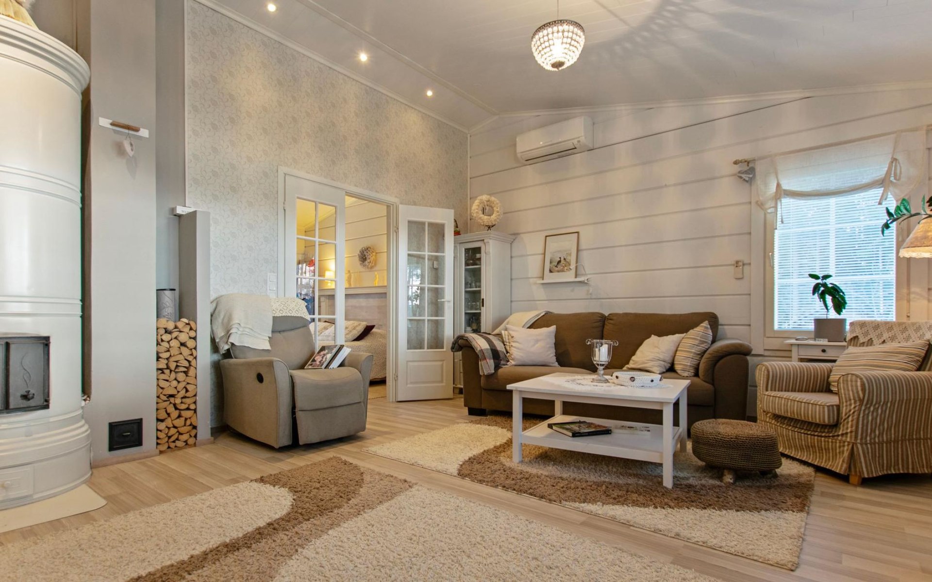 The villa, built in 2014, is made of logs and includes a spacious living room with a wood-burning fireplace. The kitchen features a dining area for eight people. There are two bedrooms, each with two beds. Additionally, a separate room (with electric heating) connected to the carport offers two beds, and the lakeside sauna has a pull-out sofa bed that converts into a 160 x 200 cm double bed.