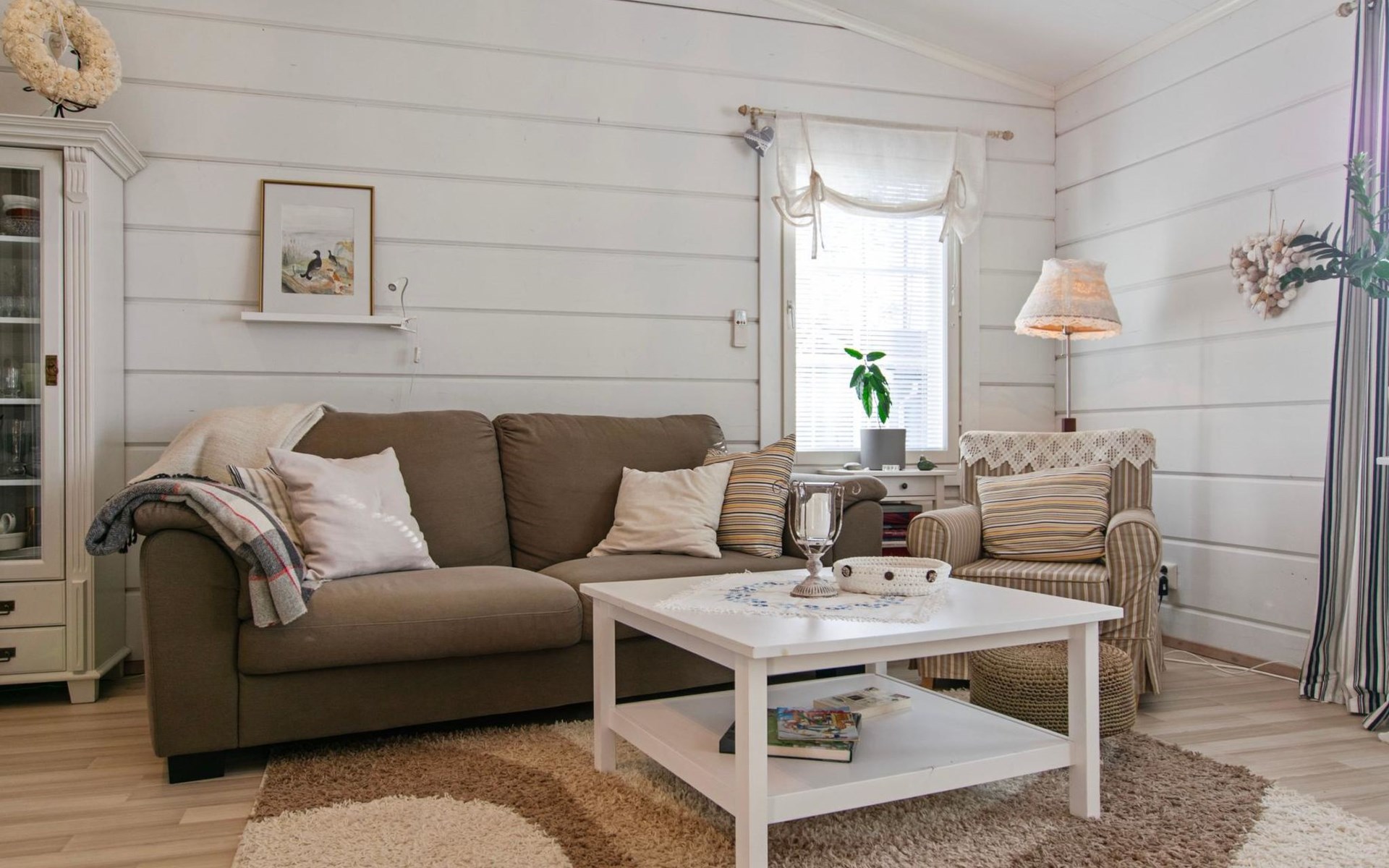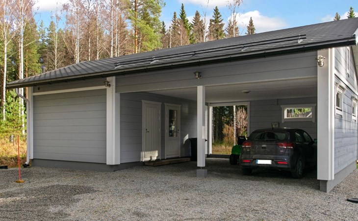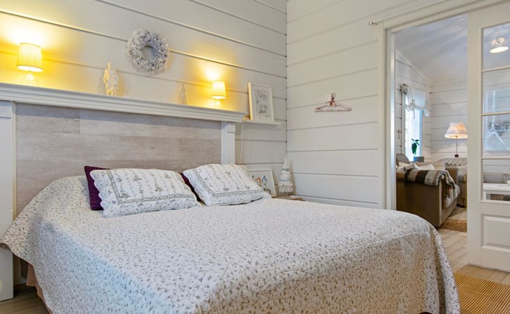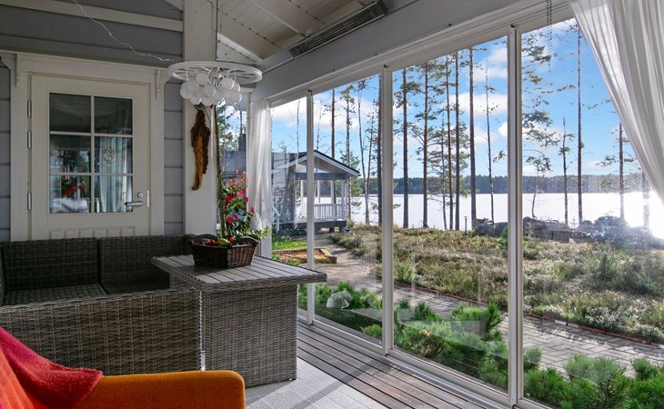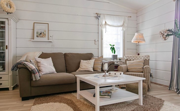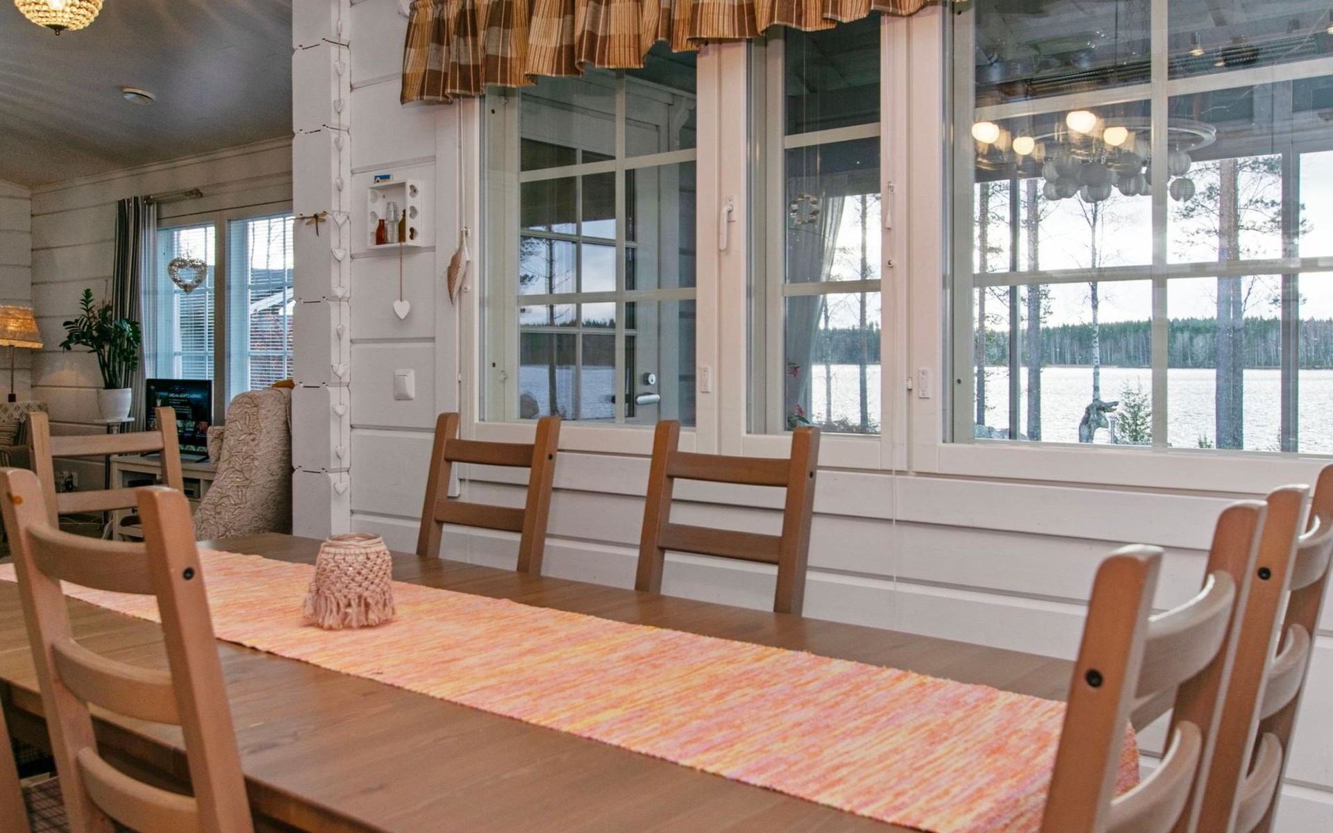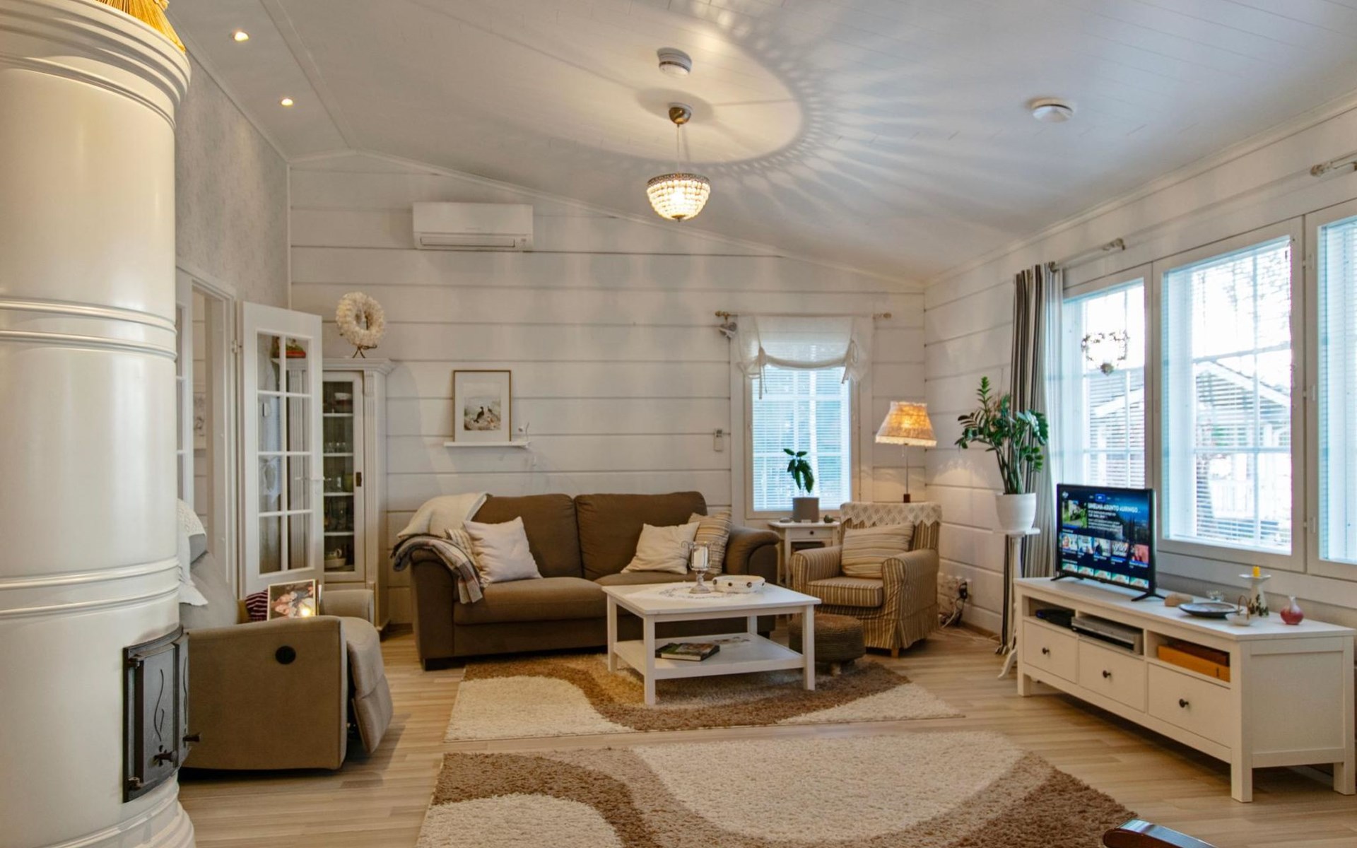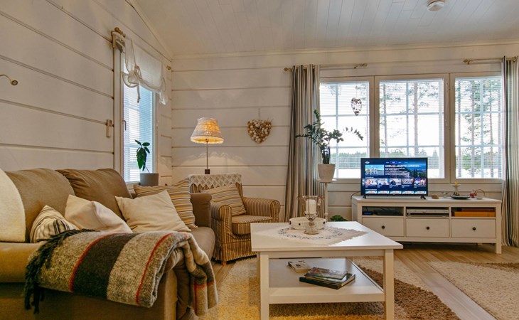 The villa, built in 2014, is made of logs and includes a spacious living room with a wood-burning fireplace. The kitchen features a dining area for eight people. There are two bedrooms, each with two beds. Additionally, a separate room (with electric heating) connected to the carport offers two beds, and the lakeside sauna has a pull-out sofa bed that converts into a 160 x 200 cm double bed.