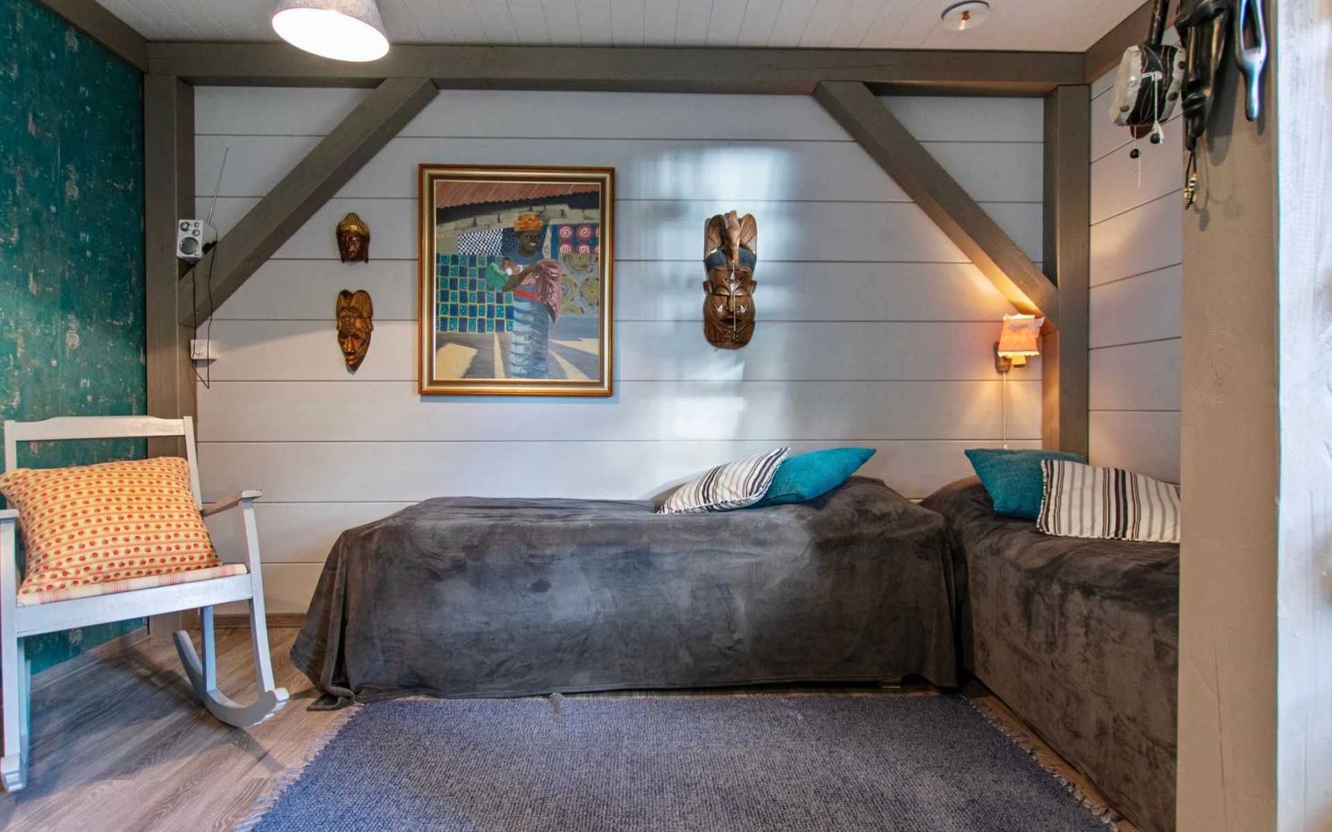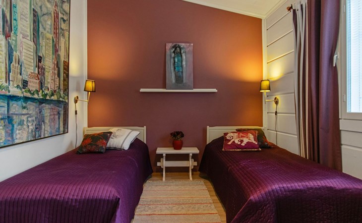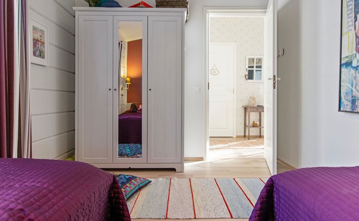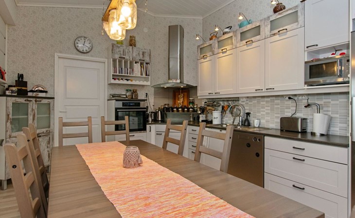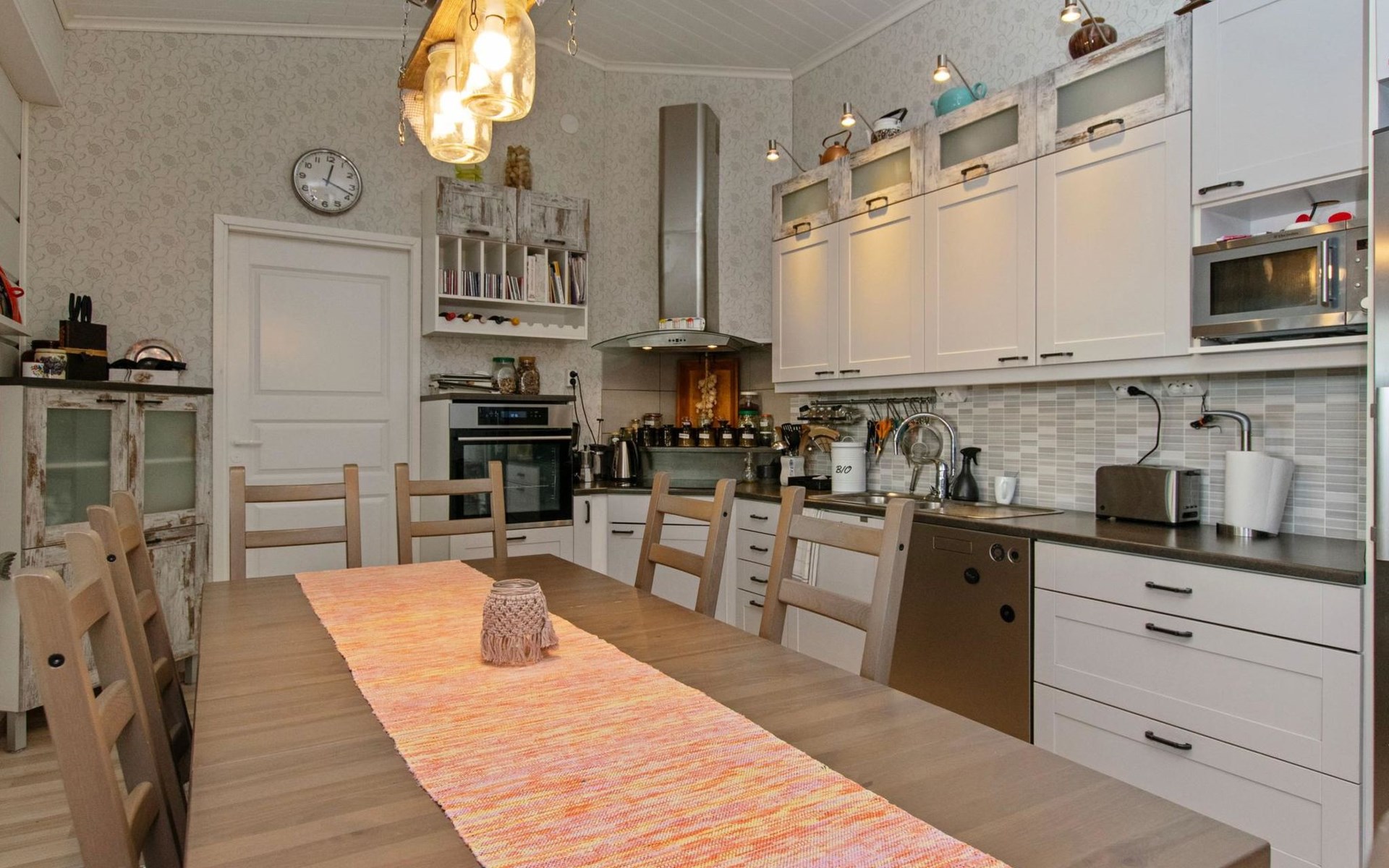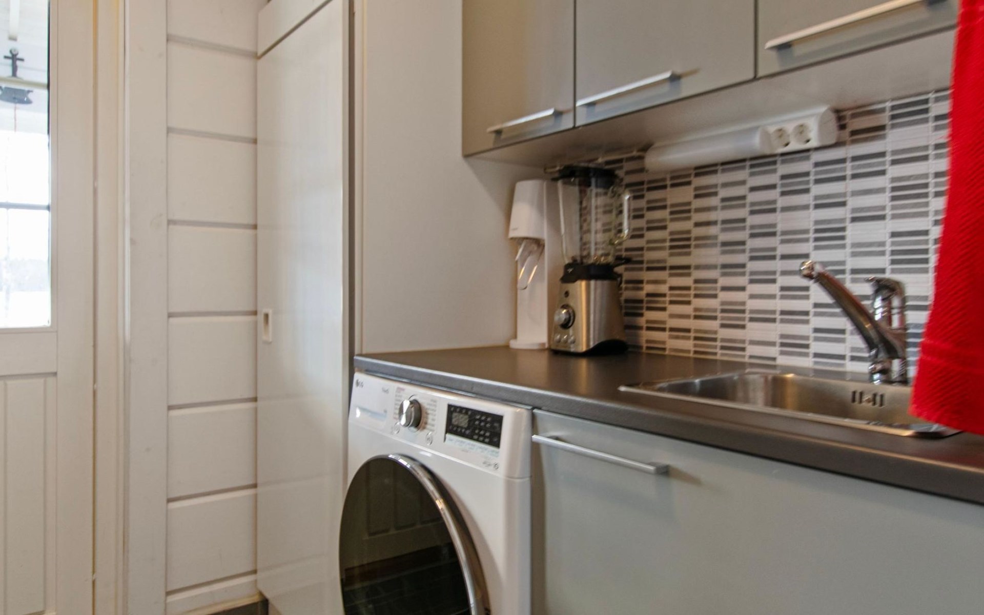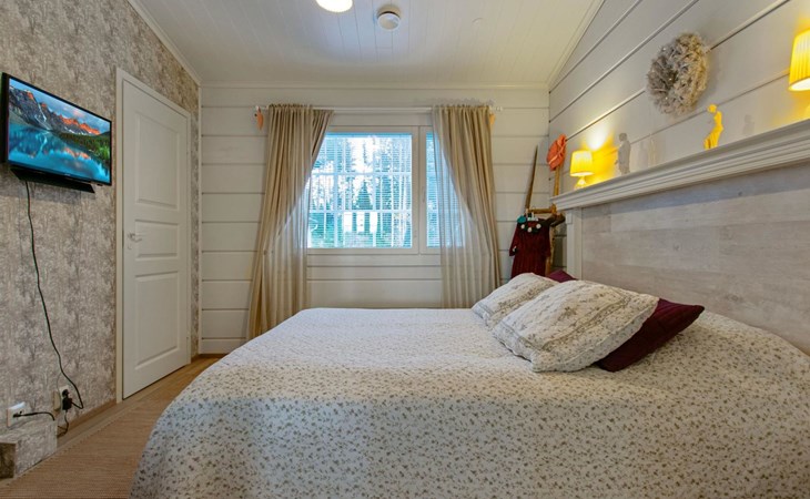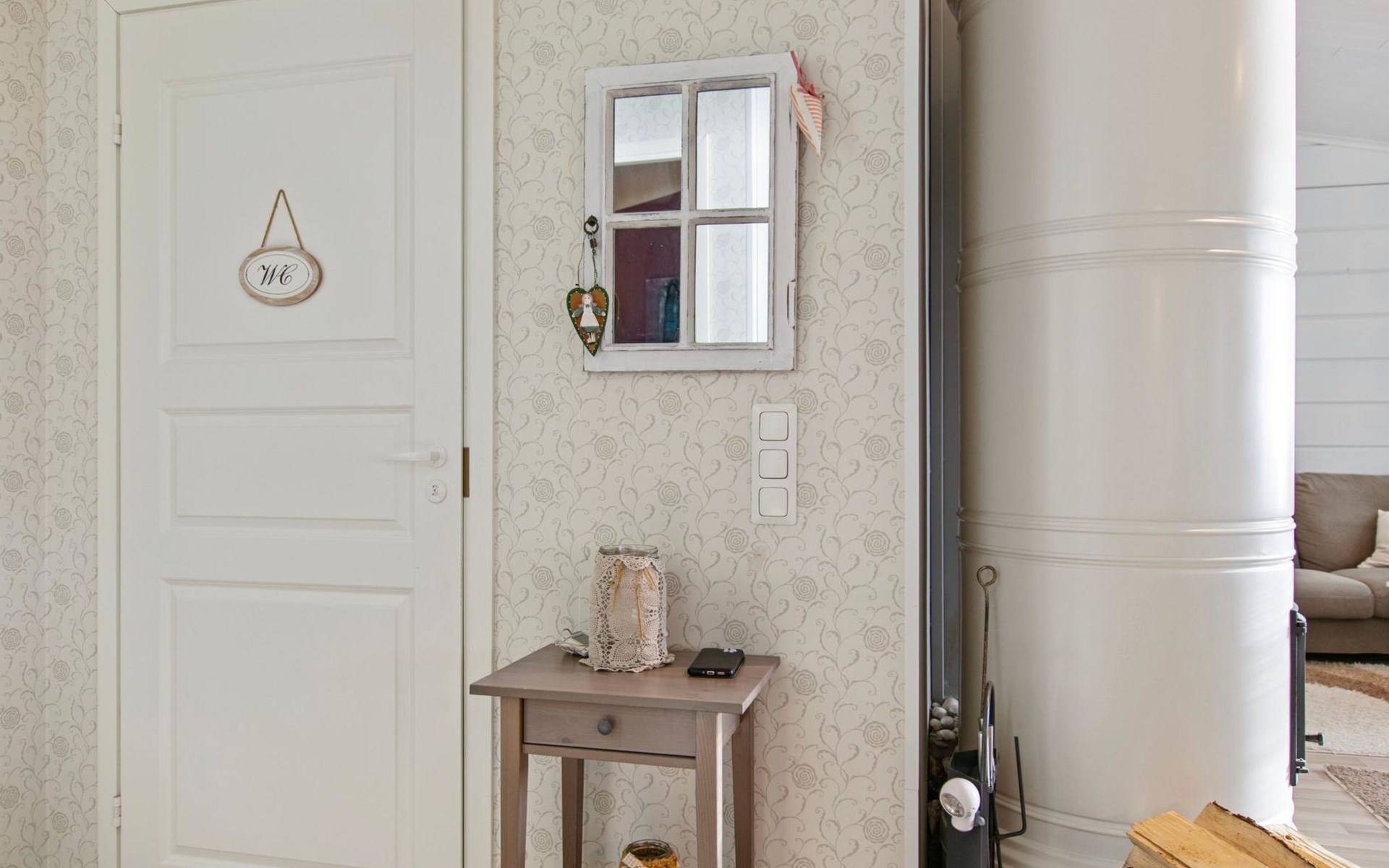 The villa, built in 2014, is made of logs and includes a spacious living room with a wood-burning fireplace. The kitchen features a dining area for eight people. There are two bedrooms, each with two beds. Additionally, a separate room (with electric heating) connected to the carport offers two beds, and the lakeside sauna has a pull-out sofa bed that converts into a 160 x 200 cm double bed.