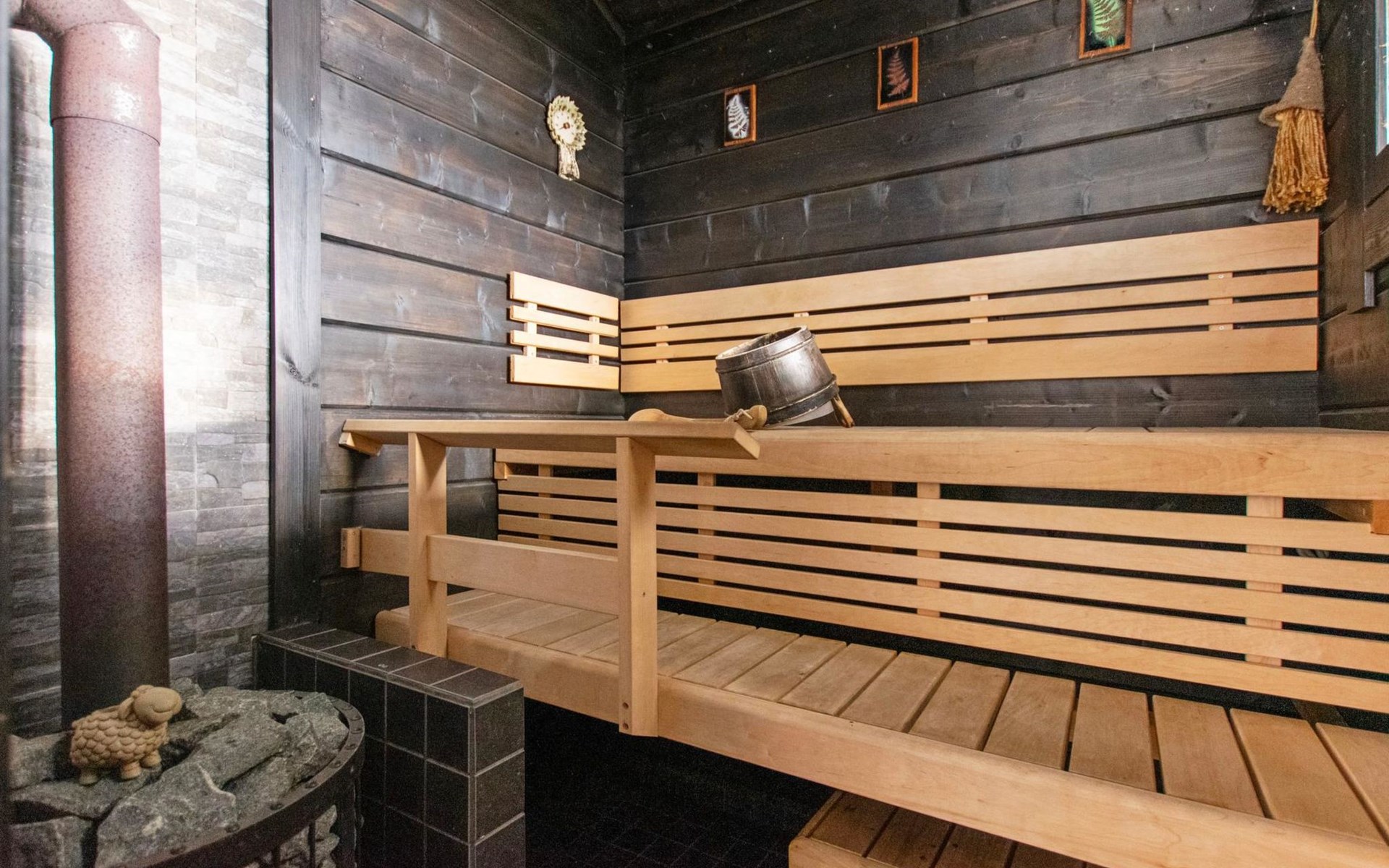 The lakeside sauna is equipped with a wood-burning stove. Cold water is supplied to the sauna via a faucet, and water is heated in a wood-fired cauldron.