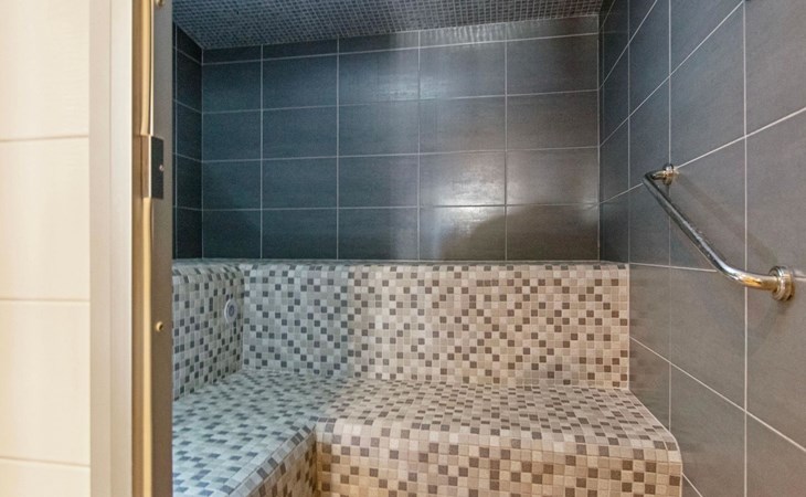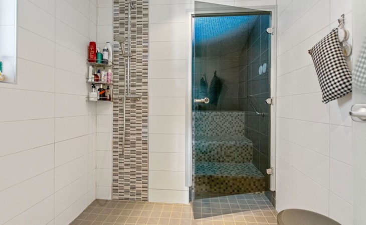 The villa also includes a separate WC, a steam sauna, a bathroom with a shower, and a utility room with direct access to the glass-enclosed terrace.