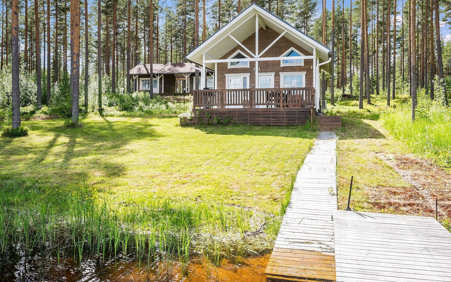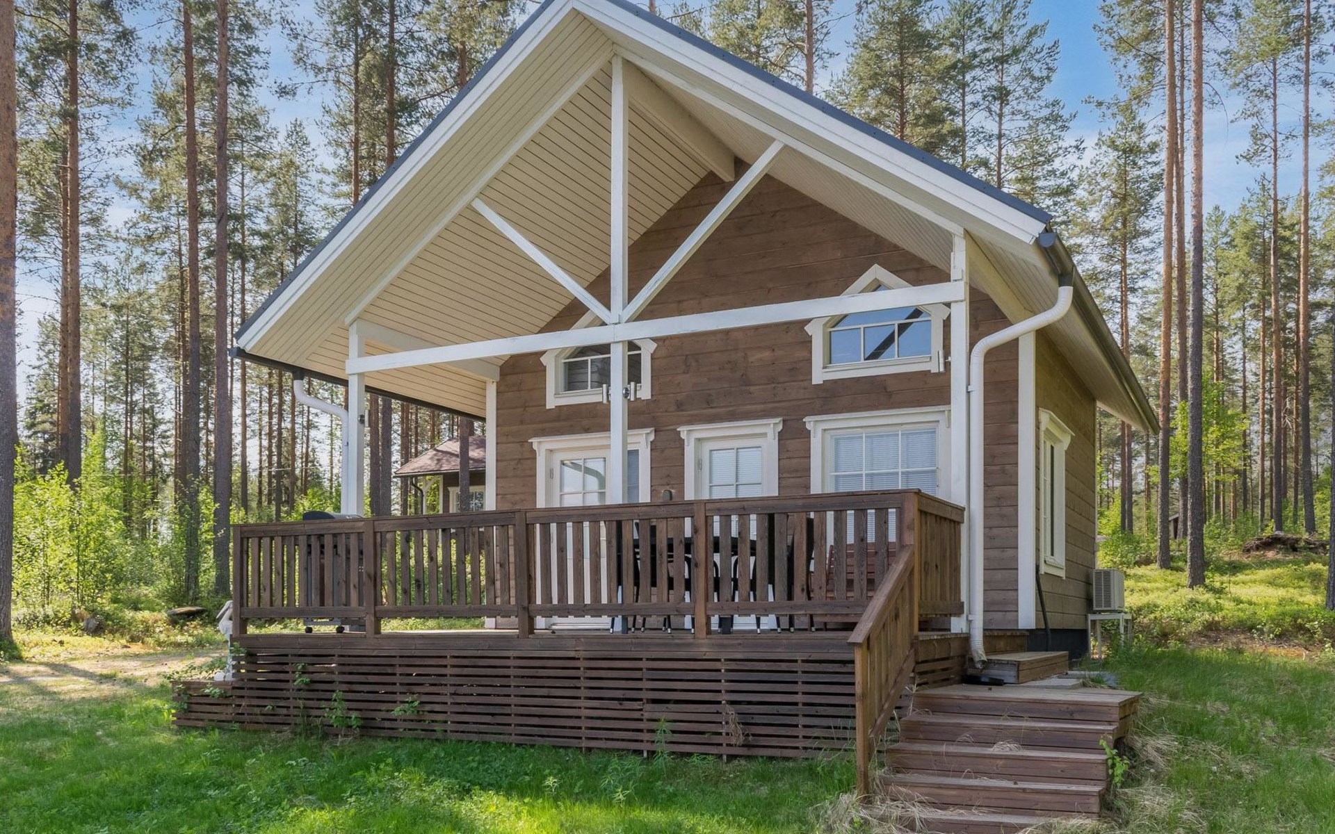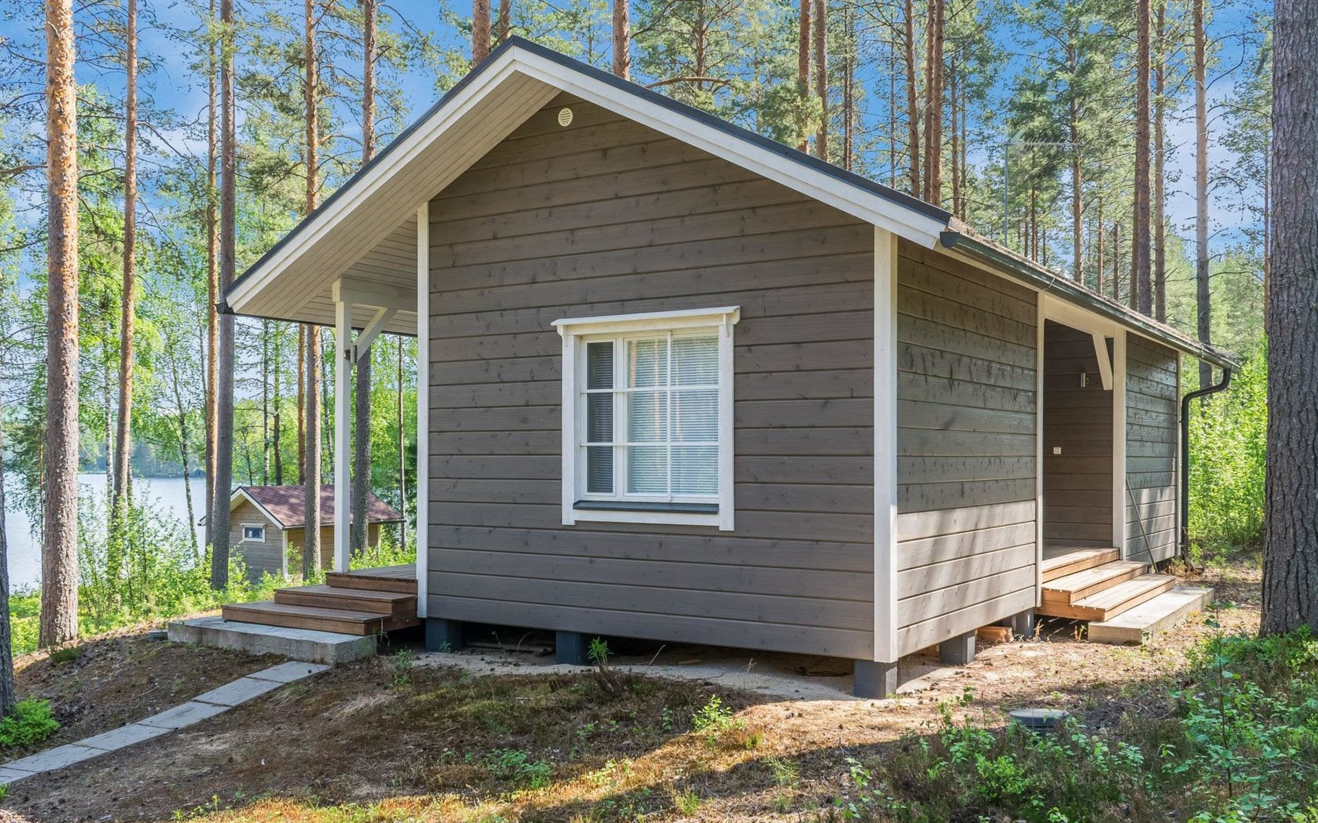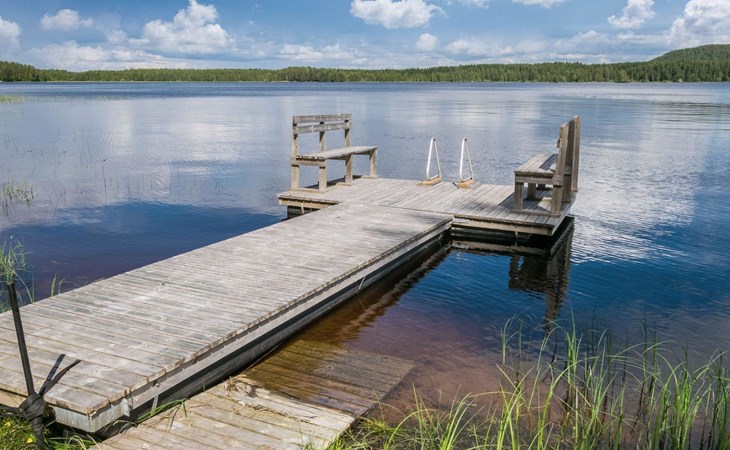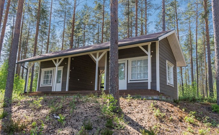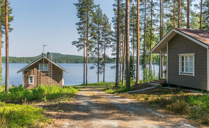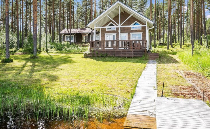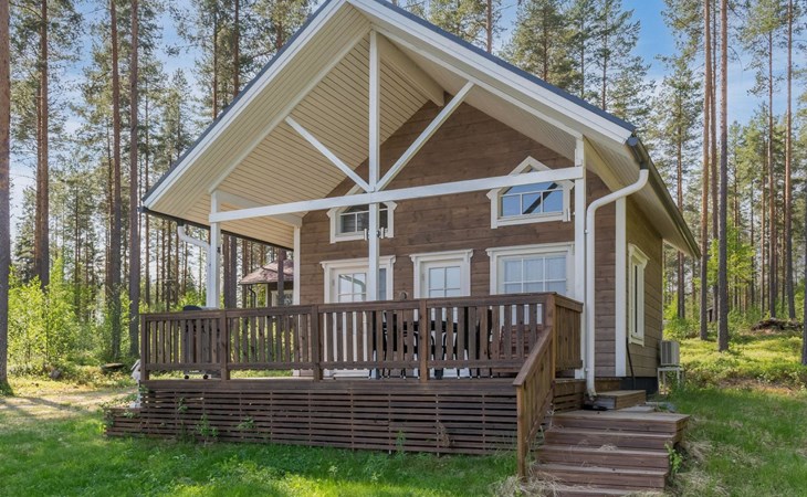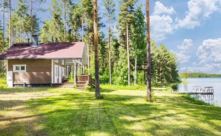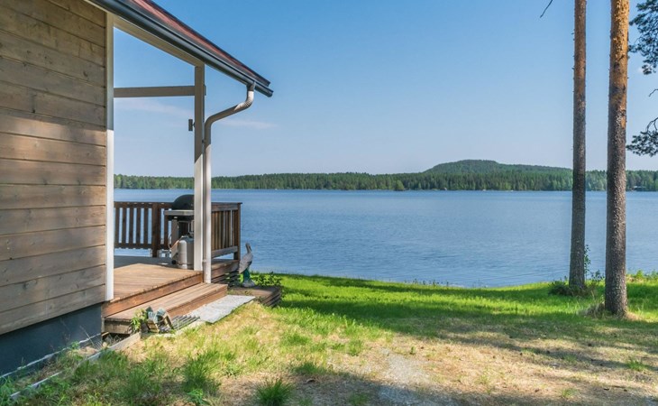87 km northeast of Joensuu and 25 km southwest of Lieksa town center, Lake Pielinen (871.2 km²) 15 m, shallow sandy shore, own beach, private boat, and a pier. The wooden holiday cabin was built in 2018. It features a living room/kitchen, a sleeping loft with 2 spring mattresses, a bathroom, a wood-heated sauna, and a large terrace. The year-round outbuilding (36 m²) has 2 rooms, each with 2 beds, electric heating, and a TV.