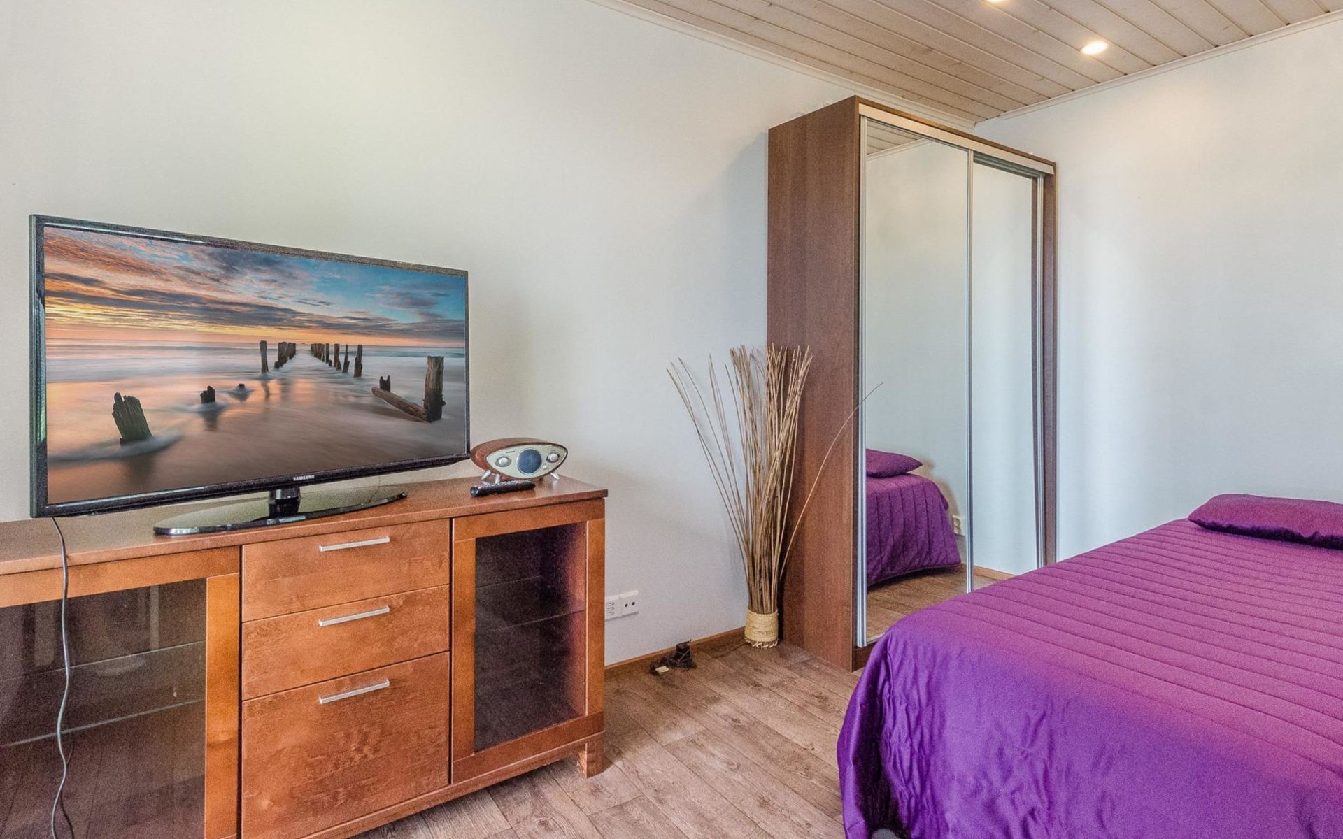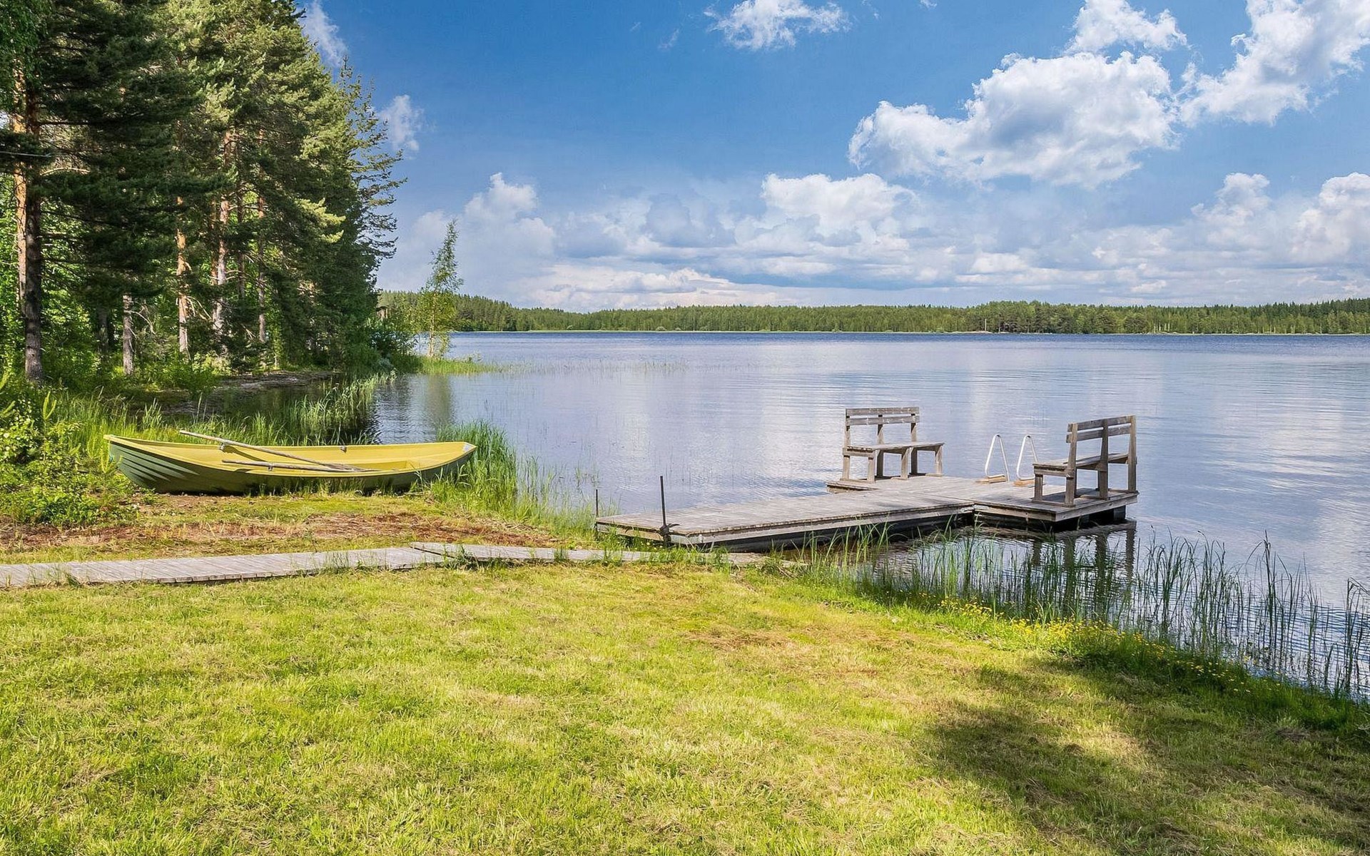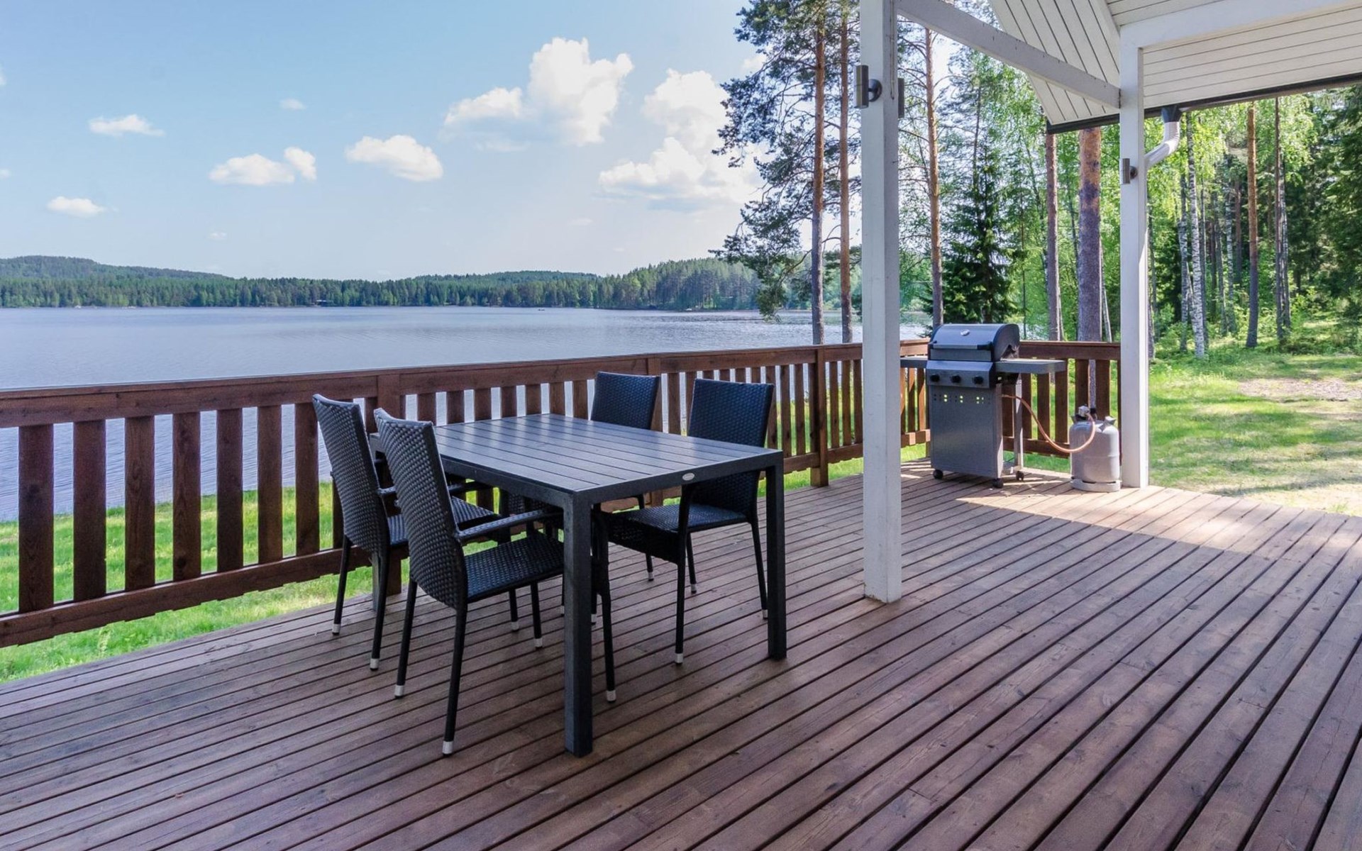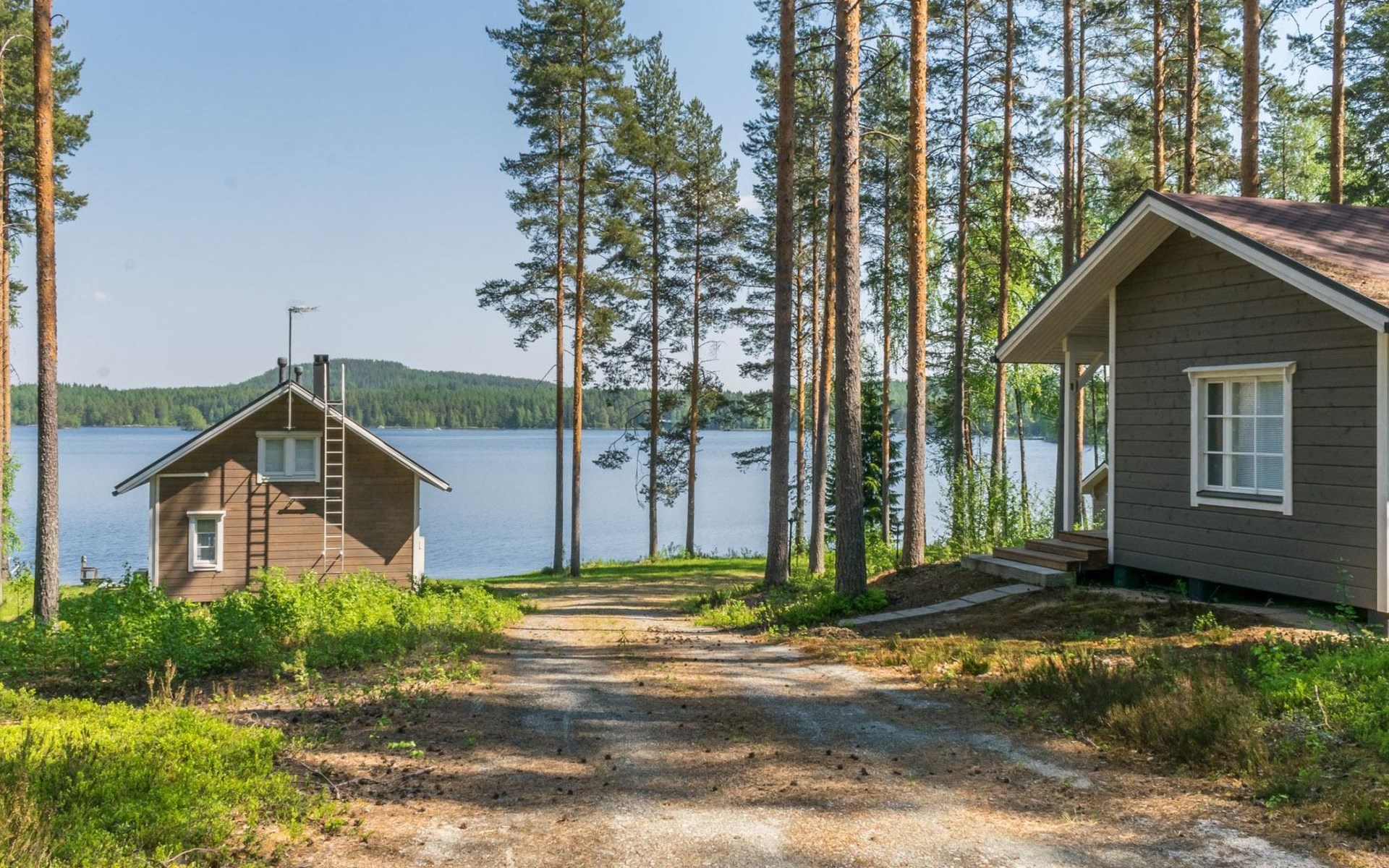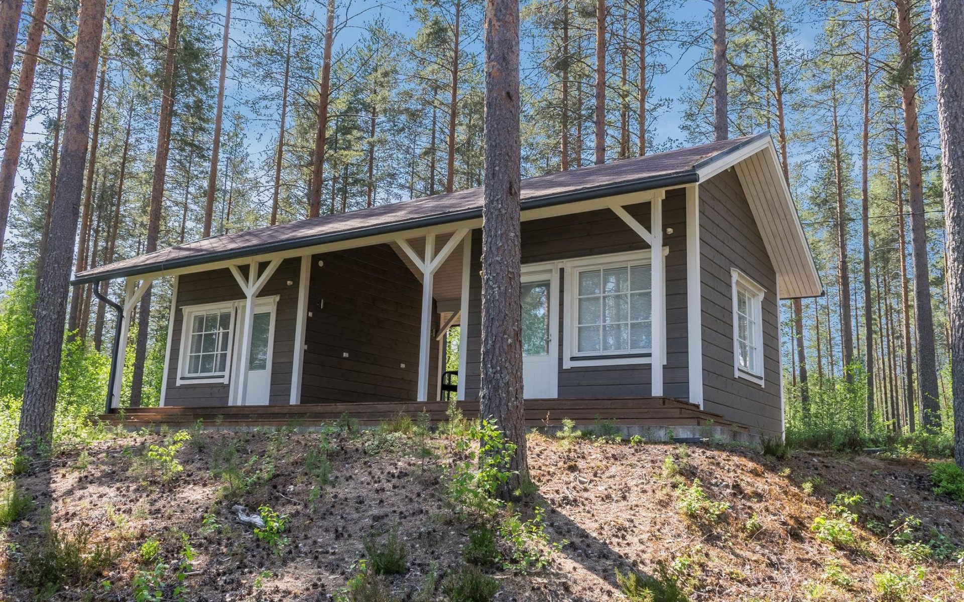 87 km northeast of Joensuu and 25 km southwest of Lieksa town center, Lake Pielinen (871.2 km²) 15 m, shallow sandy shore, own beach, private boat, and a pier. The wooden holiday cabin was built in 2018. It features a living room/kitchen, a sleeping loft with 2 spring mattresses, a bathroom, a wood-heated sauna, and a large terrace. The year-round outbuilding (36 m²) has 2 rooms, each with 2 beds, electric heating, and a TV.