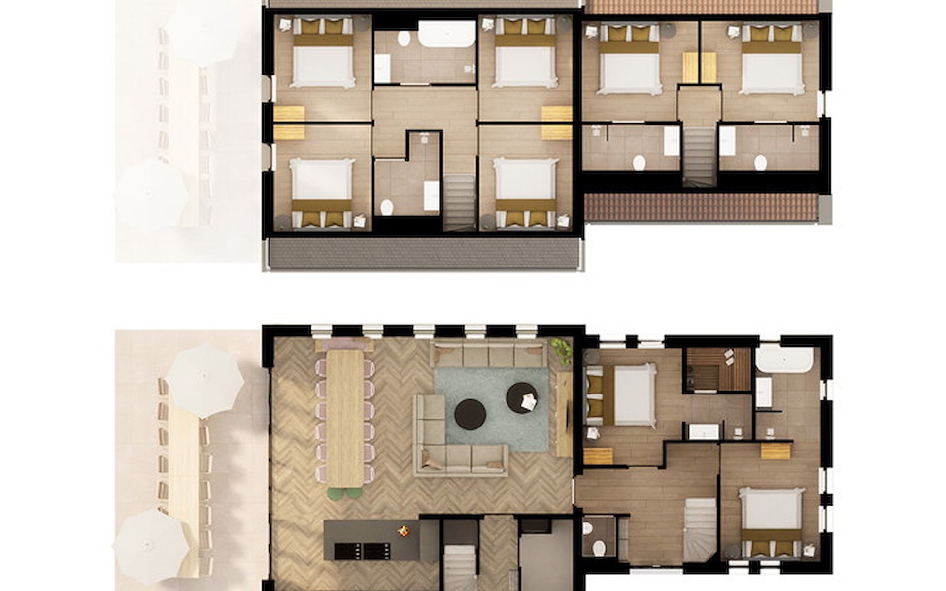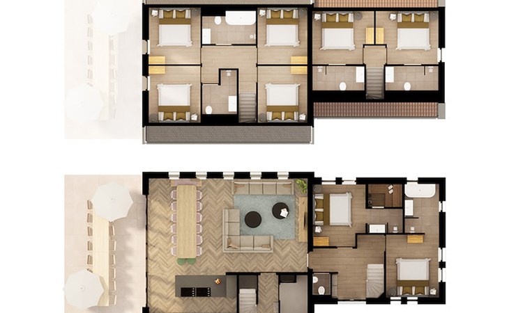 In der ersten Etage finden Sie weitere 6 Schlafzimmer mit je 2 Einzelbetten, von denen 2 mit einem Smart-TV mit Streaming-Funktion ausgestattet sind. Insgesamt befinden sich 4 Bäder in der ersten Etage: 2 En-Suite-Badezimmer mit Dusche, Waschbecken und Toilette, 1 Badezimmer mit Badewanne, Dusche, Waschbecken und Toilette und 1 Badezimmer mit Dusche, Waschbecken und Toilette.