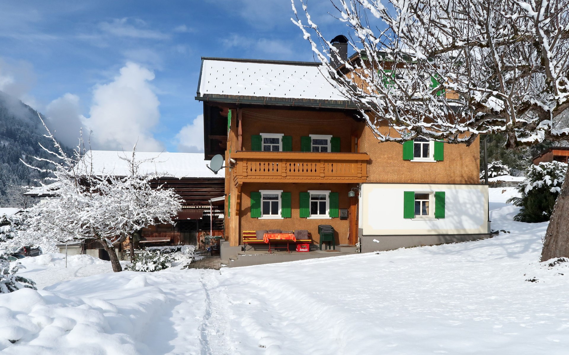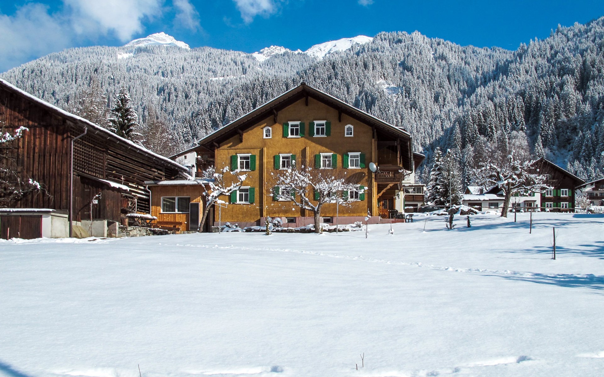 Grosses Bauernhaus "Hermann". 150 m vom Zentrum von Gortipohl, 11 km vom Zentrum von Schruns, 20 km vom Zentrum von Bludenz, sonnige Lage am Hang. Zur Mitbenutzung: Grundstück 1'000 m2. Im Hause: Skiraum. Parkplatz auf dem Grundstück. Einkaufsgeschäft 1 km, Supermarkt 2 km, Bushaltestelle "Gortipohl Zentrum" 130 m. Bergeisenbahn 2.9 km, Sessellift 1 km, Skibushaltestelle 100 m, Schlittelbahn 1 km, Langlaufloipe 200 m.