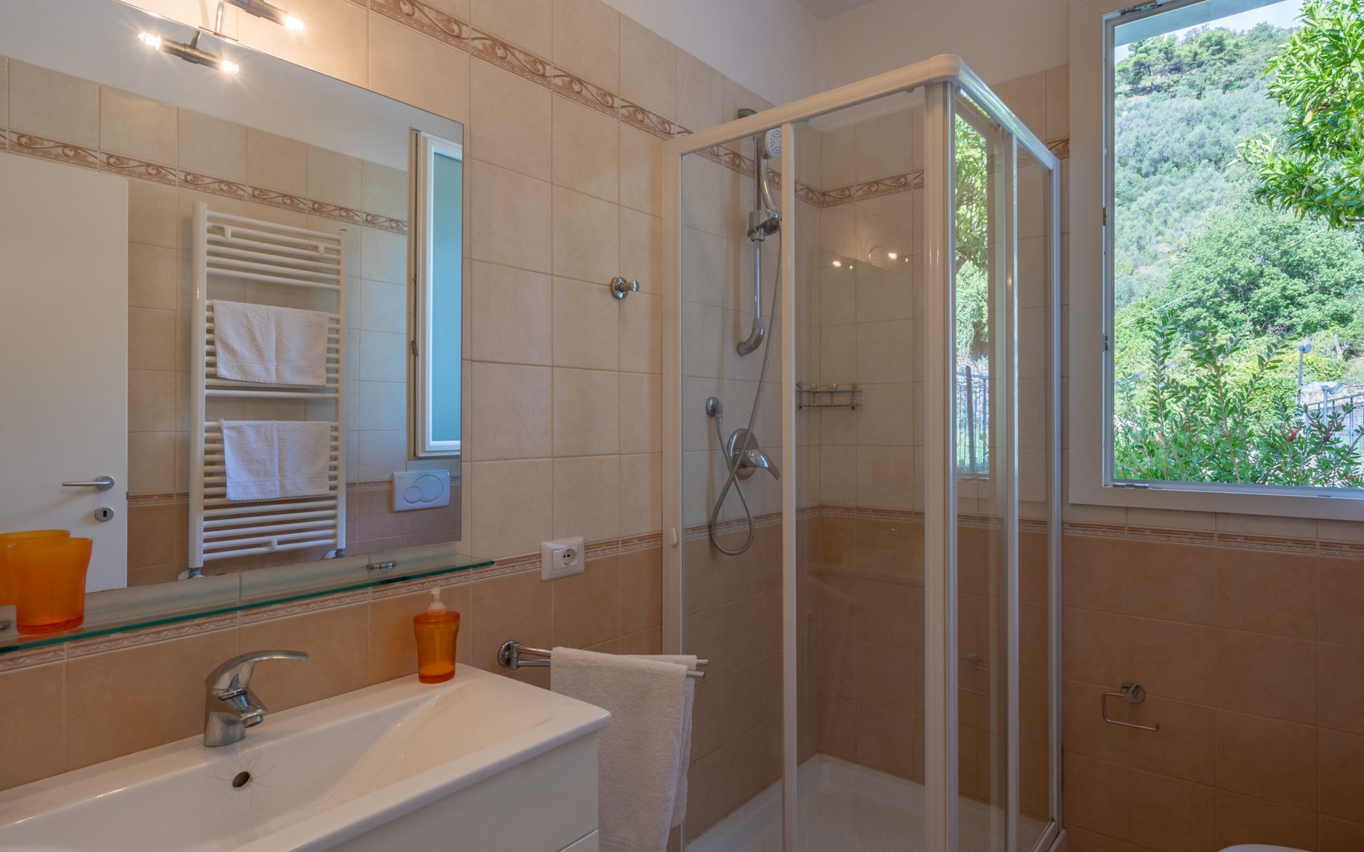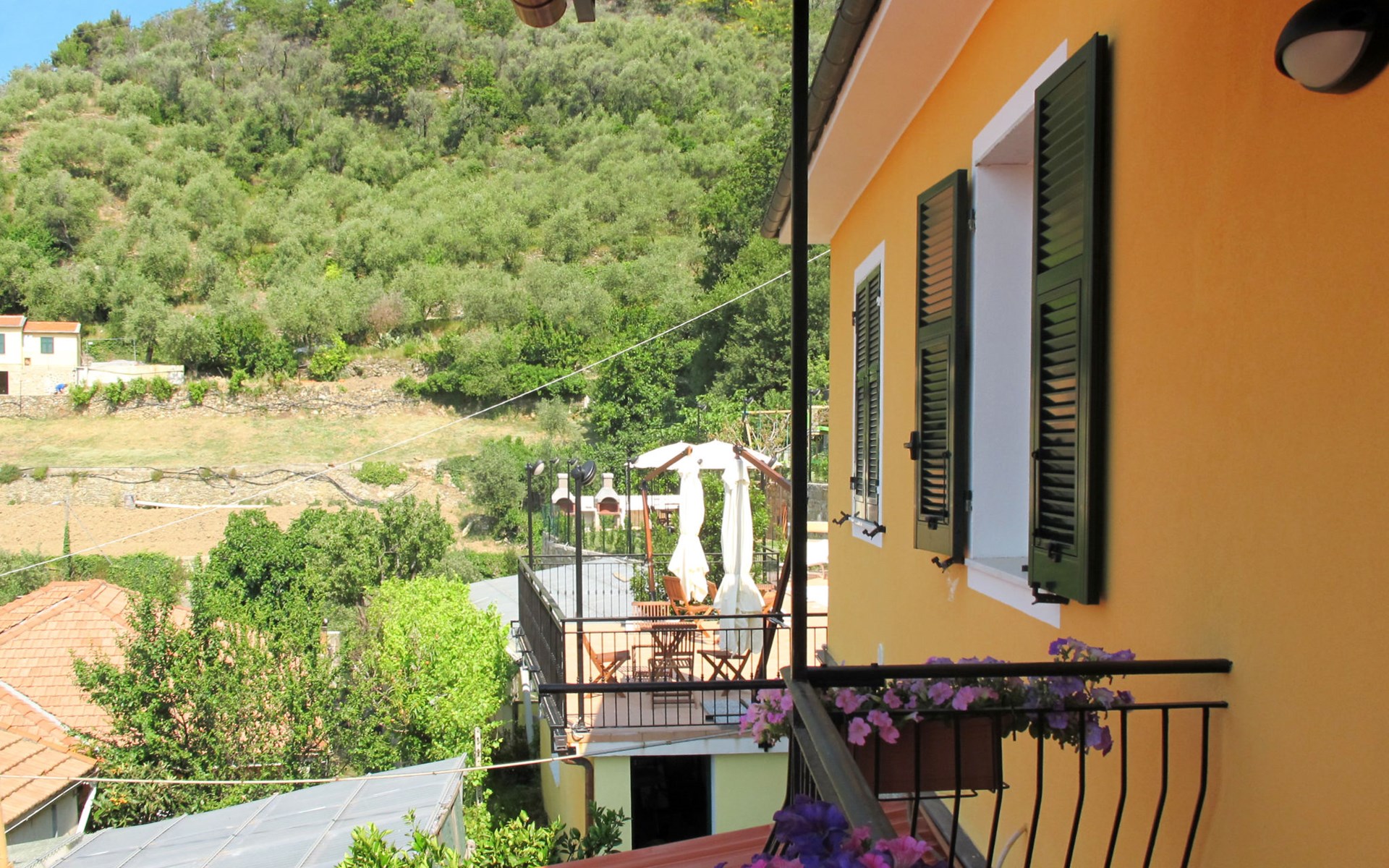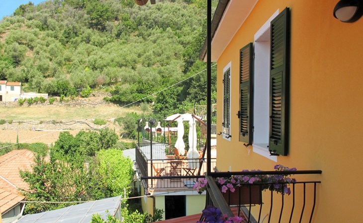 Kinderfreundliche, schöne Residenz "Agriturismo Ca' di Nonni", 400 m.ü.M., auf 2 Stockwerken, umgeben von Bäumen und Weinbergen. 4 Wohnungen in der Residenz. 100 m vom Zentrum von Pietrabruna, am Ortsrand, 10 km vom Zentrum von San Lorenzo al Mare, 16 km vom Zentrum von Imperia, erhöhte Lage am Hang, 9.5 km vom Meer, im Grünen. Zur Mitbenutzung: schöner, gepflegter terrassierter Garten, 1'000 m2 mit Rasen und Pflanzen, Liegewiese, Schwimmbad (10 x 5 m, 120 cm tief, saisonale Verfügbarkeit: 01.Mai. - 01.Okt.). Aussendusche, Tischtennis, Sitzplatz, Laube, Gartenmöbel, Grill, Kinderspielplatz (Rutschbahn, Schaukel), Poolpflege durch den Besitzer/Gärtner. In der Anlage: Aufenthaltsraum mit TV, Fitnessraum, Tischfussball, Einstellraum für Fahrräder, Sonnenterrasse, Waschmaschine, Wäschetrockner (zur Mitbenutzung), Fahrradverleih. 20 m lange steile, schmale Zufahrt. Treppenweg bis zum Haus. Öffentliche Parkplätze 50 m auf der Strasse. Einkaufsgeschäft 200 m, Lebensmittelgeschäft 200 m, Supermarkt 10 km, Einkaufszentrum 10 km, Restaurant, Bar 300 m, Bäckerei 300 m, Café 200 m, Bushaltestelle 150 m, Sandstrand "San Lorenzo al Mare" 10 km, Steinstrand 10 km, Badesee "Laghetti Torre Paponi" 5 km. Nahe gelegene Sehenswürdigkeiten: Pista ciclabile lungo mare 10 km, Museo dell´olio Imperia 18 km, Lavendeldestilation in Pietrabruna. Wandergebiete: Monte Faudo (1149 m) Mountainbike Trails 5 km, Monte Follia 2 km. Jugendgruppen nur auf Anfrage. Bitte beachten: Be- und Entladen am Ferienhaus möglich.
