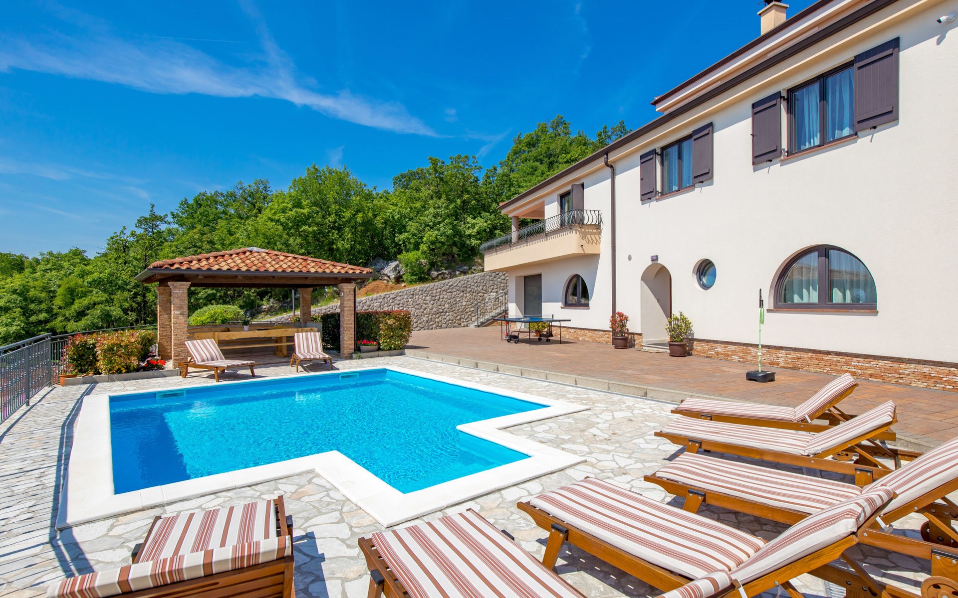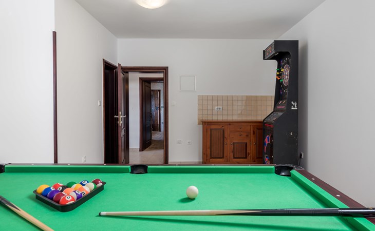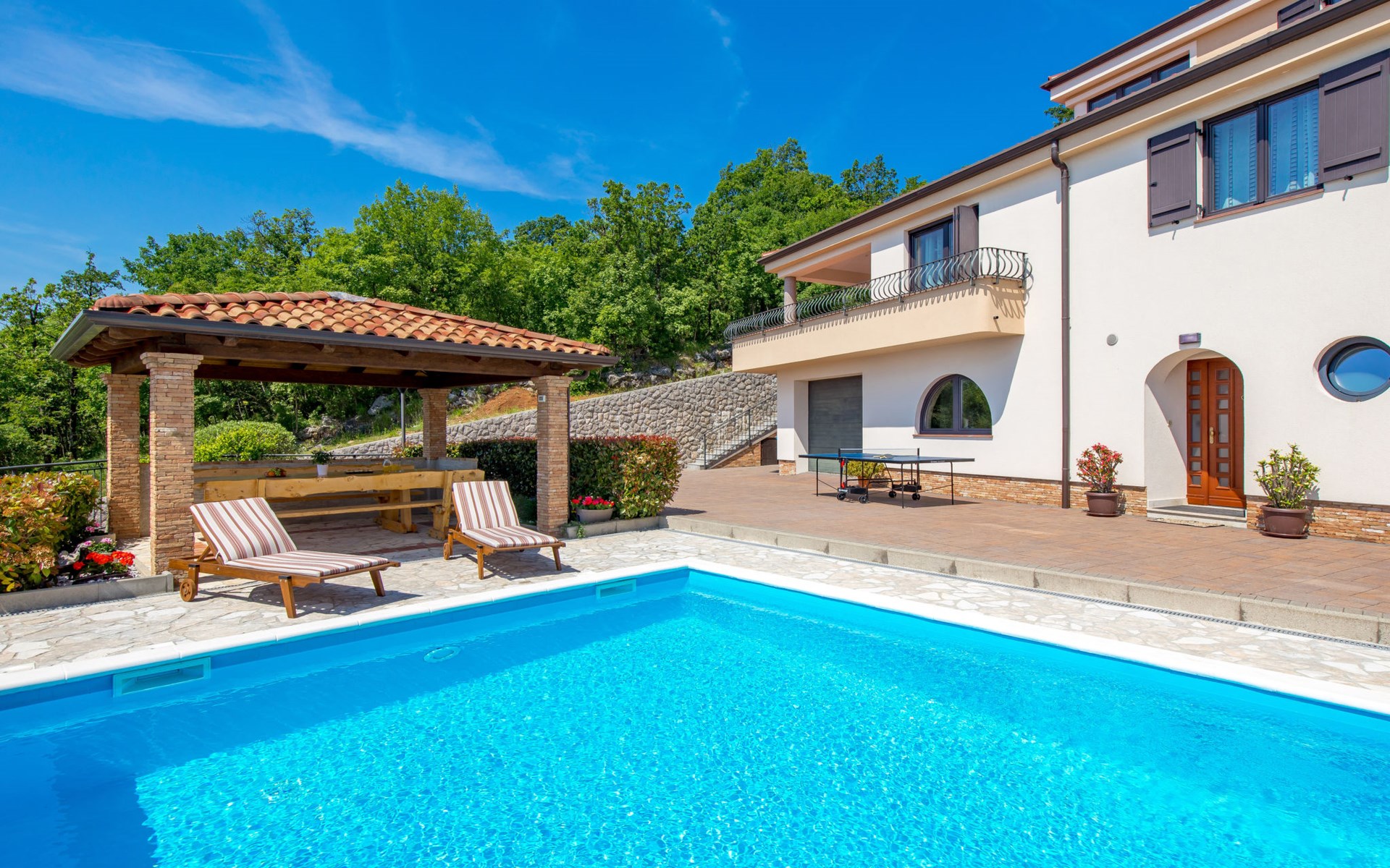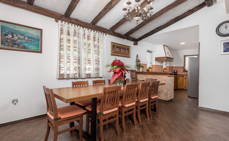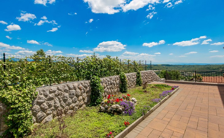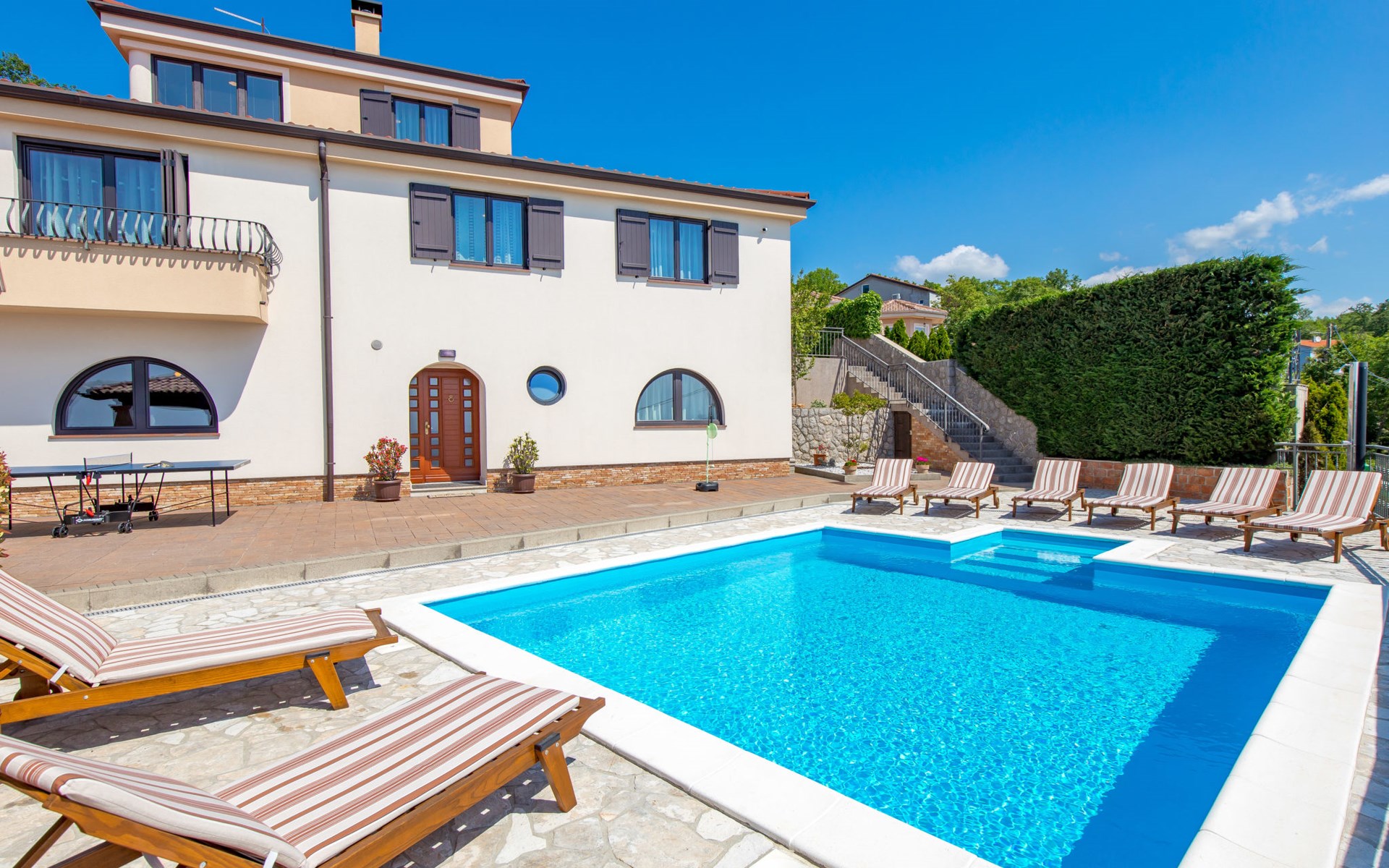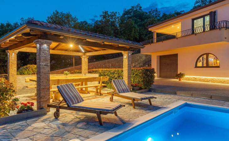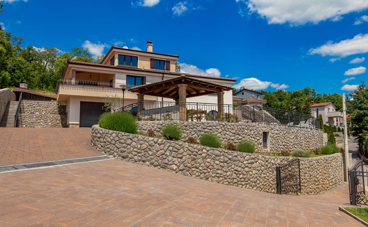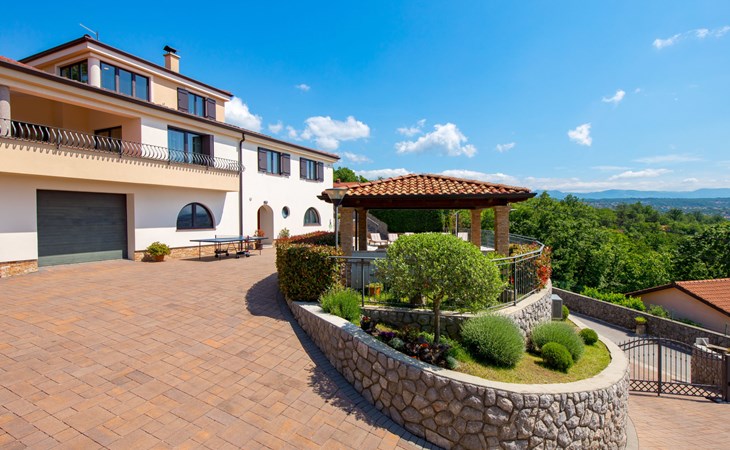 Einfamilienhaus "Villa Toni", auf 3 Stockwerken. 2 km vom Zentrum von Kastav, 7 km vom Zentrum von Opatija, 10 km vom Zentrum von Lovran, 7 km vom Meer. Zur Alleinbenutzung: Grundstück 2'000 m2 (eingezäunt) mit Bäumen, Schwimmbad beheizt (5 x 5 m, 29 m2, 150 cm tief, saisonale Verfügbarkeit: 20.Apr. - 12.Okt.) mit Innentreppe und Salzelektrolyse-Reinigungssystem. Aussendusche, Laube, Terrasse (100 m2), Gartenmöbel, Grill. Im Hause: Internetzugang, Billard, Waschmaschine. 20 m Fussweg bis zum Haus. Parkplatz (für 5 Autos) auf dem Grundstück, Einzelgarage. Einkaufsgeschäft 1 km, Bushaltestelle 600 m, Kieselstrand 7 km, Felsstrand 7 km. Jugendgruppen nur auf Anfrage. Schwimmbad beheizt (extra). Bitte teilen Sie uns mindestens 7 Tage vor Anreise mit, ob eine Poolheizung erforderlich ist.
