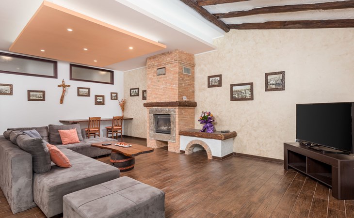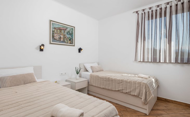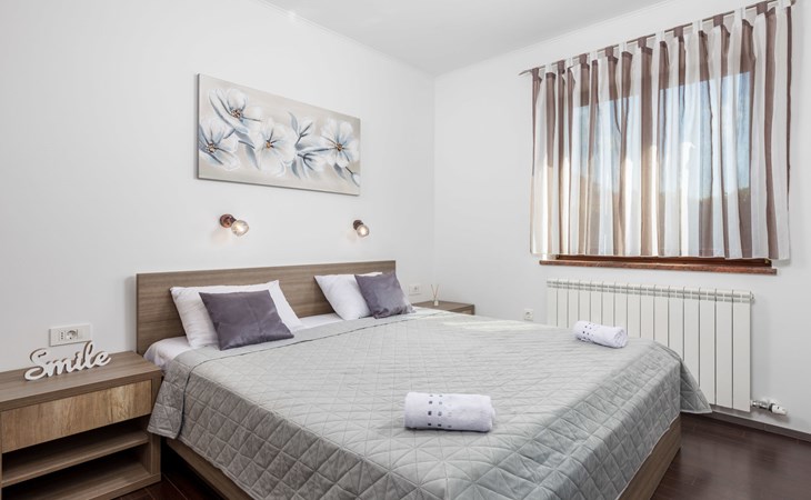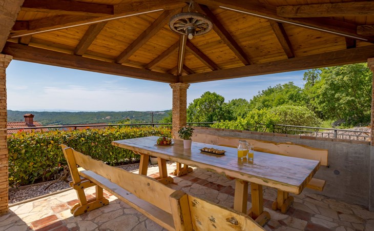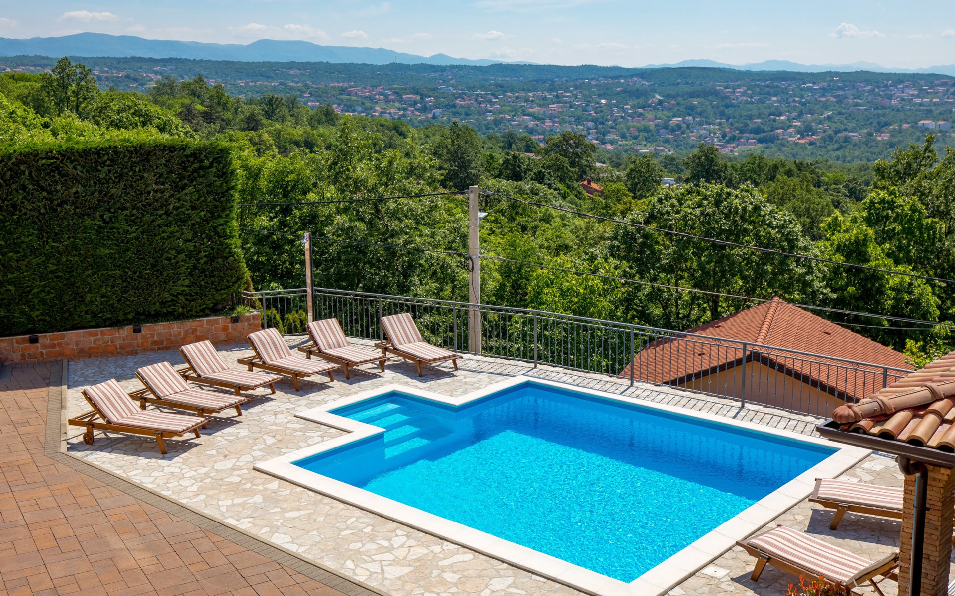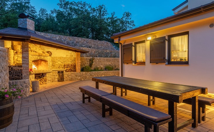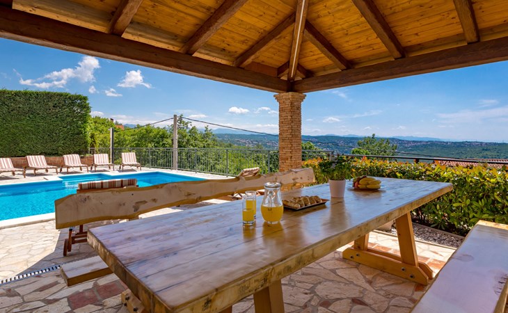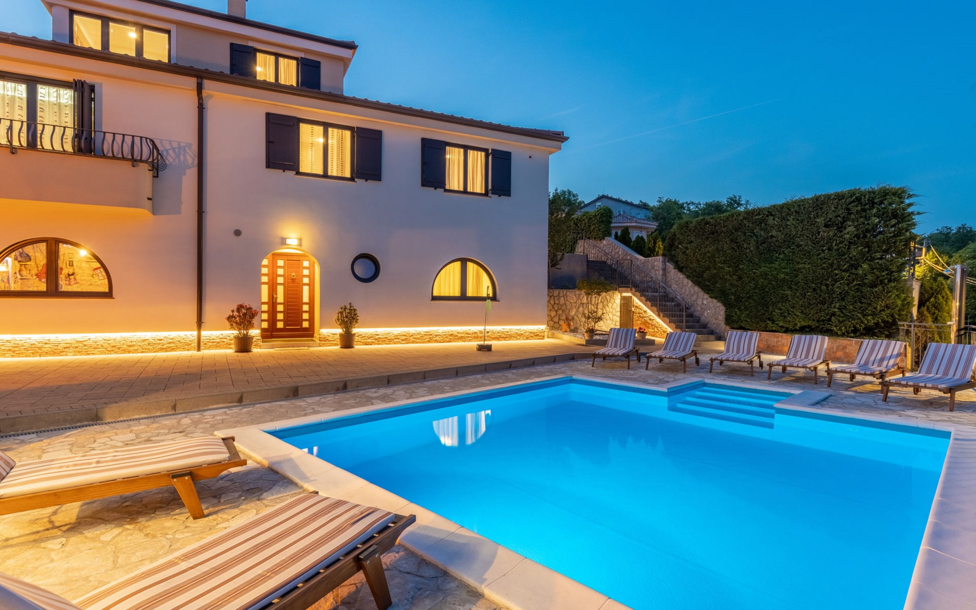 Einfamilienhaus "Villa Toni", auf 3 Stockwerken. 2 km vom Zentrum von Kastav, 7 km vom Zentrum von Opatija, 10 km vom Zentrum von Lovran, 7 km vom Meer. Zur Alleinbenutzung: Grundstück 2'000 m2 (eingezäunt) mit Bäumen, Schwimmbad beheizt (5 x 5 m, 29 m2, 150 cm tief, saisonale Verfügbarkeit: 20.Apr. - 12.Okt.) mit Innentreppe und Salzelektrolyse-Reinigungssystem. Aussendusche, Laube, Terrasse (100 m2), Gartenmöbel, Grill. Im Hause: Internetzugang, Billard, Waschmaschine. 20 m Fussweg bis zum Haus. Parkplatz (für 5 Autos) auf dem Grundstück, Einzelgarage. Einkaufsgeschäft 1 km, Bushaltestelle 600 m, Kieselstrand 7 km, Felsstrand 7 km. Jugendgruppen nur auf Anfrage. Schwimmbad beheizt (extra). Bitte teilen Sie uns mindestens 7 Tage vor Anreise mit, ob eine Poolheizung erforderlich ist.