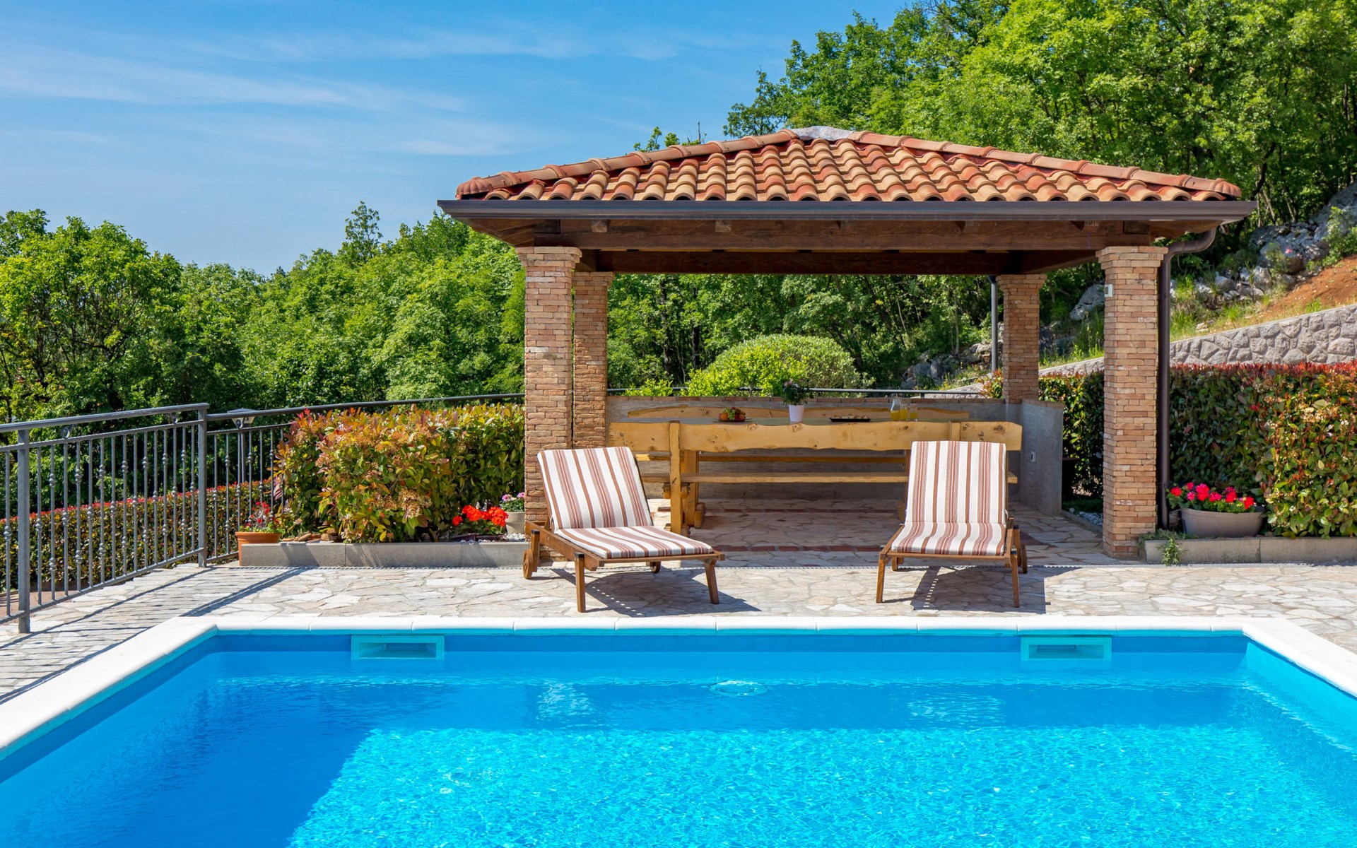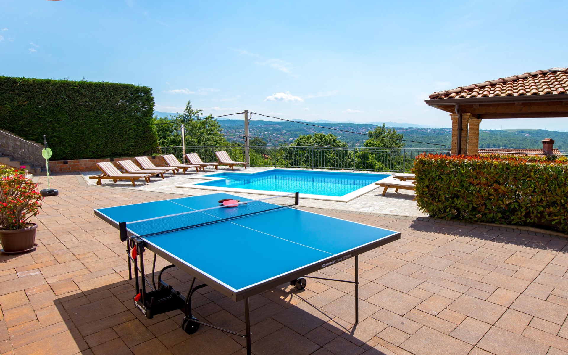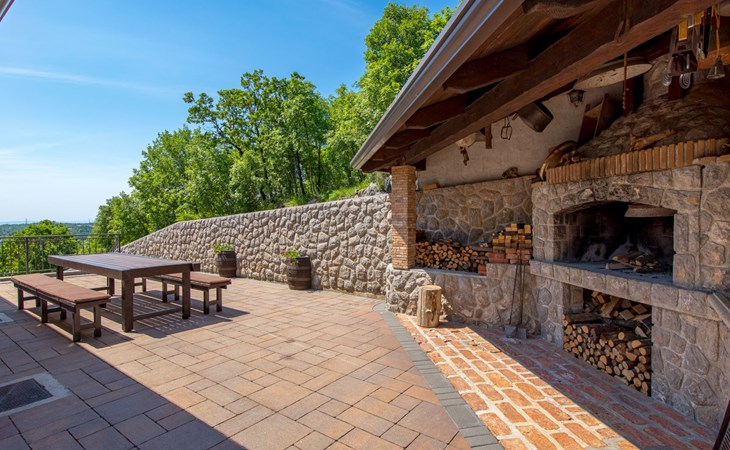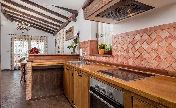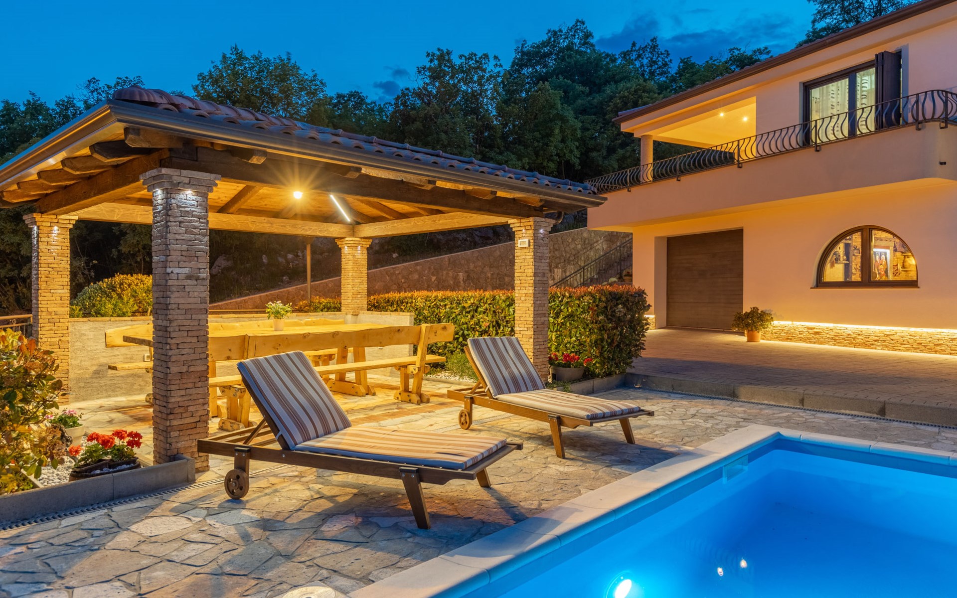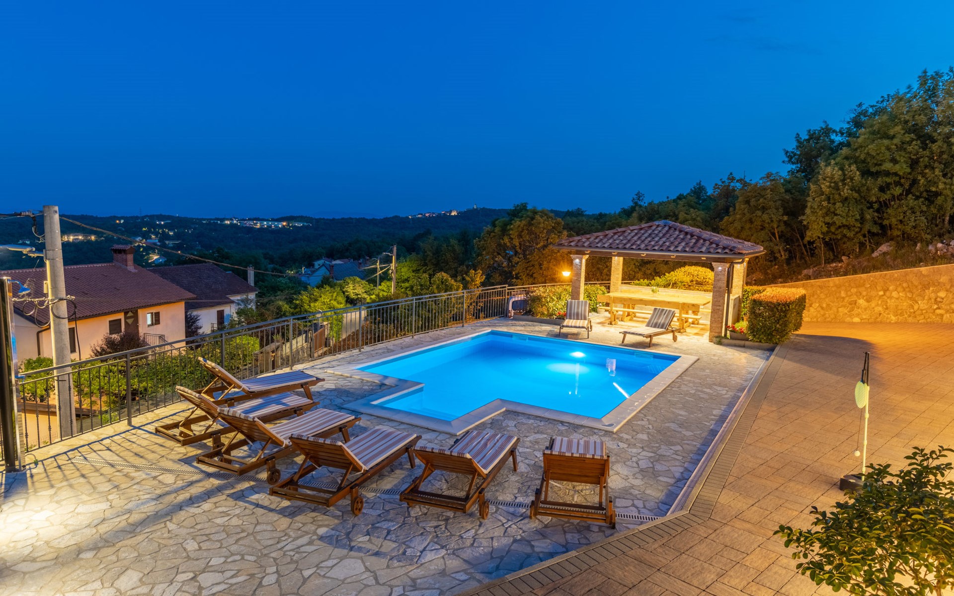 Einfamilienhaus "Villa Toni", auf 3 Stockwerken. 2 km vom Zentrum von Kastav, 7 km vom Zentrum von Opatija, 10 km vom Zentrum von Lovran, 7 km vom Meer. Zur Alleinbenutzung: Grundstück 2'000 m2 (eingezäunt) mit Bäumen, Schwimmbad beheizt (5 x 5 m, 29 m2, 150 cm tief, saisonale Verfügbarkeit: 20.Apr. - 12.Okt.) mit Innentreppe und Salzelektrolyse-Reinigungssystem. Aussendusche, Laube, Terrasse (100 m2), Gartenmöbel, Grill. Im Hause: Internetzugang, Billard, Waschmaschine. 20 m Fussweg bis zum Haus. Parkplatz (für 5 Autos) auf dem Grundstück, Einzelgarage. Einkaufsgeschäft 1 km, Bushaltestelle 600 m, Kieselstrand 7 km, Felsstrand 7 km. Jugendgruppen nur auf Anfrage. Schwimmbad beheizt (extra). Bitte teilen Sie uns mindestens 7 Tage vor Anreise mit, ob eine Poolheizung erforderlich ist.